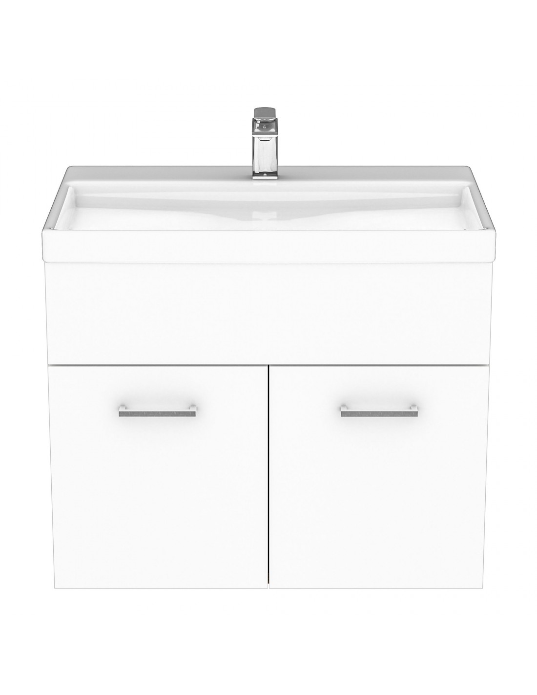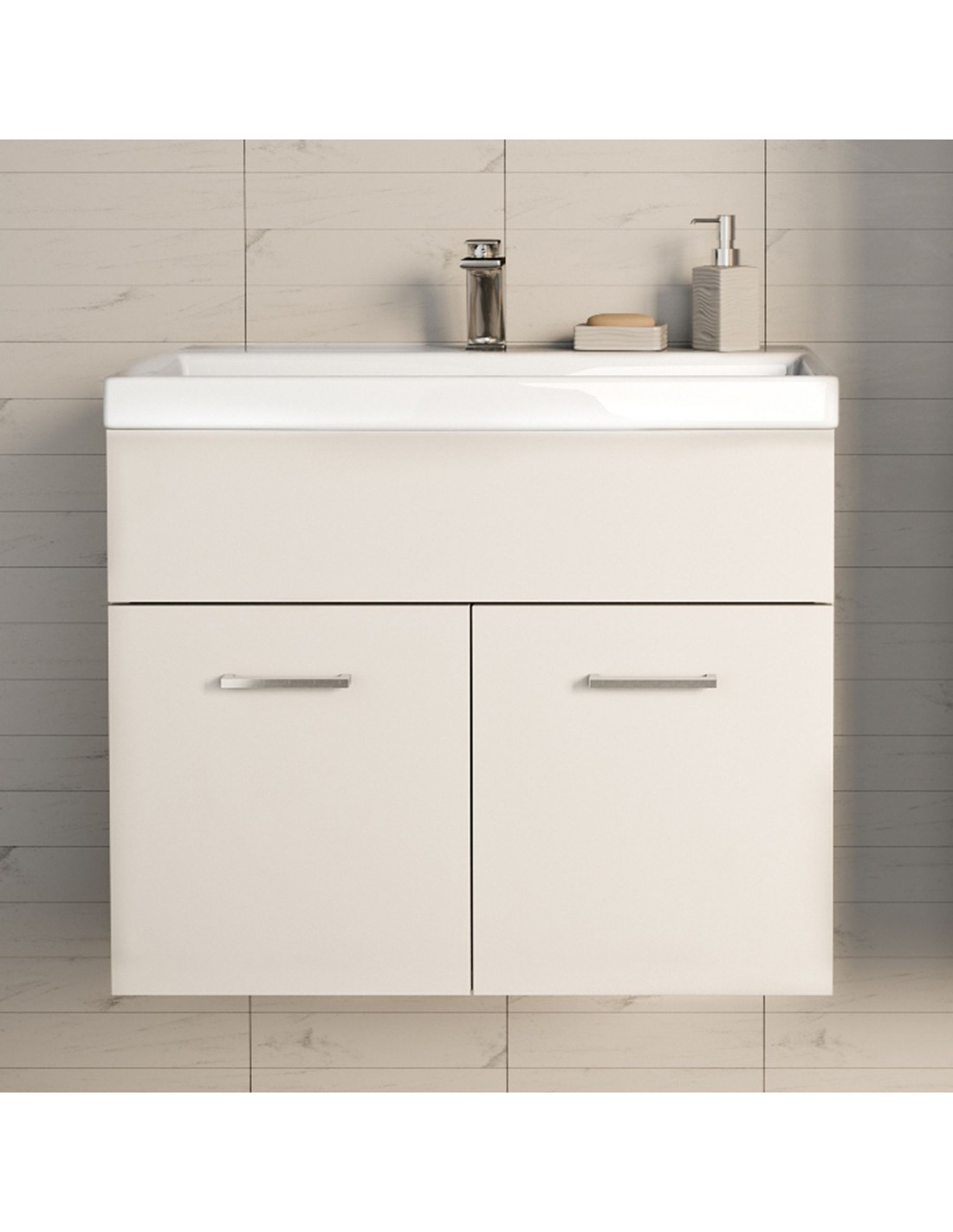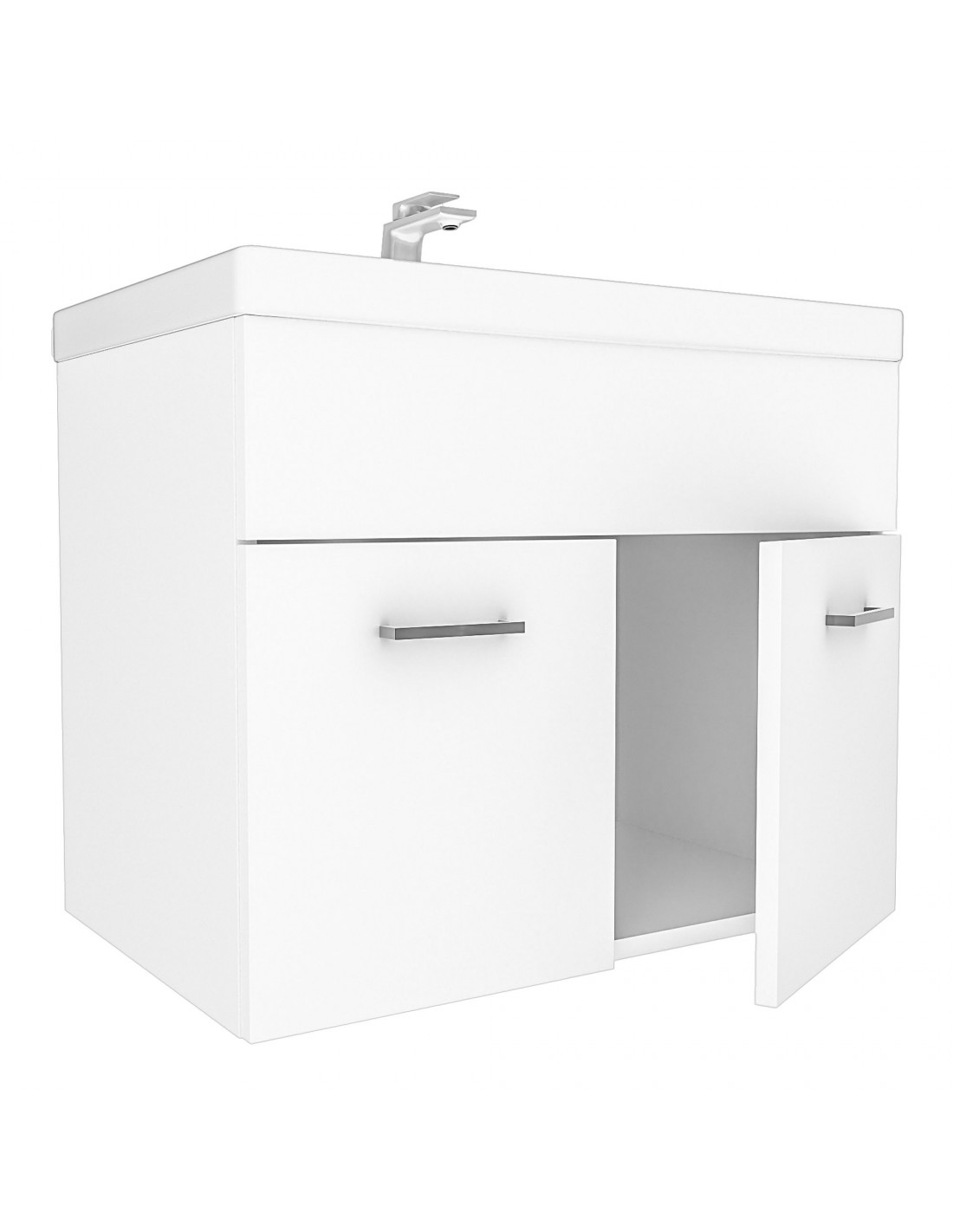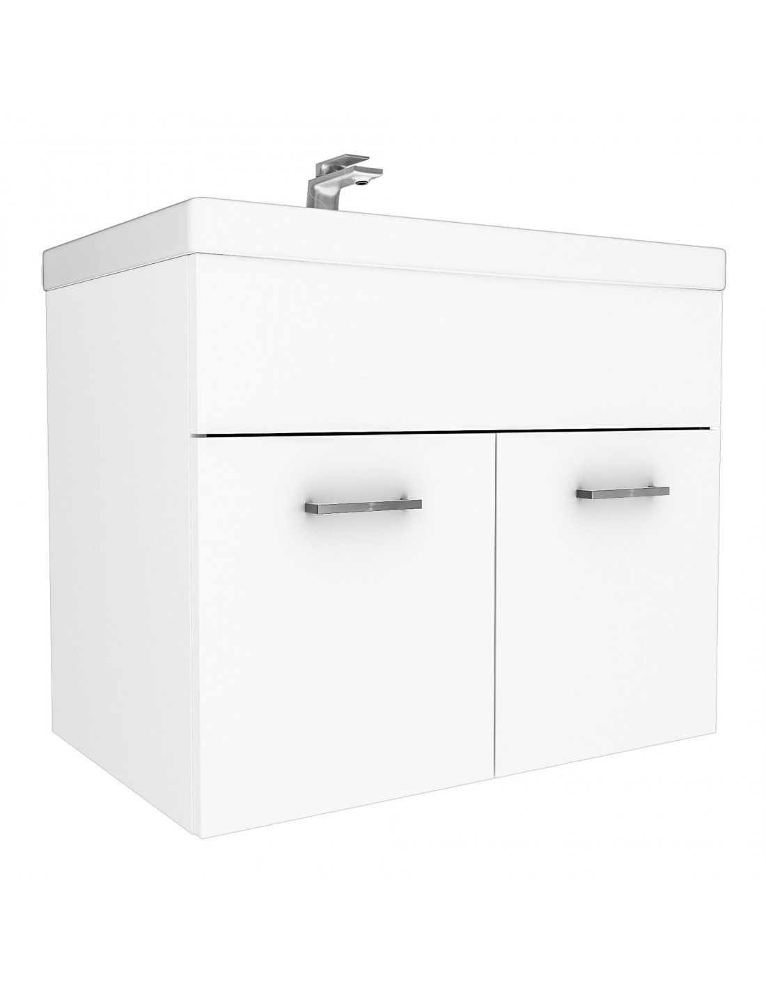 HANA Komplet badmiljø i et design af hvid møbelplade med håndvask i hvid keramik. Sættet måler 49,5 cm i højden og 61 x 40 cm i bredde og dybde og indeholder 2 skabslåger med 1 opbevaringsrum bag. Håndvasken er med overløb og hanehul. Afløbshul i håndvasken måler 4,5 cm og er EU standardmål og passer derfor sammen med flest bundventiler på markedet. Hanehullet i håndvasken måler Ø3,5 cm.