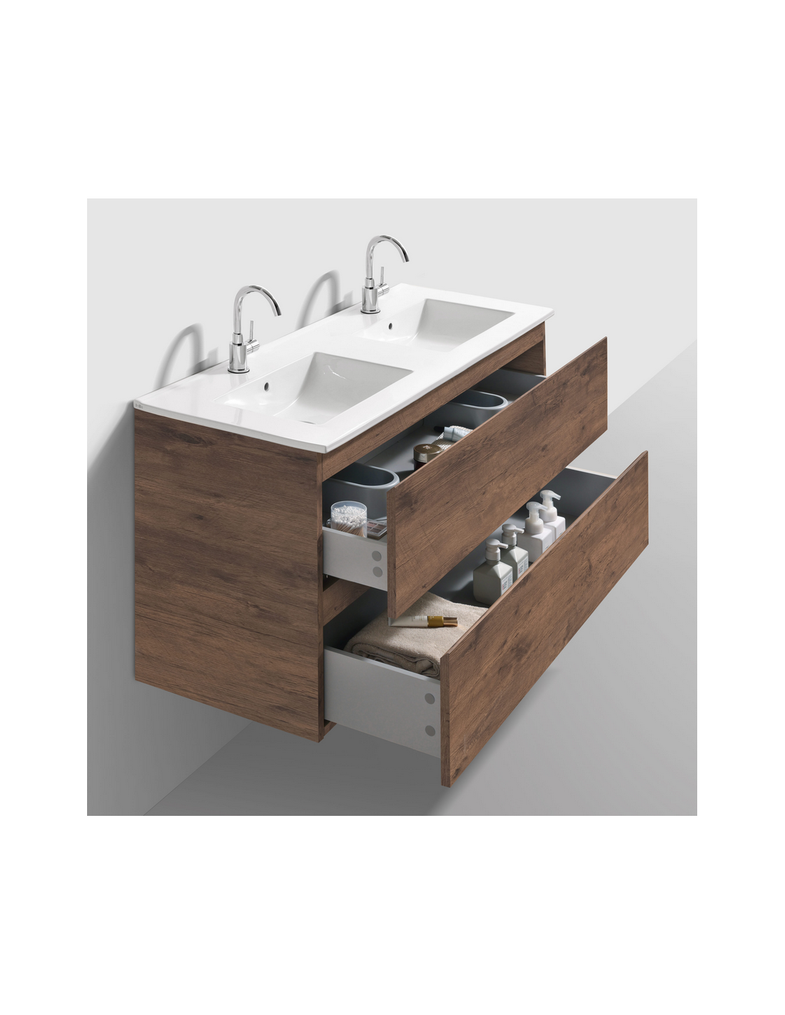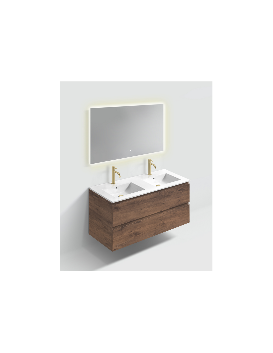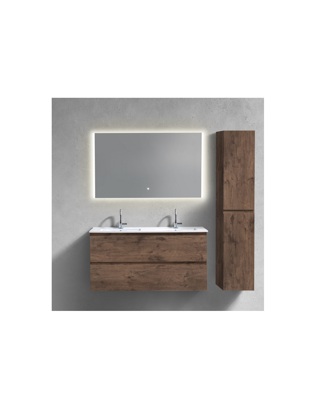 INBE Komplet badmiljø udført i et Skandinavisk design af mørk egetræsfarvet melamin med dobbelt håndvask i hvid keramik. Til badmiljøet medfølger også badeværelsesspejl med lys og touchfunktion. Badmiljøet måler 61,8 cm i højden og 121 x 46,5 cm i bredde og dybde og indeholder 2 grebsfri skuffer og softclose funktion. I håndvasken er der overløbshul og hanehuller (viste armaturer medfølger ikke).