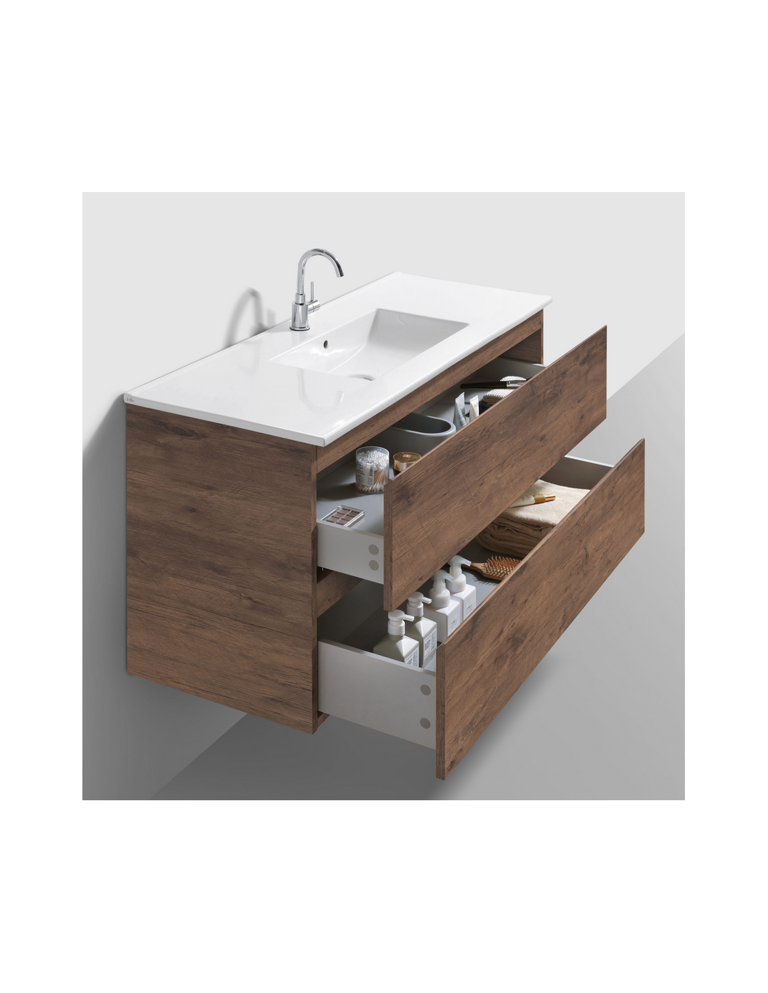 INBE Komplet badmiljø udført i et Skandinavisk design af mørk egetræsfarvet melamin med håndvask i hvid keramik. Til badmiljøet medfølger også badeværelsesspejl med lys og touchfunktion. Badmiljøet måler 61,8 cm i højden og 121 x 46,5 cm i bredde og dybde og indeholder 2 grebsfri skuffer og softclose funktion. I håndvasken er der overløbshul og hanehul (vist armatur medfølger ikke).