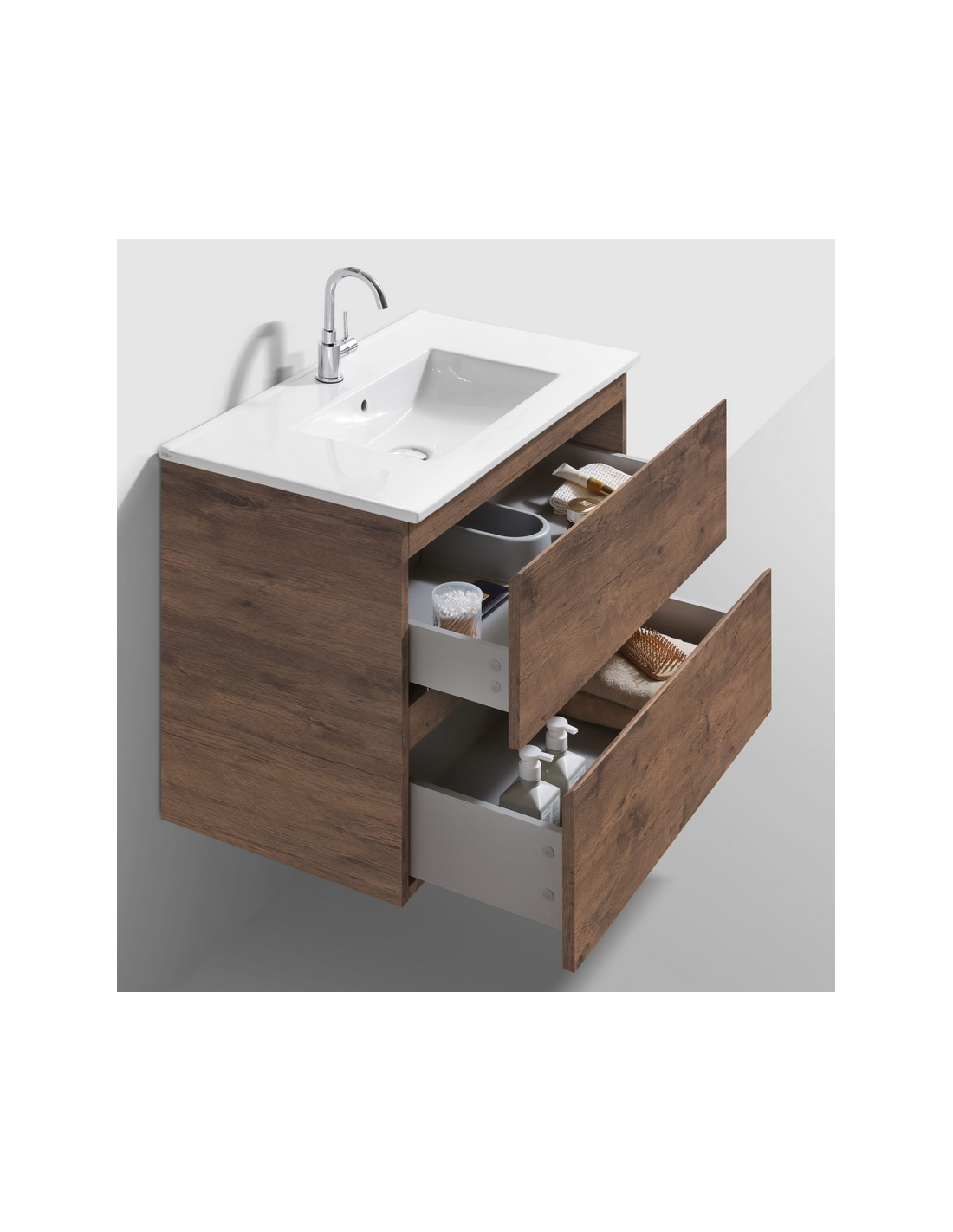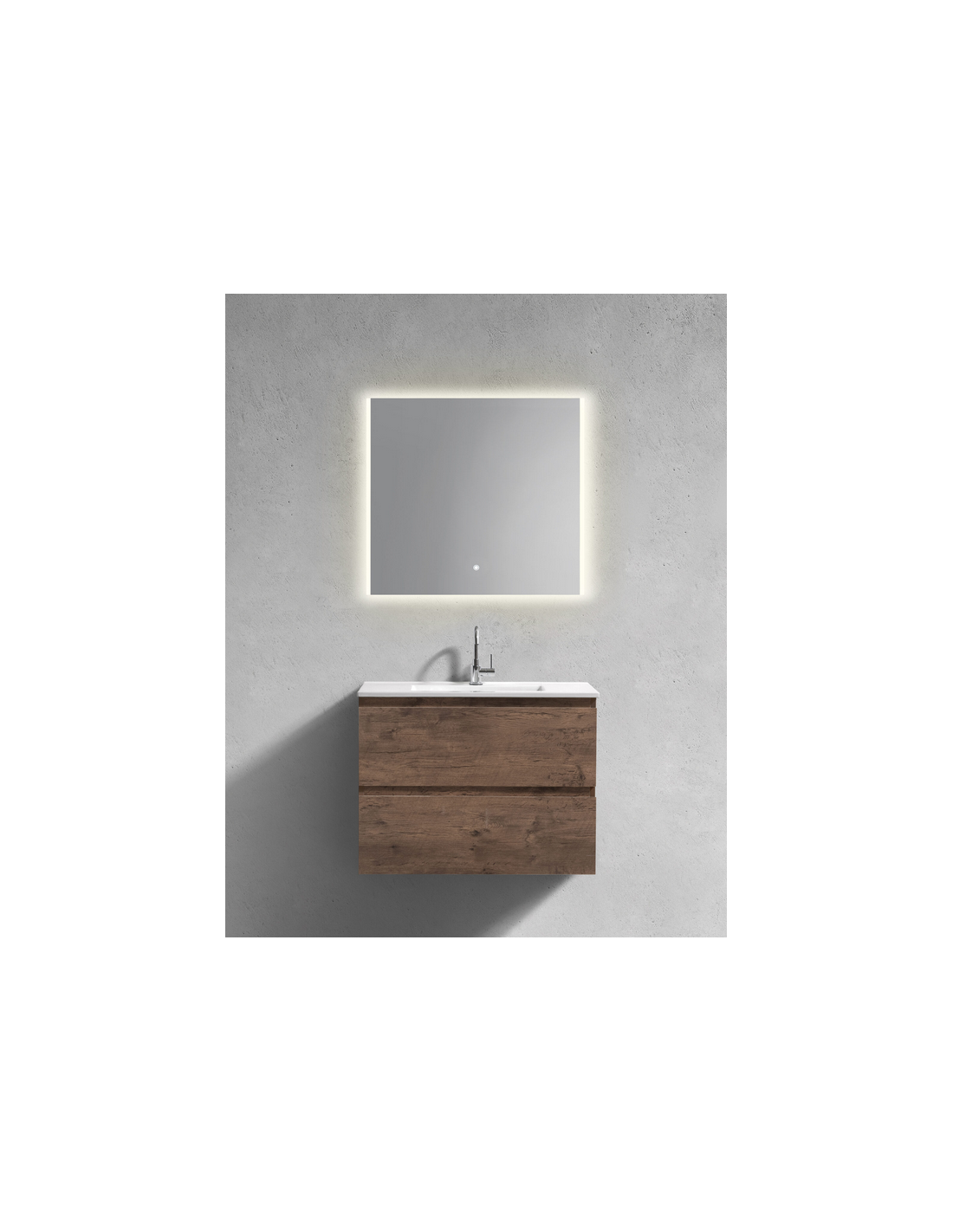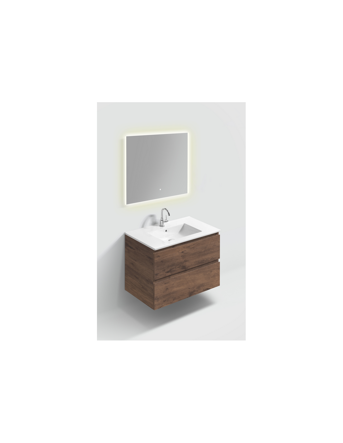 INBE Komplet badmiljø udført i et Skandinavisk design af mørk egetræsfarvet melamin med håndvask i hvid keramik. Til badmiljøet medfølger også badeværelsesspejl med lys og touchfunktion. Badmiljøet måler 61,8 cm i højden og 81 x 46,5 cm i bredde og dybde og indeholder 2 grebsfri skuffer og softclose funktion. I håndvasken er der overløbshul og hanehul (vist armatur medfølger ikke).