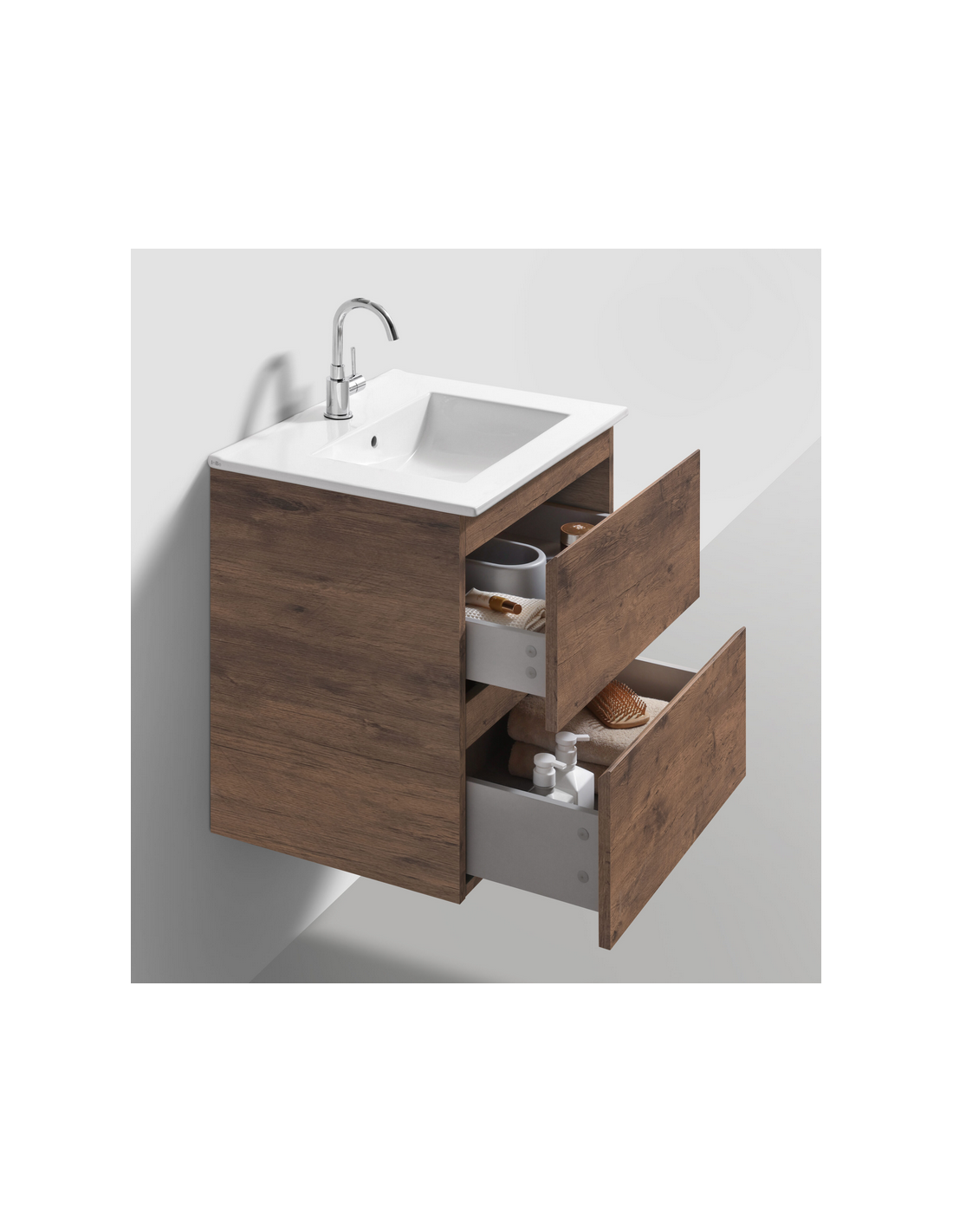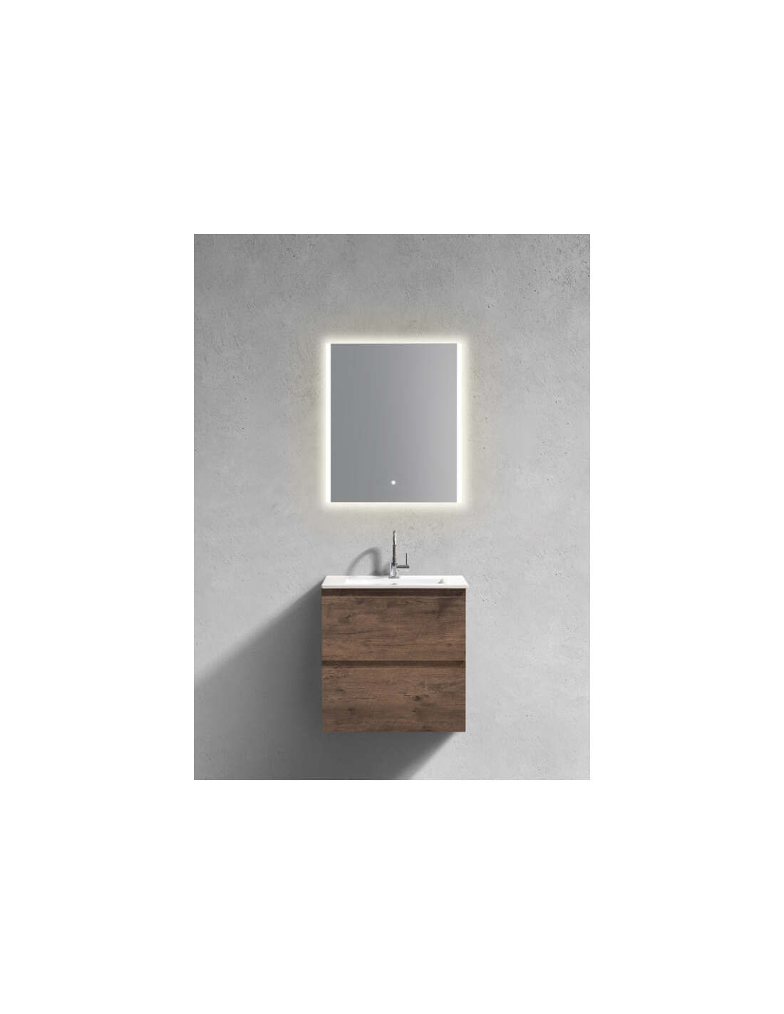 INBE Komplet badmiljø udført i et Skandinavisk design af mørk egetræsfarvet melamin med håndvask i hvid keramik. Til badmiljøet medfølger også badeværelsesspejl med lys og touchfunktion. Badmiljøet måler 61,8 cm i højden og 61 x 46,5 cm i bredde og dybde og indeholder 2 grebsfri skuffer og softclose funktion. I håndvasken er der overløbshul og hanehul (vist armatur medfølger ikke).