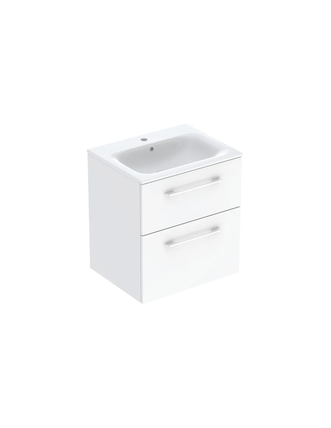 Komplet badmiljø i et design af mat hvid møbelplade med håndvask i hvid keramik. Sættet måler 65,2 cm i højden og 60 x 50,2 cm i bredde og dybde og indeholder 2 skuffer med soft-close funktion. Håndvasken er med overløb og hanehul. Afløbshul i håndvasken måler 4,5 cm og er EU standardmål og passer derfor sammen med bundventiler på markedet. Hanehullet i håndvasken måler Ø3,5 cm.