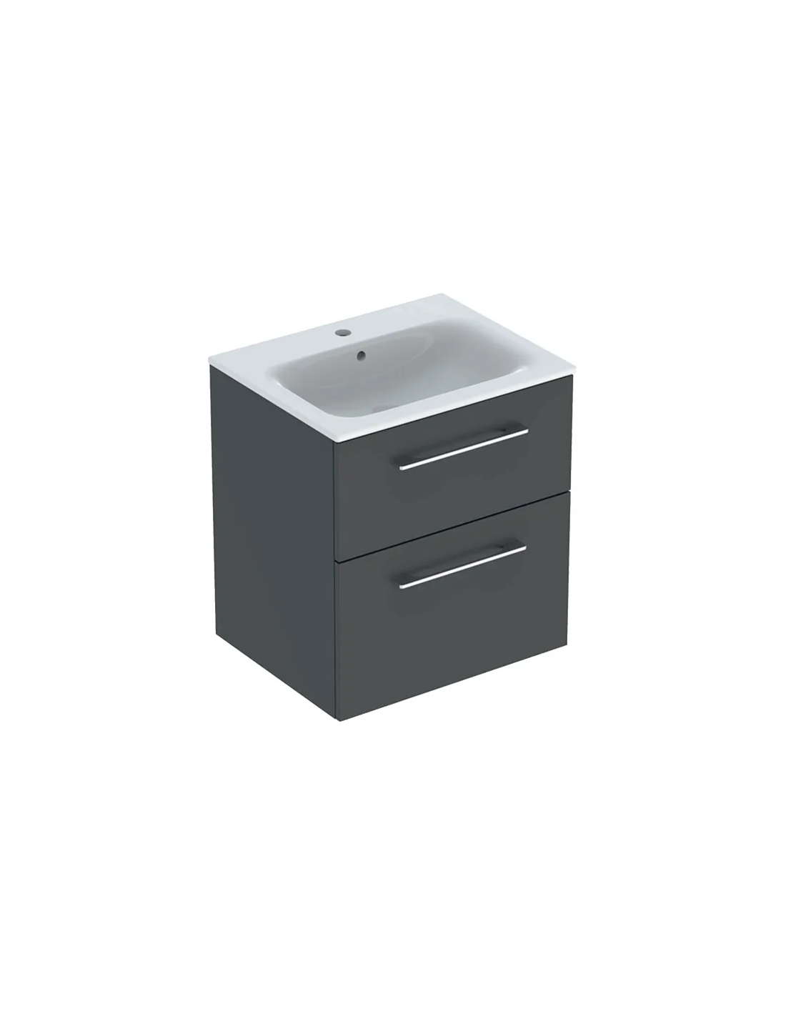 Komplet badmiljø i et design af mat grå møbelplade med håndvask i hvid keramik. Sættet måler 65,2 cm i højden og 60 x 50,2 cm i bredde og dybde og indeholder 2 skuffer med soft-close funktion. Håndvasken er med overløb og hanehul. Afløbshul i håndvasken måler 4,5 cm og er EU standardmål og passer derfor sammen med bundventiler på markedet. Hanehullet i håndvasken måler Ø3,5 cm.