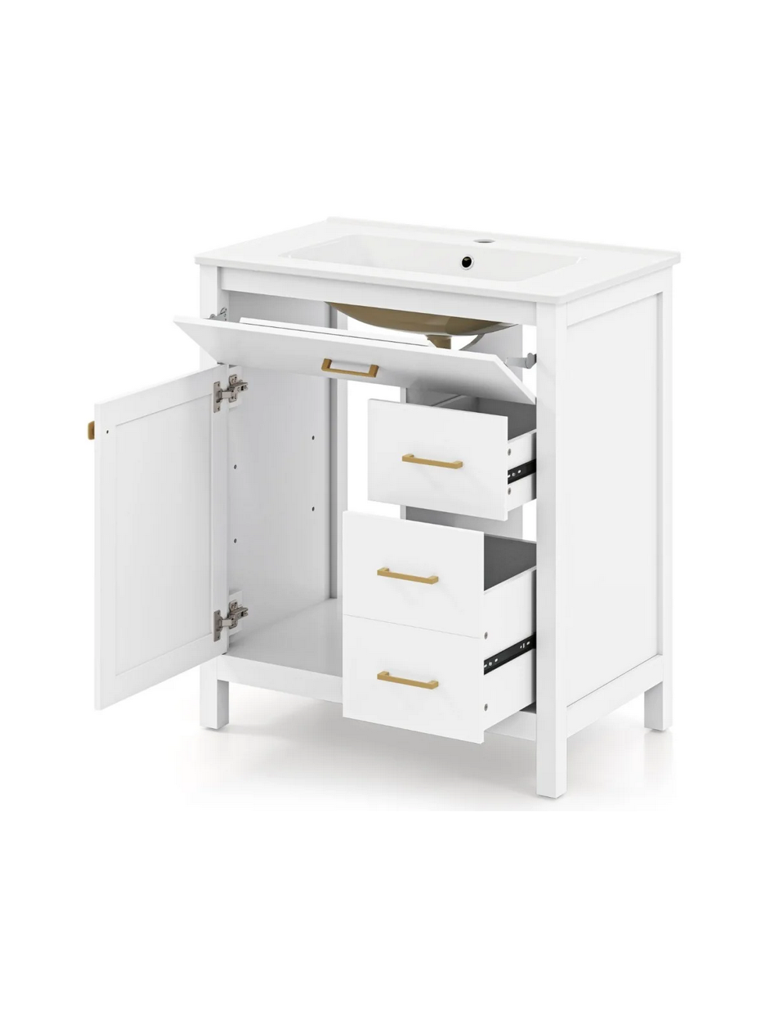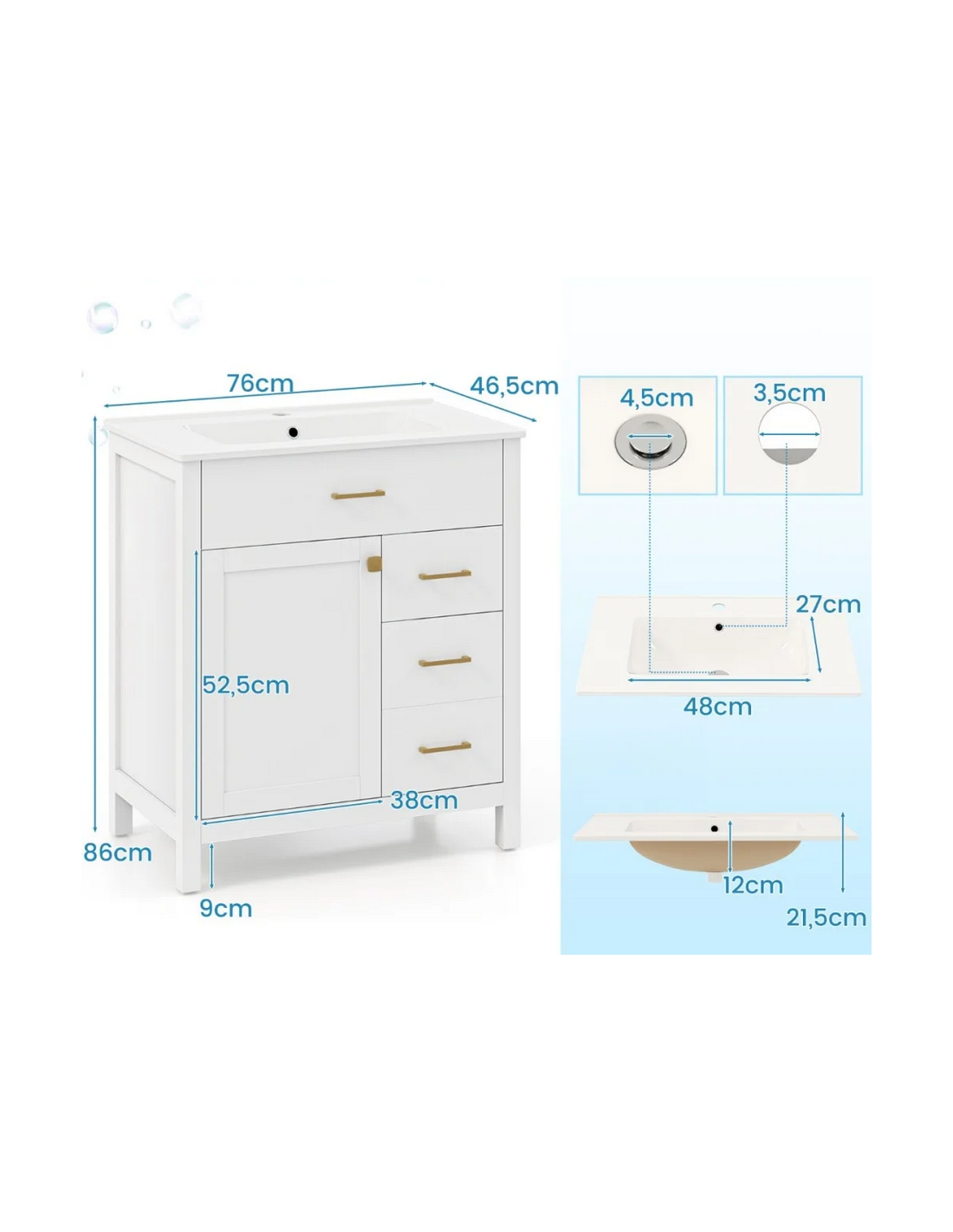 Komplet badmiljø i et design af mat hvid MDF med håndvask i hvid keramik. Sættet måler 86 cm i højden og 76 x 46,5 cm i bredde og dybde og indeholder 1 skab samt 3 skuffer. Håndvasken er med overløb og hanehul. Afløbshul i håndvasken måler 4,5 cm og er EU standardmål og passer derfor sammen med bundventiler på markedet. Hanehullet i håndvasken måler Ø3,5 cm.