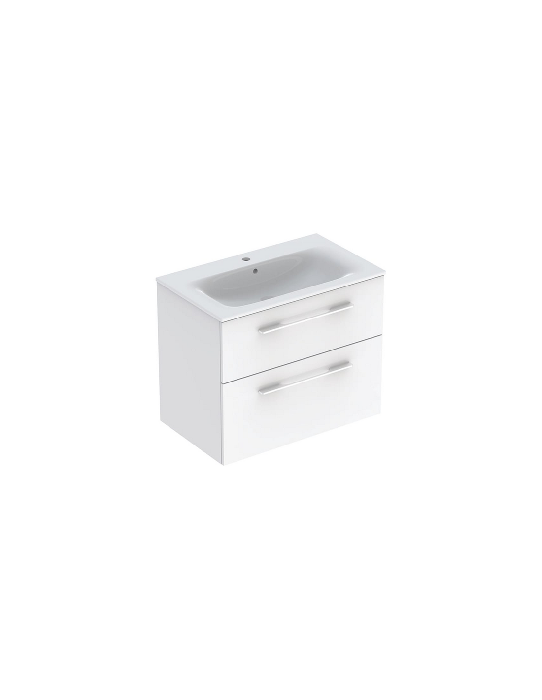 Komplet badmiljø i et design af mat hvid møbelplade med håndvask i hvid keramik. Sættet måler 65,2 cm i højden og 80 x 50,2 cm i bredde og dybde og indeholder 2 skuffer med soft-close funktion. Håndvasken er med overløb og hanehul. Afløbshul i håndvasken måler 4,5 cm og er EU standardmål og passer derfor sammen med bundventiler på markedet. Hanehullet i håndvasken måler Ø3,5 cm.