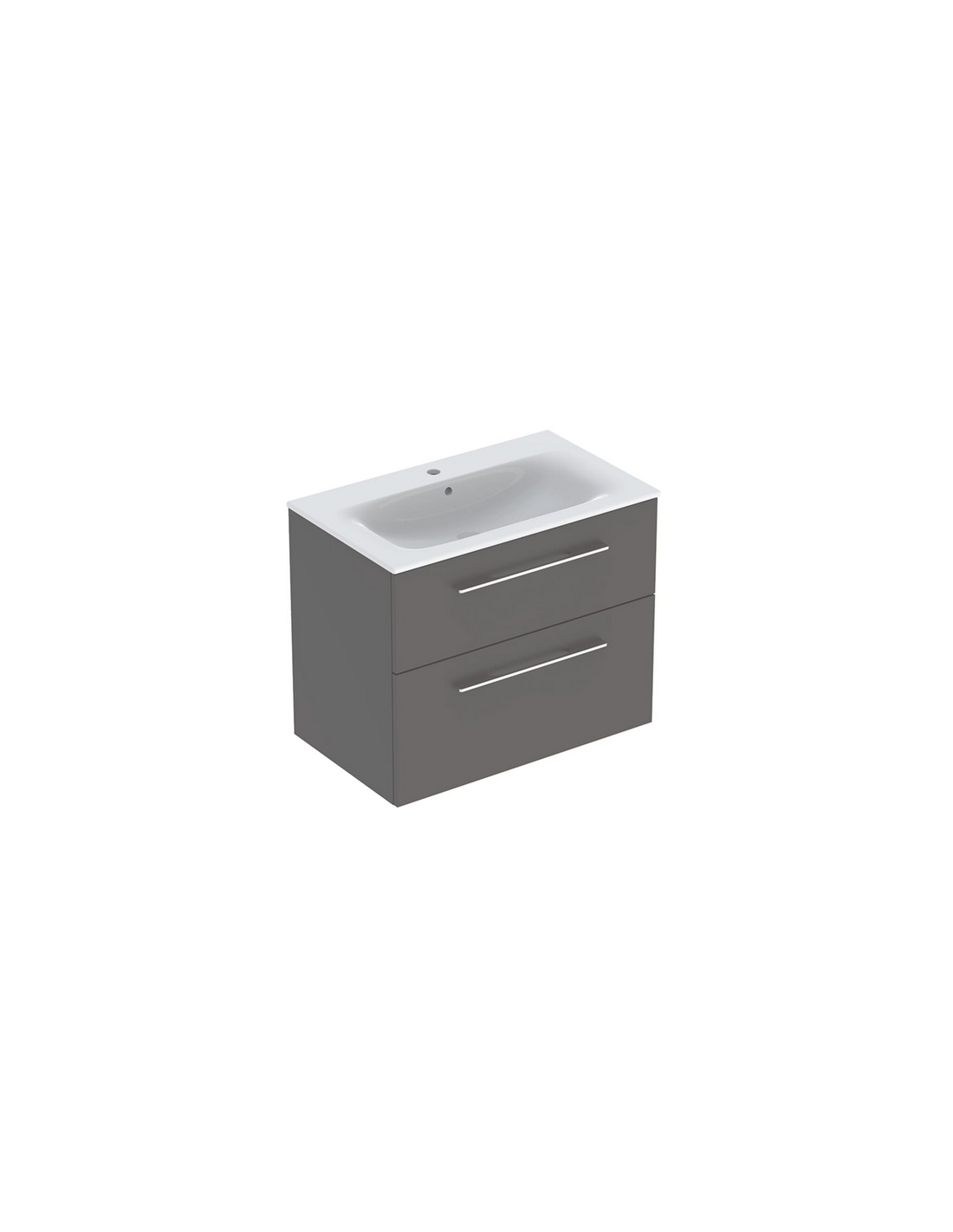 Komplet badmiljø i et design af mat grå møbelplade med håndvask i hvid keramik. Sættet måler 65,2 cm i højden og 80 x 50,2 cm i bredde og dybde og indeholder 2 skuffer med soft-close funktion. Håndvasken er med overløb og hanehul. Afløbshul i håndvasken måler 4,5 cm og er EU standardmål og passer derfor sammen med bundventiler på markedet. Hanehullet i håndvasken måler Ø3,5 cm.