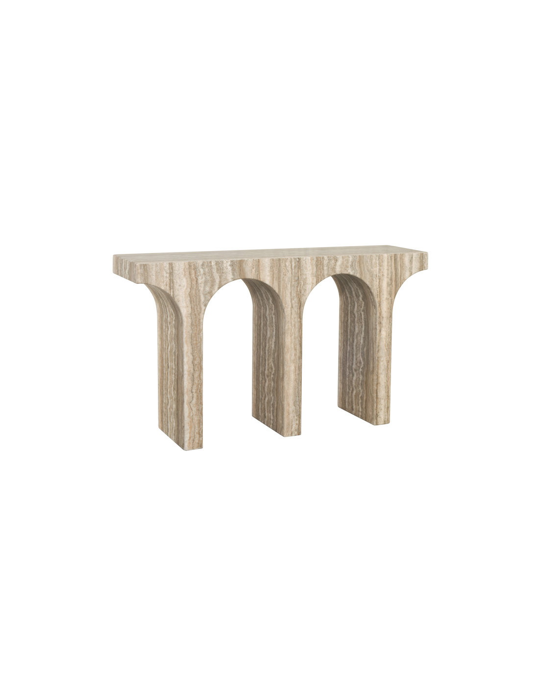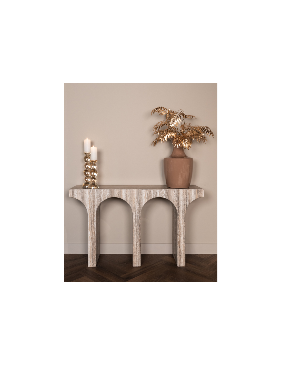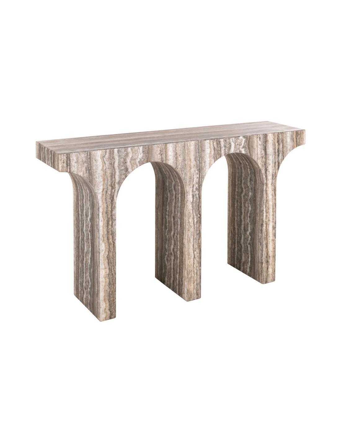 DULCE Konsolbord fra hollandske Richmond Interiors, udført i et design af grå travertinfarvet sten. Konsolbordet måler 80 cm i højden og 140 x 35 cm i bredde og dybde.