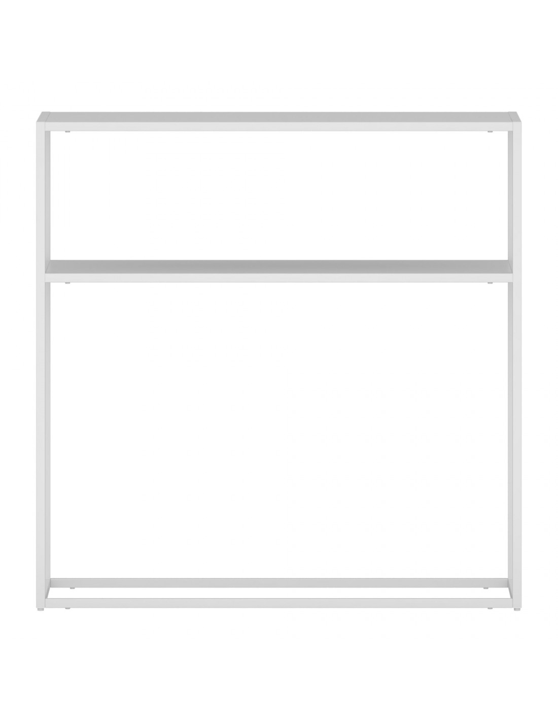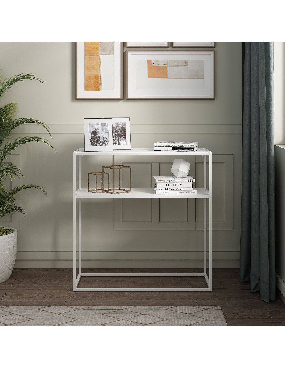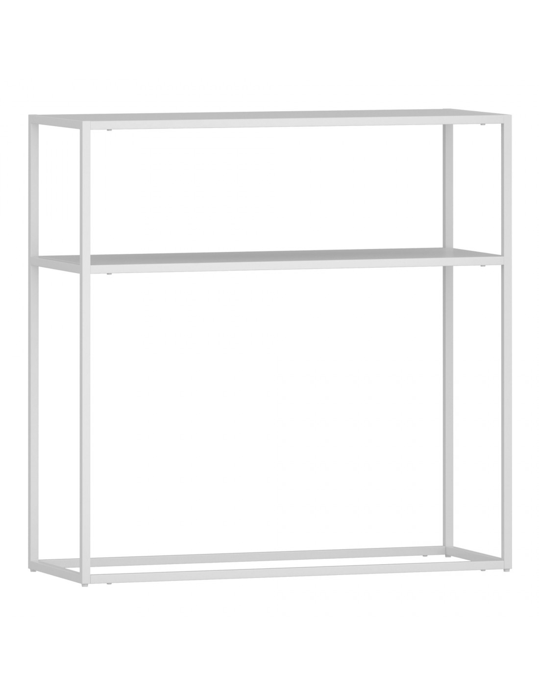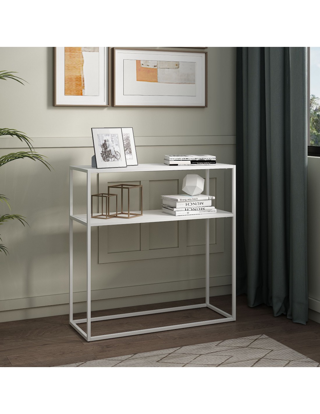 Konsolbord med hylde, udført i et design af hvidlakeret metal. Konsolbordet måler 80 cm i højden og 80 x 30 cm i bredde og dybde.