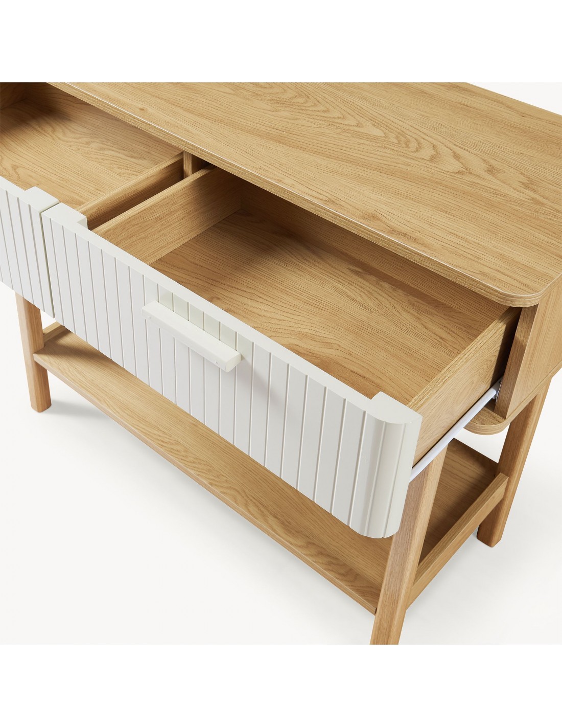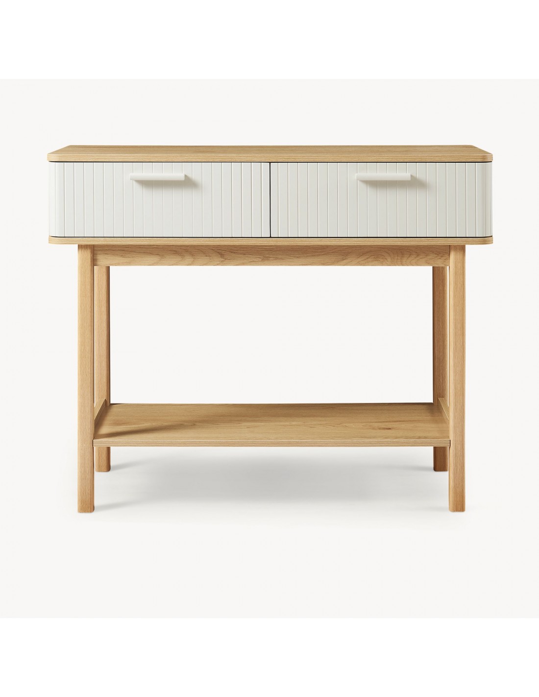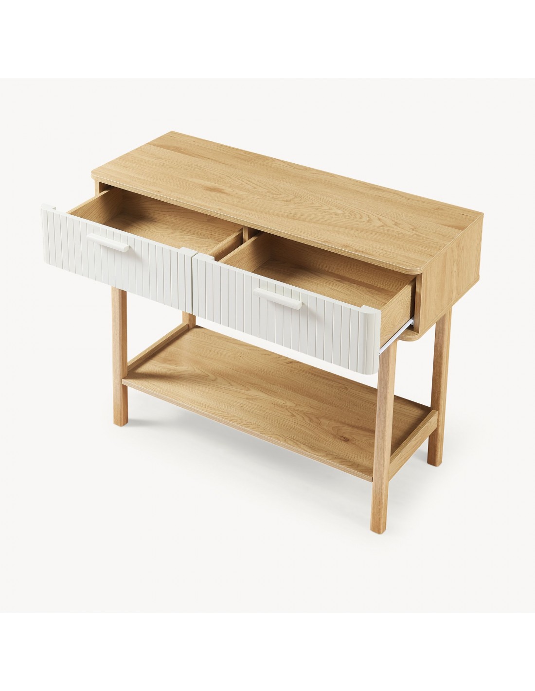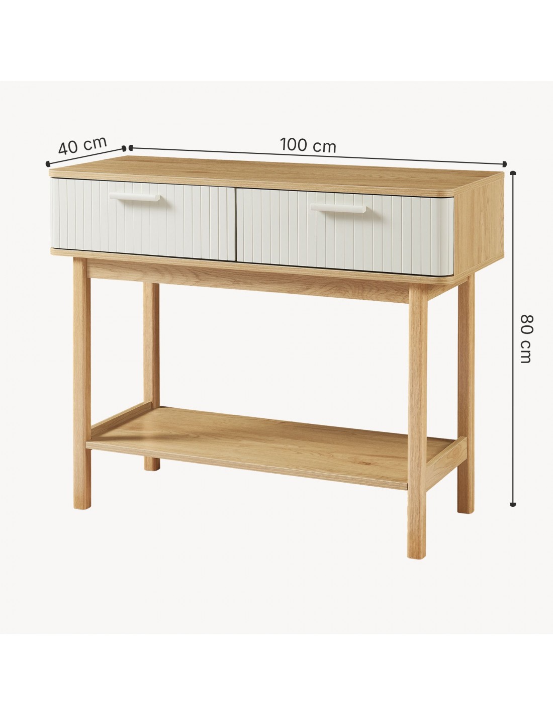 Konsolbord udført i et moderne og Skandinavisk design af egetræsfarvet fyrretræ og MDF og sandfarvet MDF. Konsolbordet har 2 skuffer og måler 80 cm i højden og 100 x 40 cm i bredde og dybde.