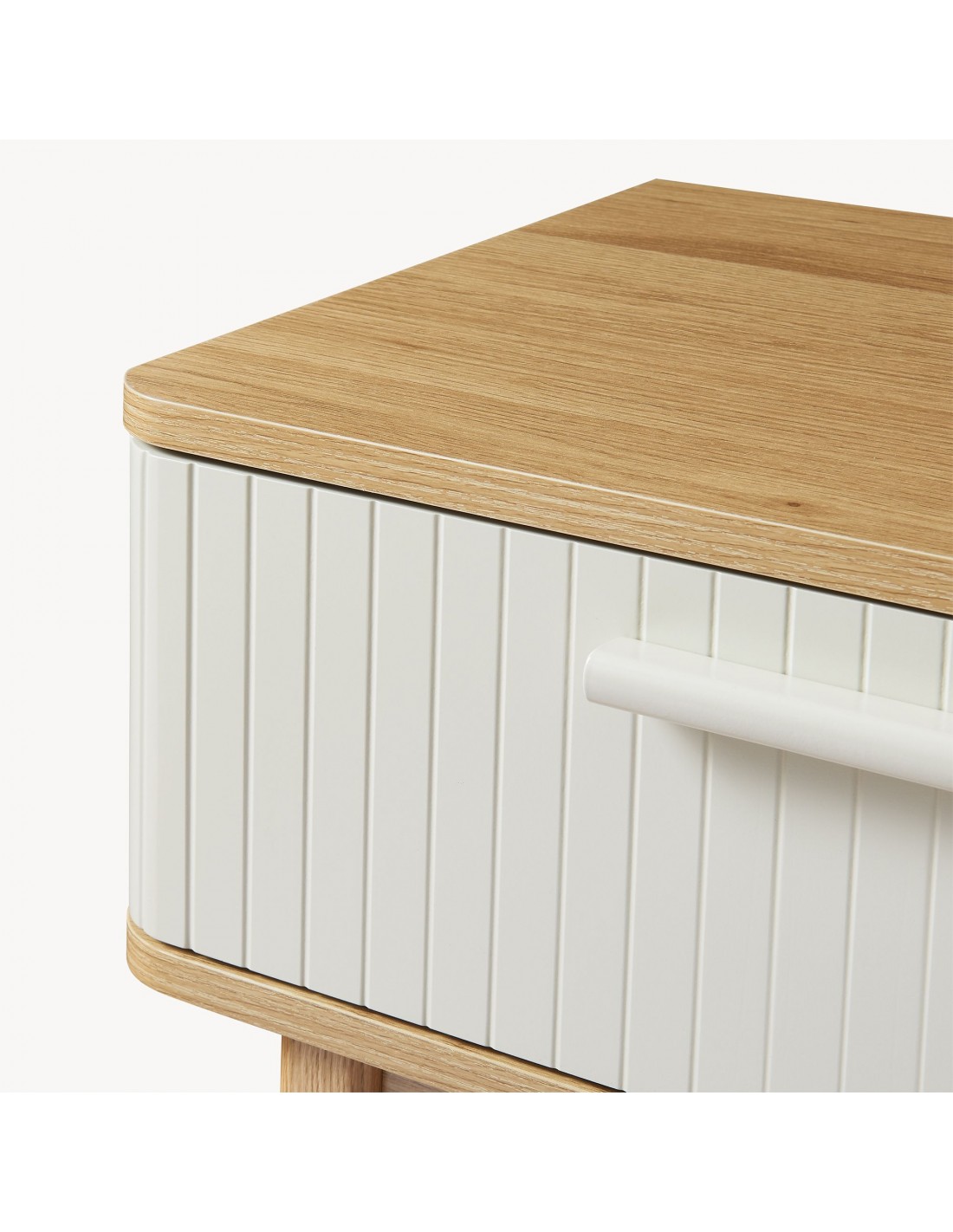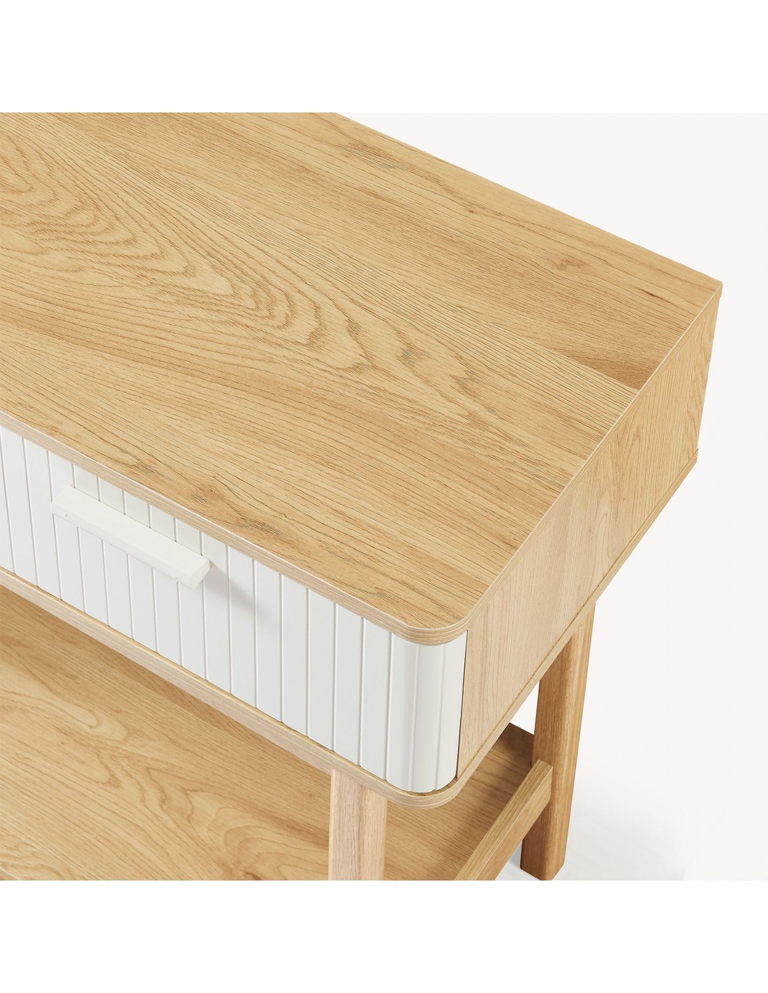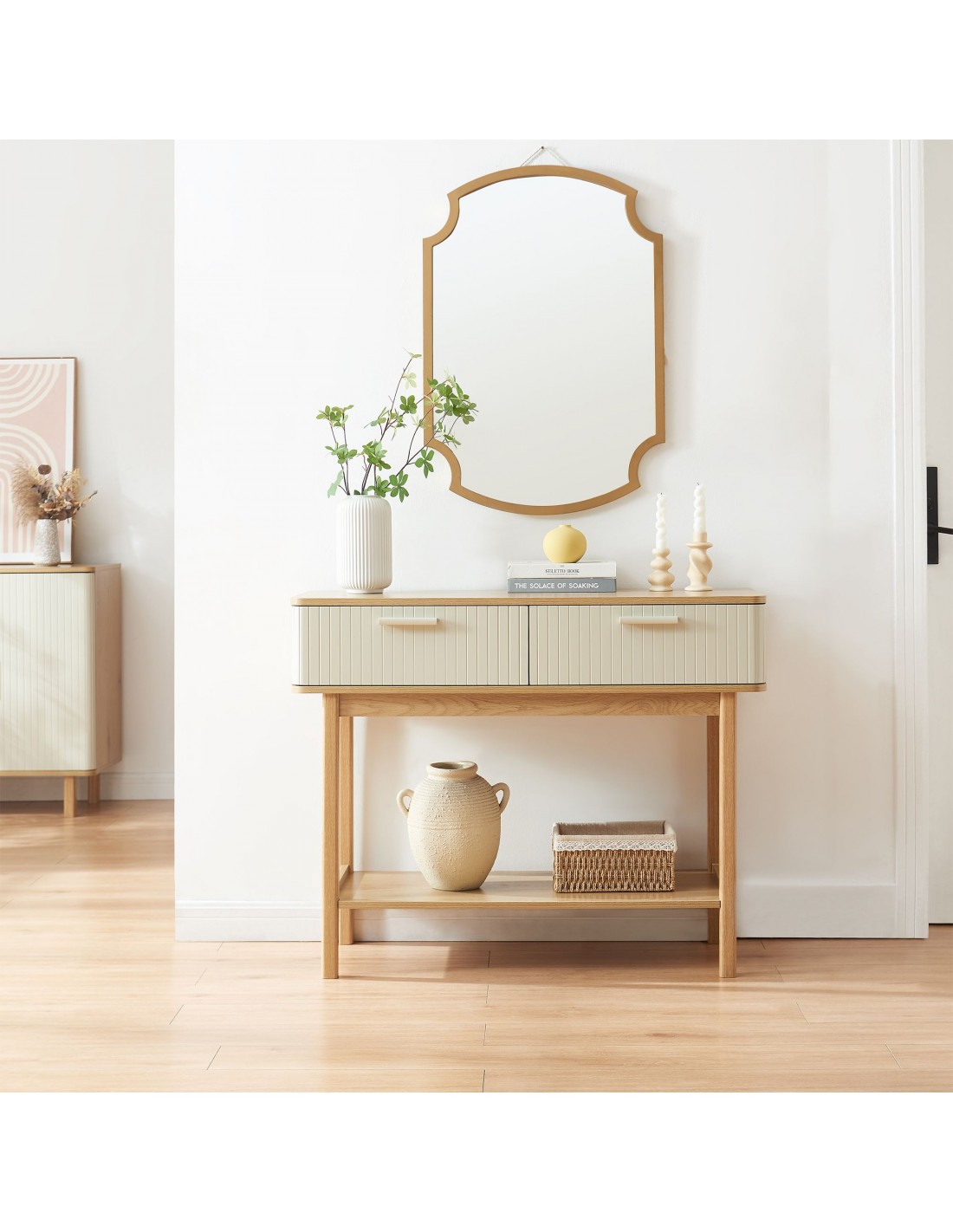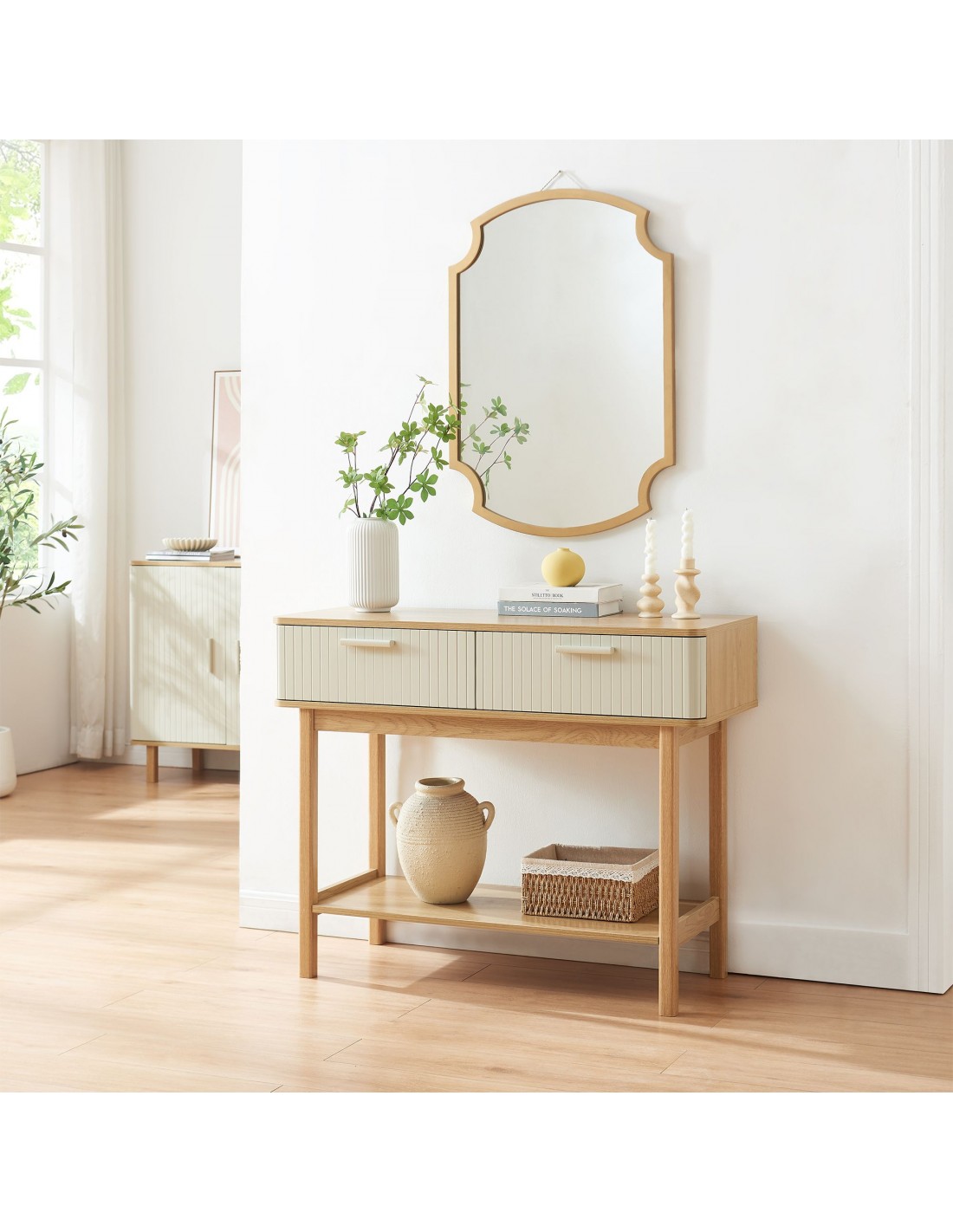 Konsolbord udført i et moderne og Skandinavisk design af egetræsfarvet fyrretræ og MDF og sandfarvet MDF. Konsolbordet har 2 skuffer og måler 80 cm i højden og 100 x 40 cm i bredde og dybde.