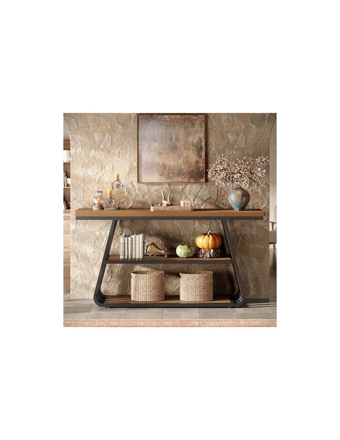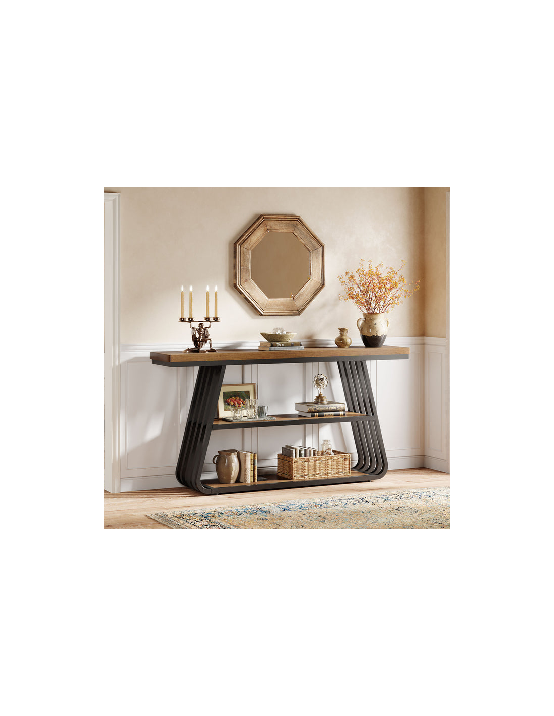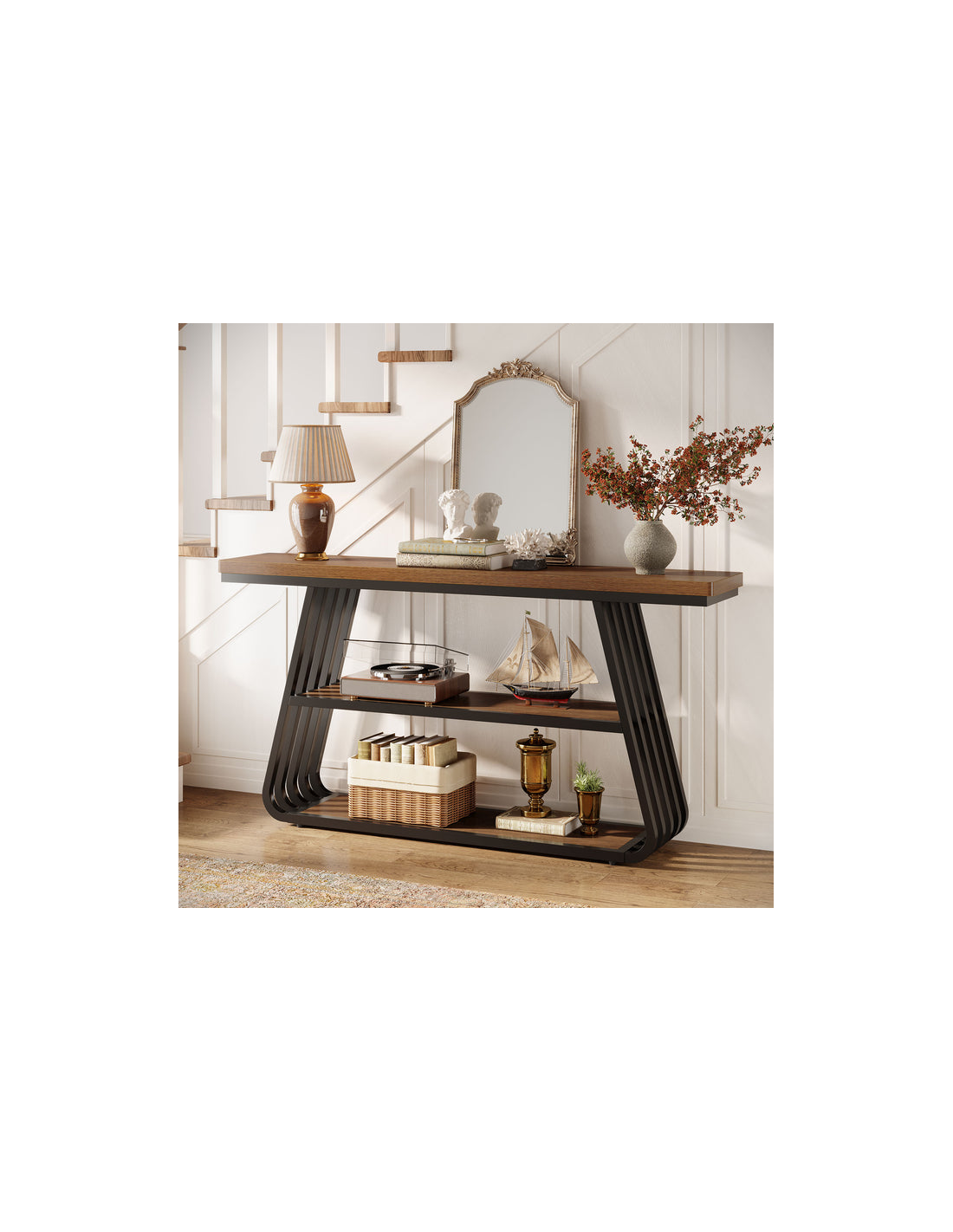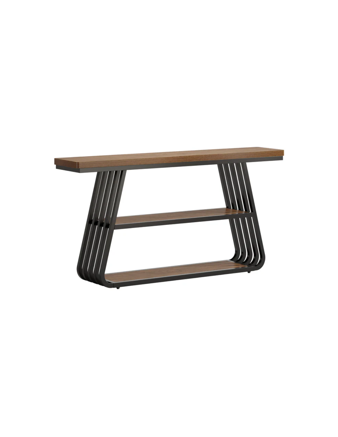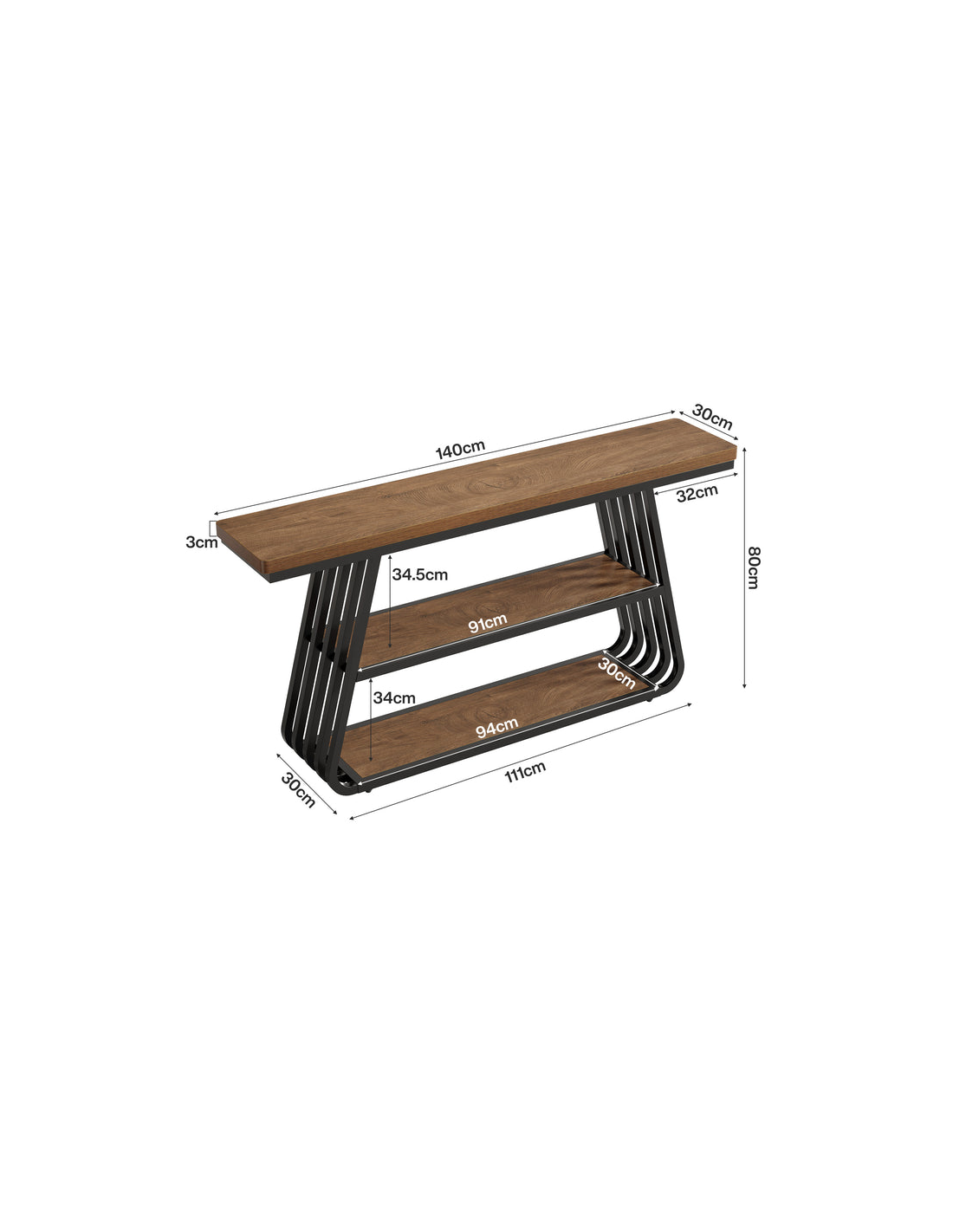 Konsolbord udført i et moderne design af sortlakeret metal og brun møbelplade. Konsolbordet måler 80 cm i højden og 140 x 30 cm i bredde og dybde.