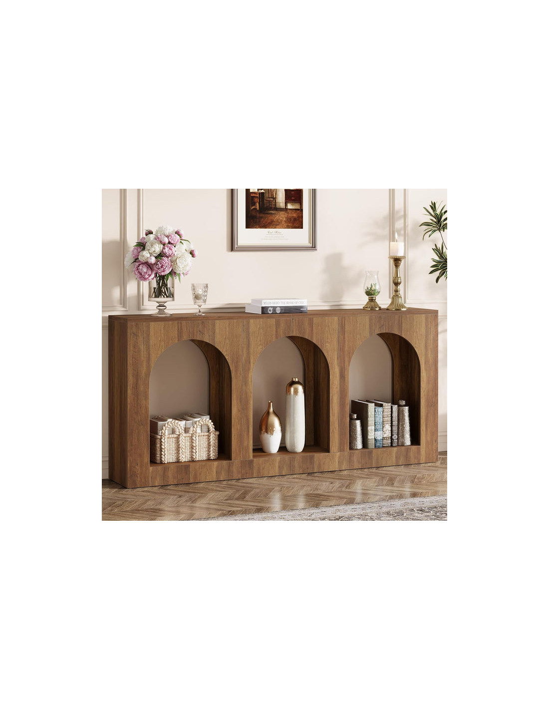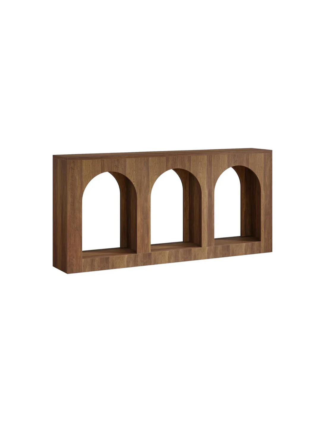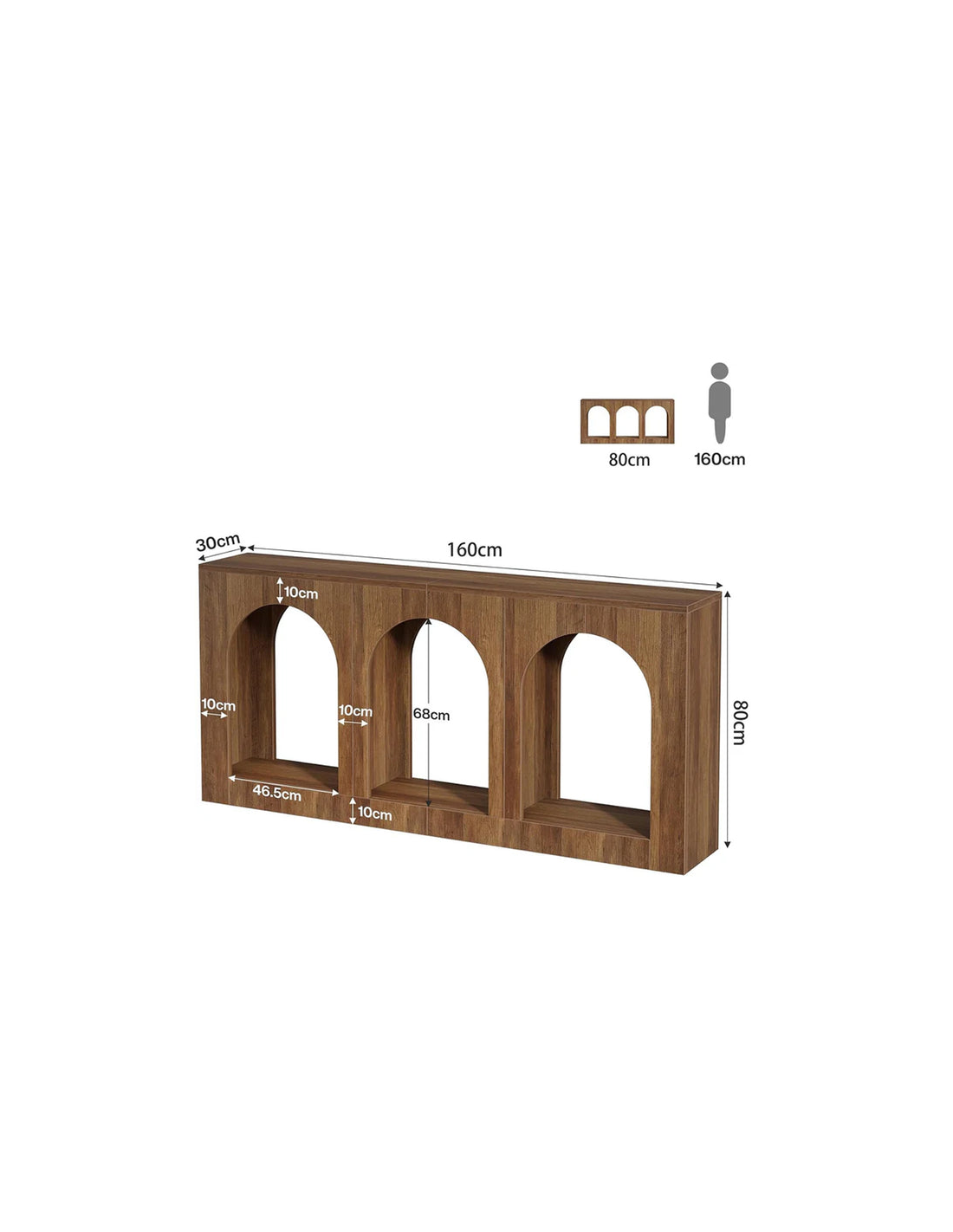 Konsolbord udført i et moderne design af brun MDF. Konsolbordet måler 80 cm i højden og 160 x 30 cm i bredde og dybde.