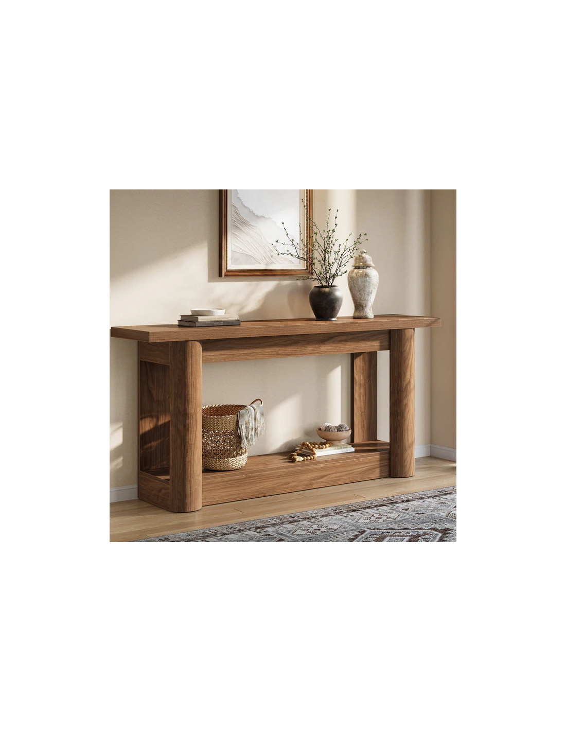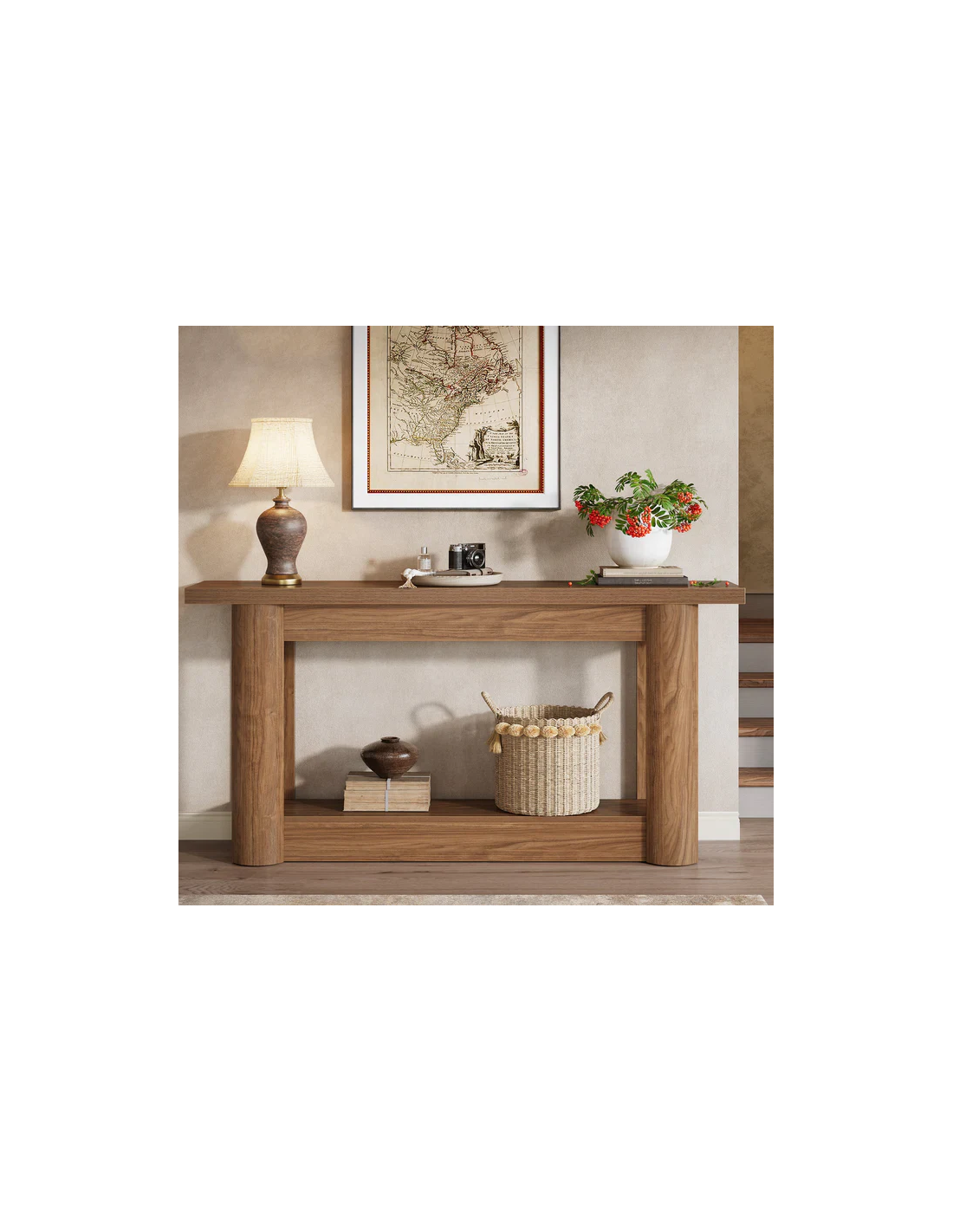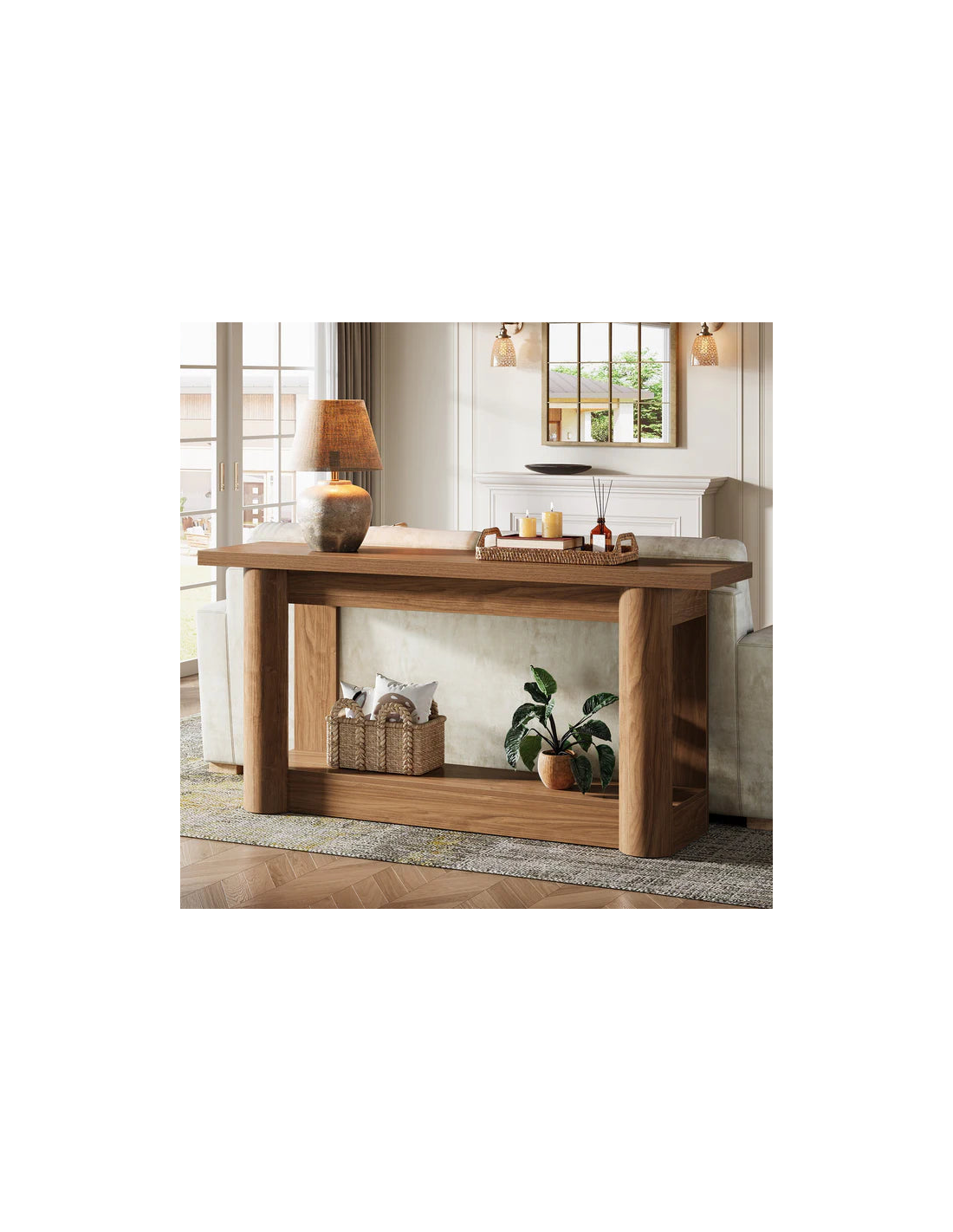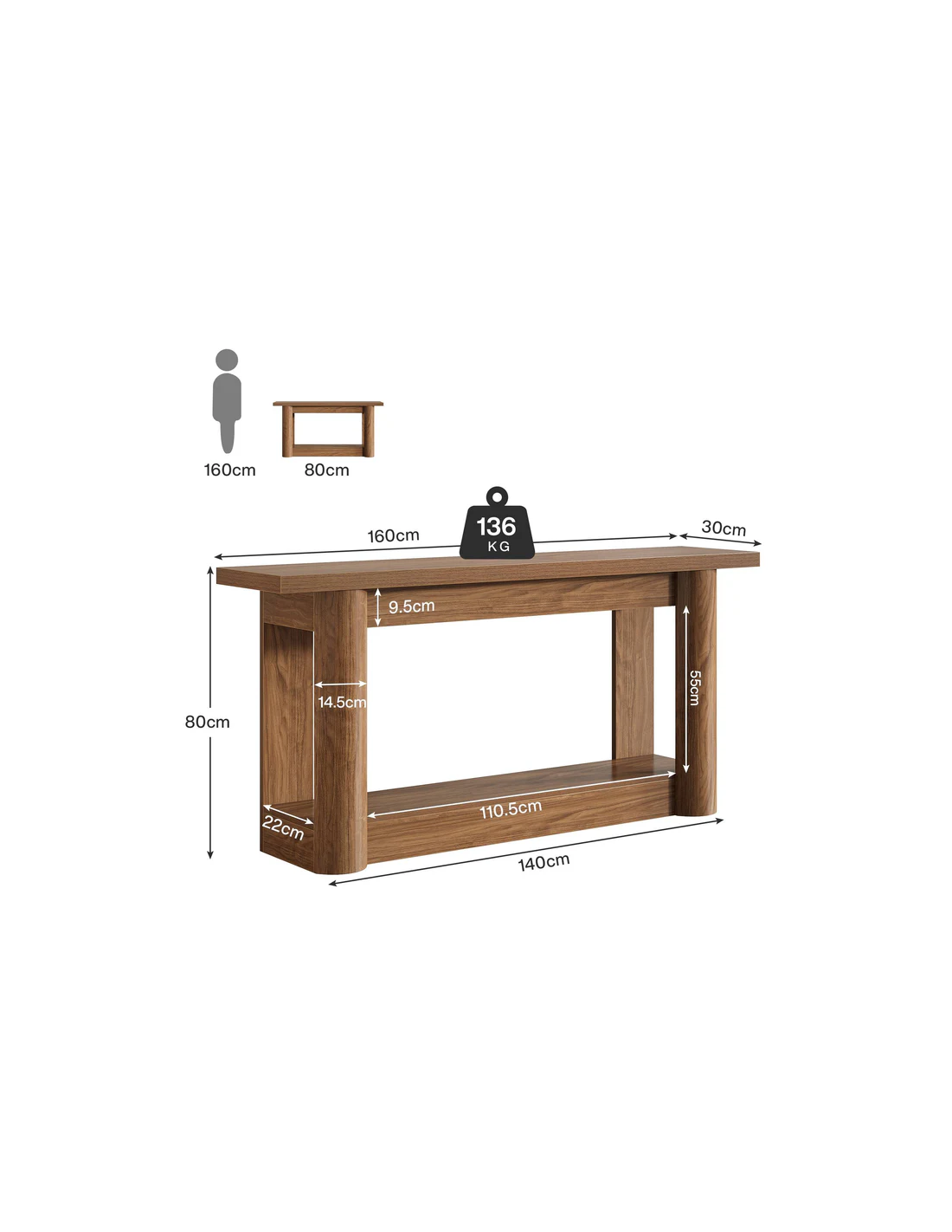 Konsolbord udført i et moderne design af naturbrun MDF. Konsolbordet måler 80 cm i højden og 160 x 30 cm i bredde og dybde.