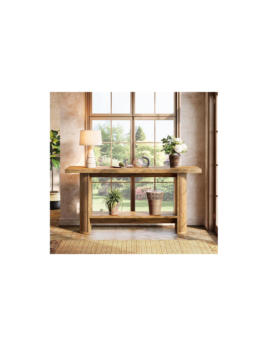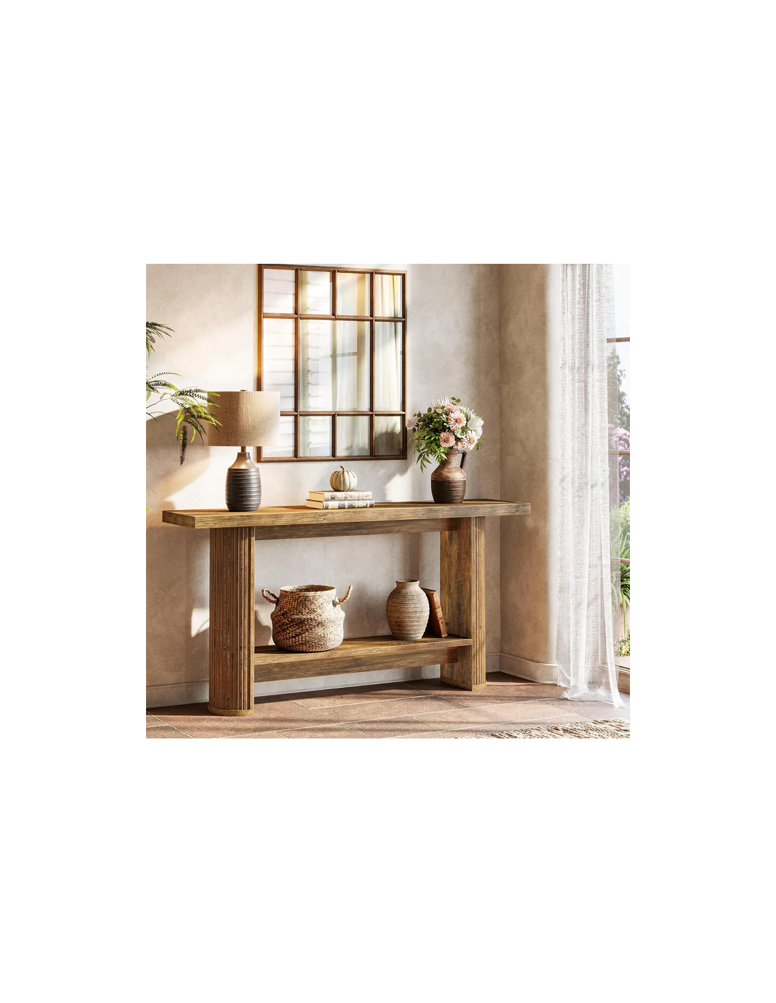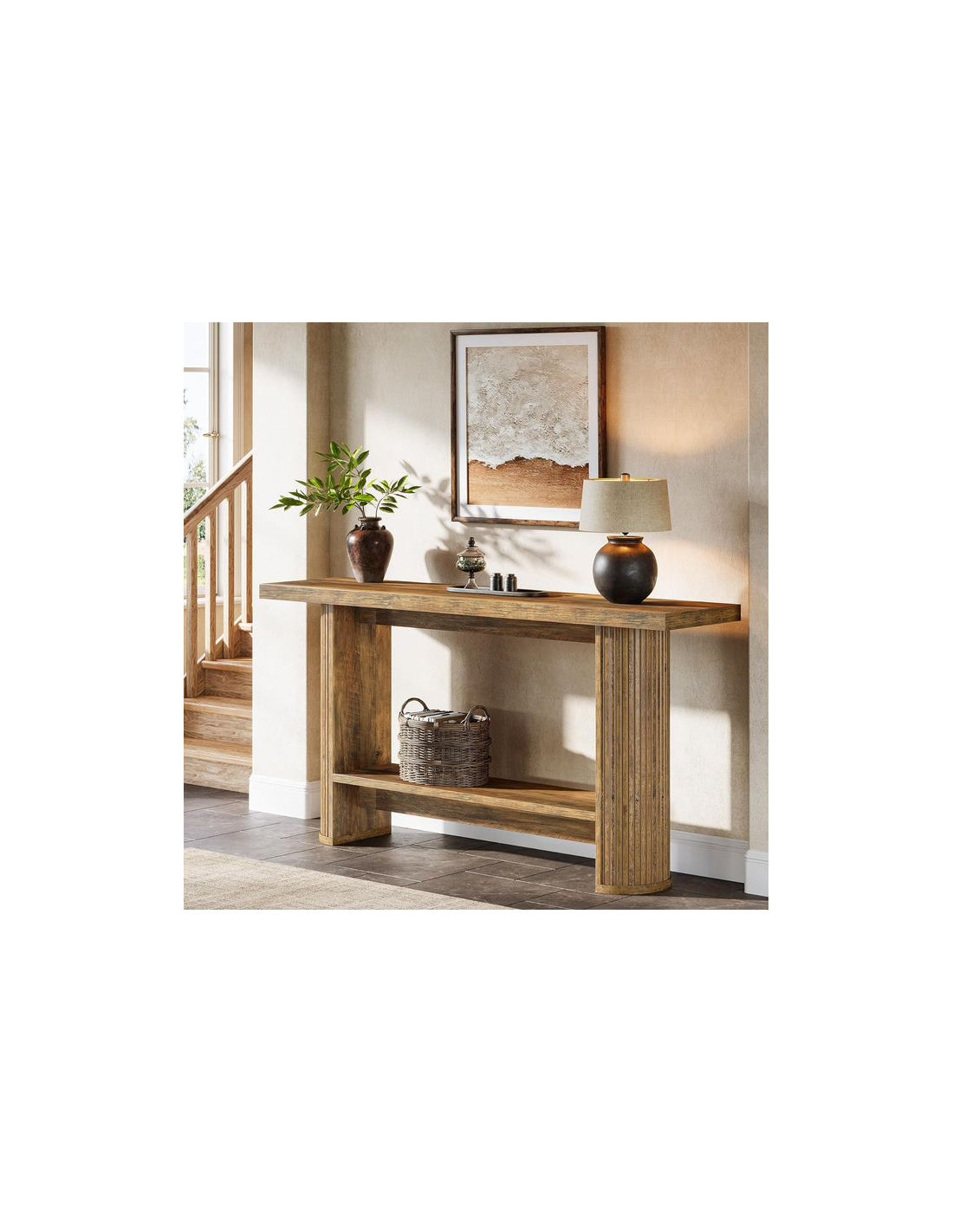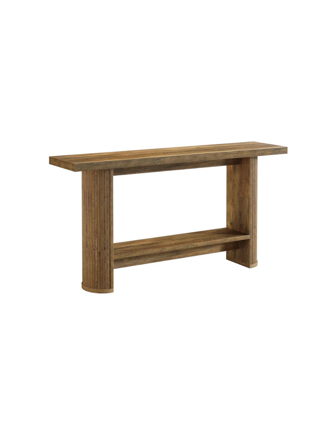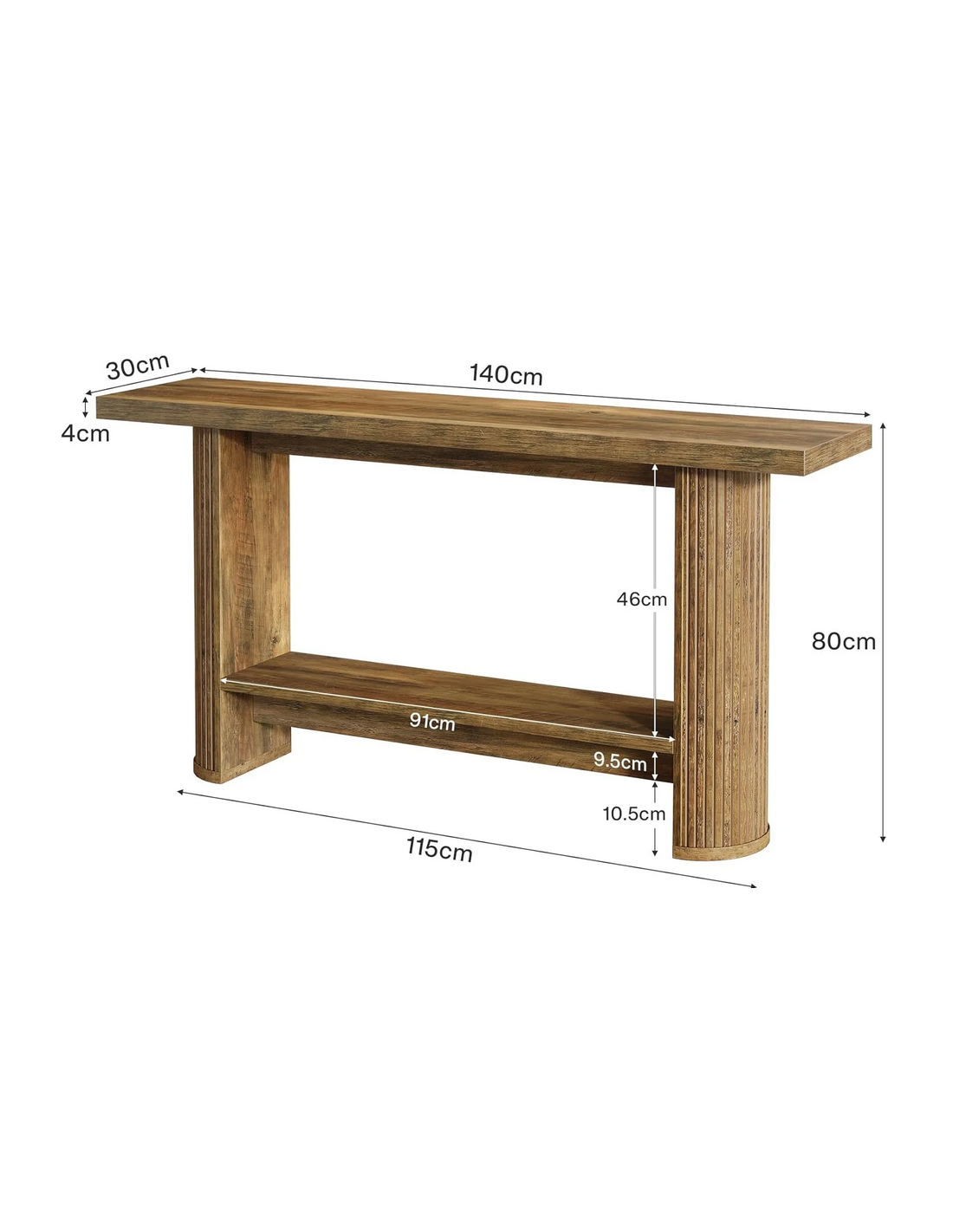 Konsolbord udført i et moderne design af naturbrun møbelplade. Konsolbordet måler 80 cm i højden og 140 x 30 cm i bredde og dybde.