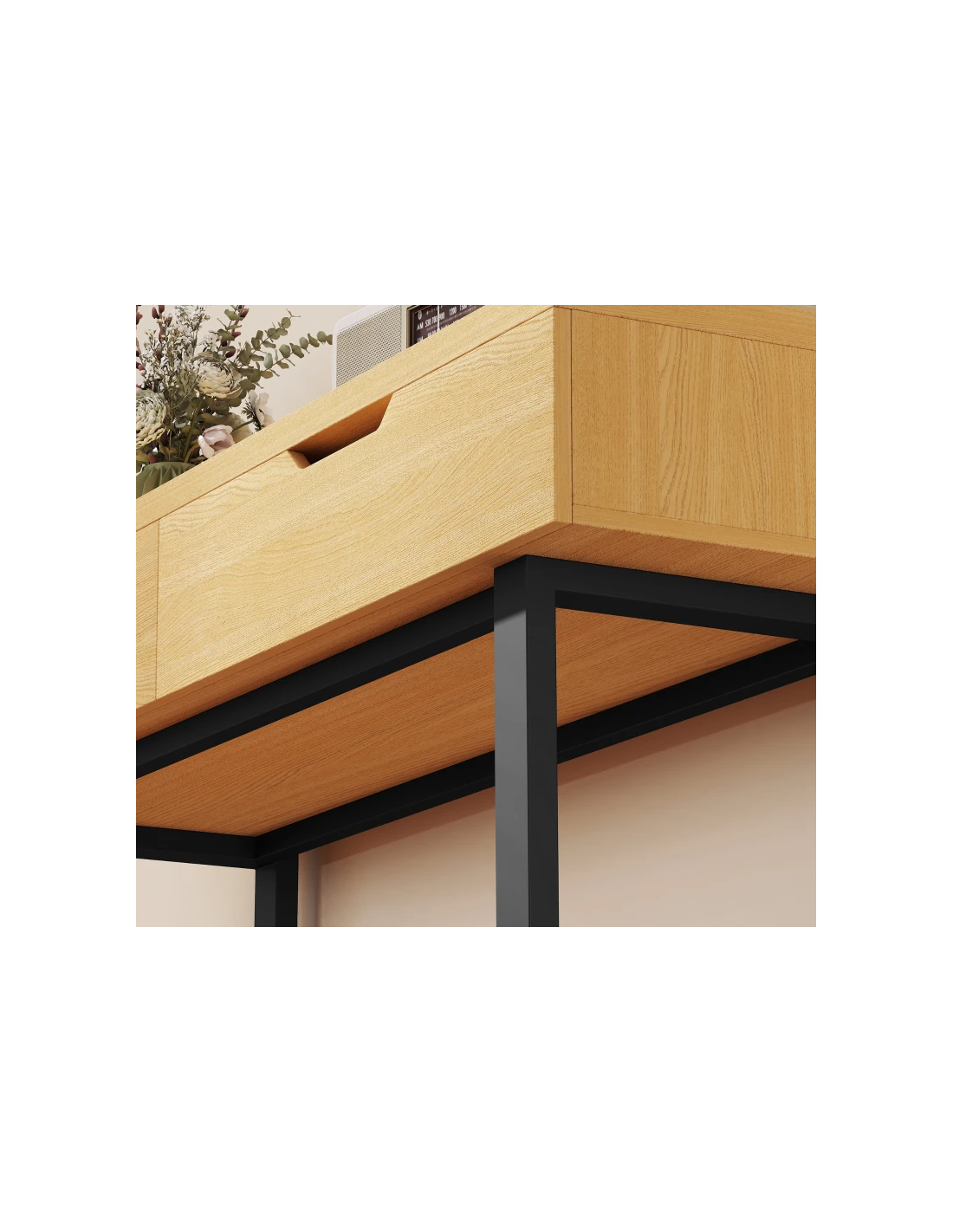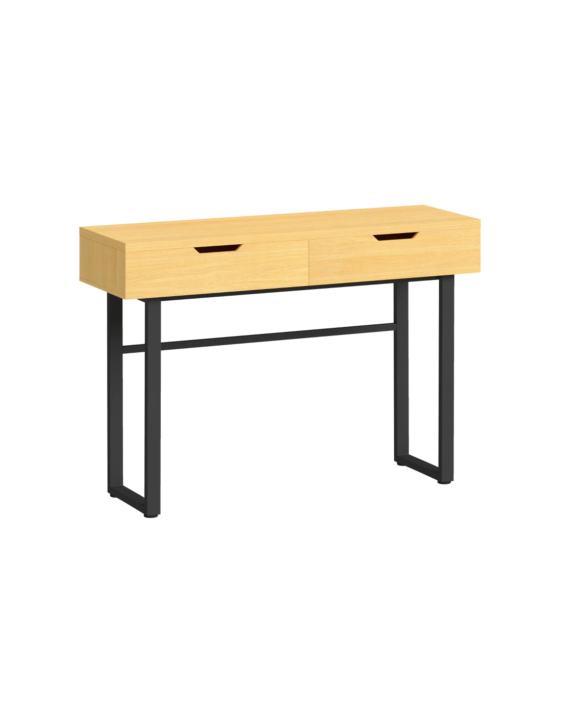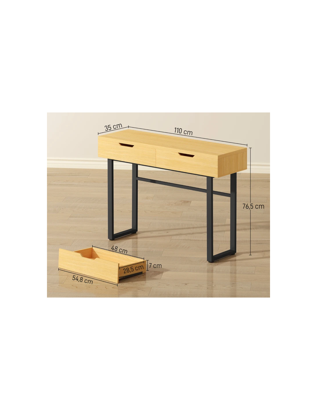 Konsolbord med 2 skuffer, udført i et moderne og Skandinavisk design af sortlakeret metal og naturfarvet MDF. Konsolbordet måler 76,5 cm i højden og 110 x 35 cm i bredde og dybde.