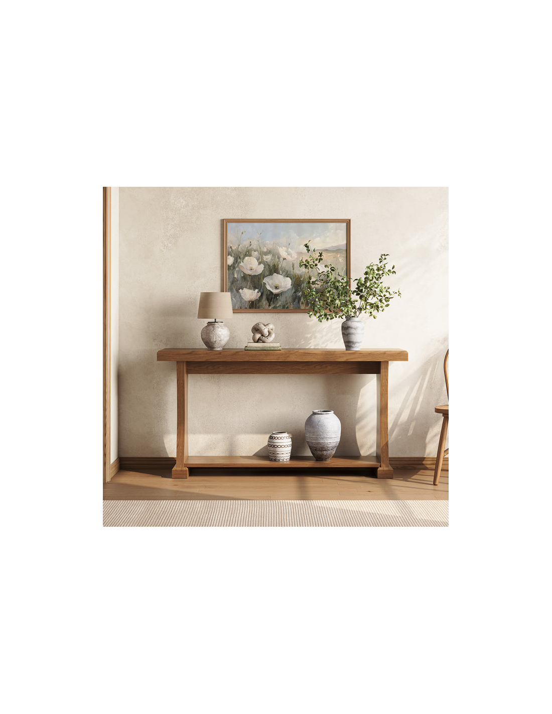 Konsolbord udført i et moderne design af naturbrun MDF. Konsolbordet måler 80 cm i højden og 160 x 35 cm i bredde og dybde.