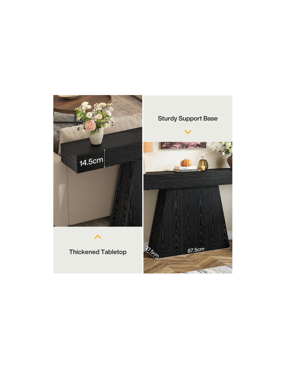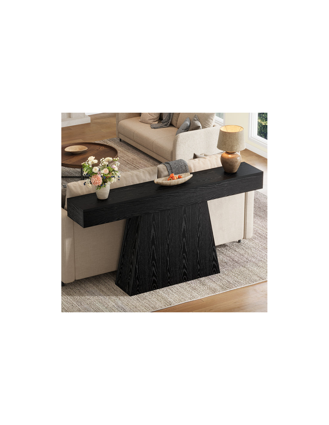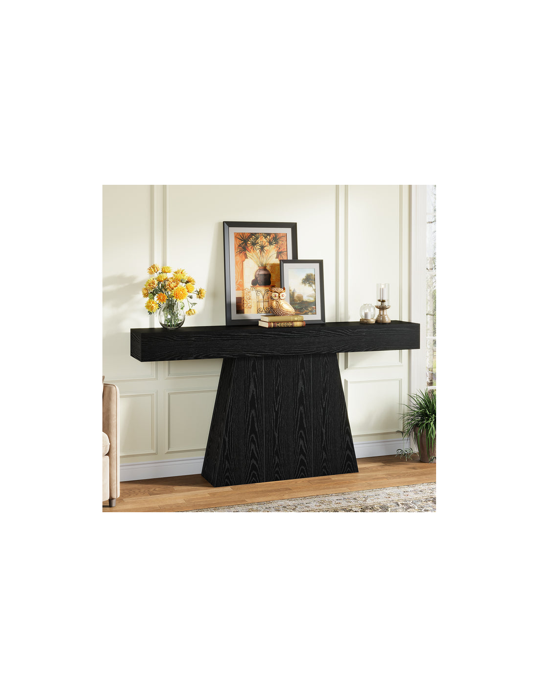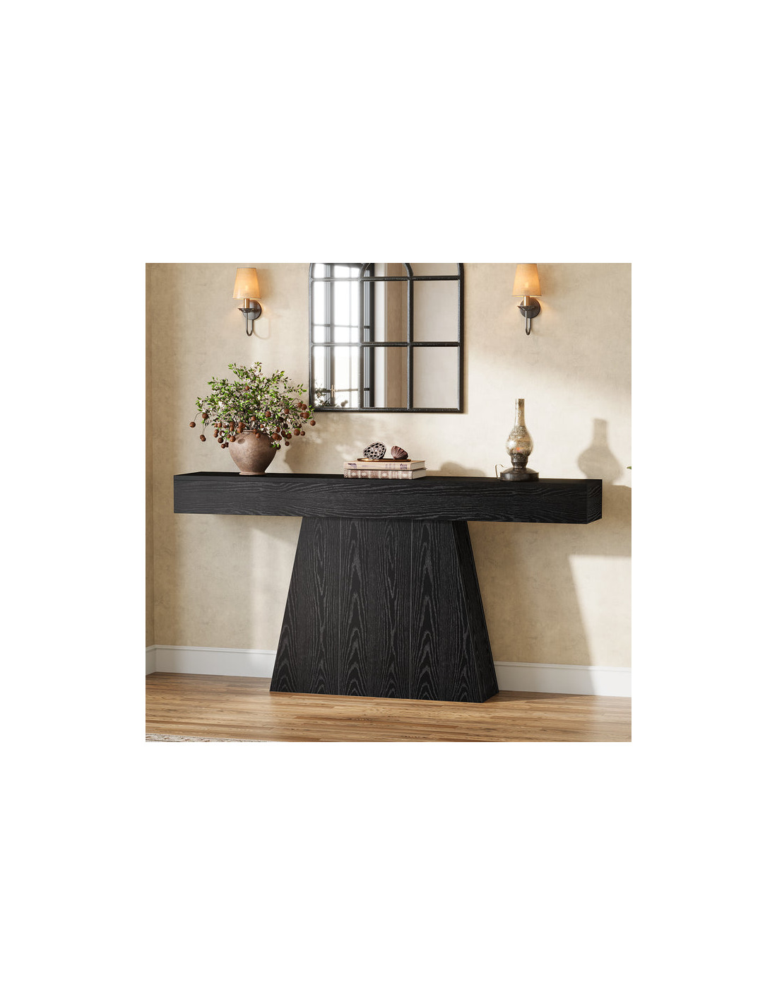 Konsolbord udført i et moderne design af sort møbelplade. Konsolbordet måler 90 cm i højden og 160 x 29,5 cm i bredde og dybde.