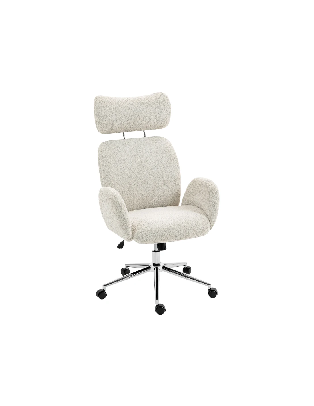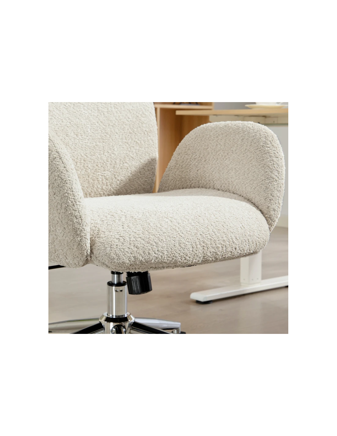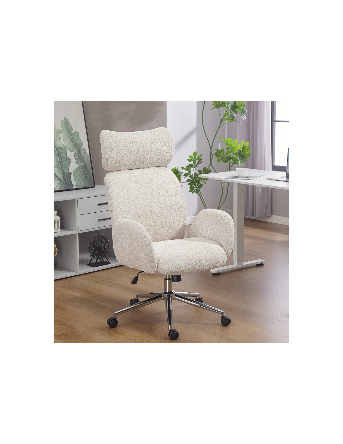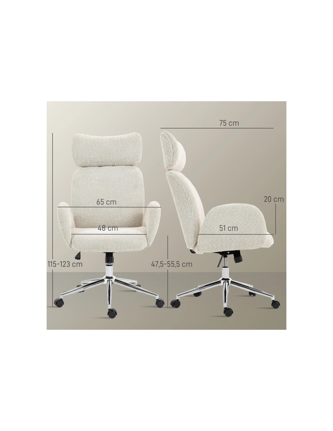 Kontorstol udført i et design af kromlakeret metal og gråhvid teddyplys polyester. Kontorstolen måler 115 - 123 cm i højden over ryggen og med en siddehøjde på 47,5 - 55,5 cm. Stolens bredde er 65 cm og dybde 75 cm.