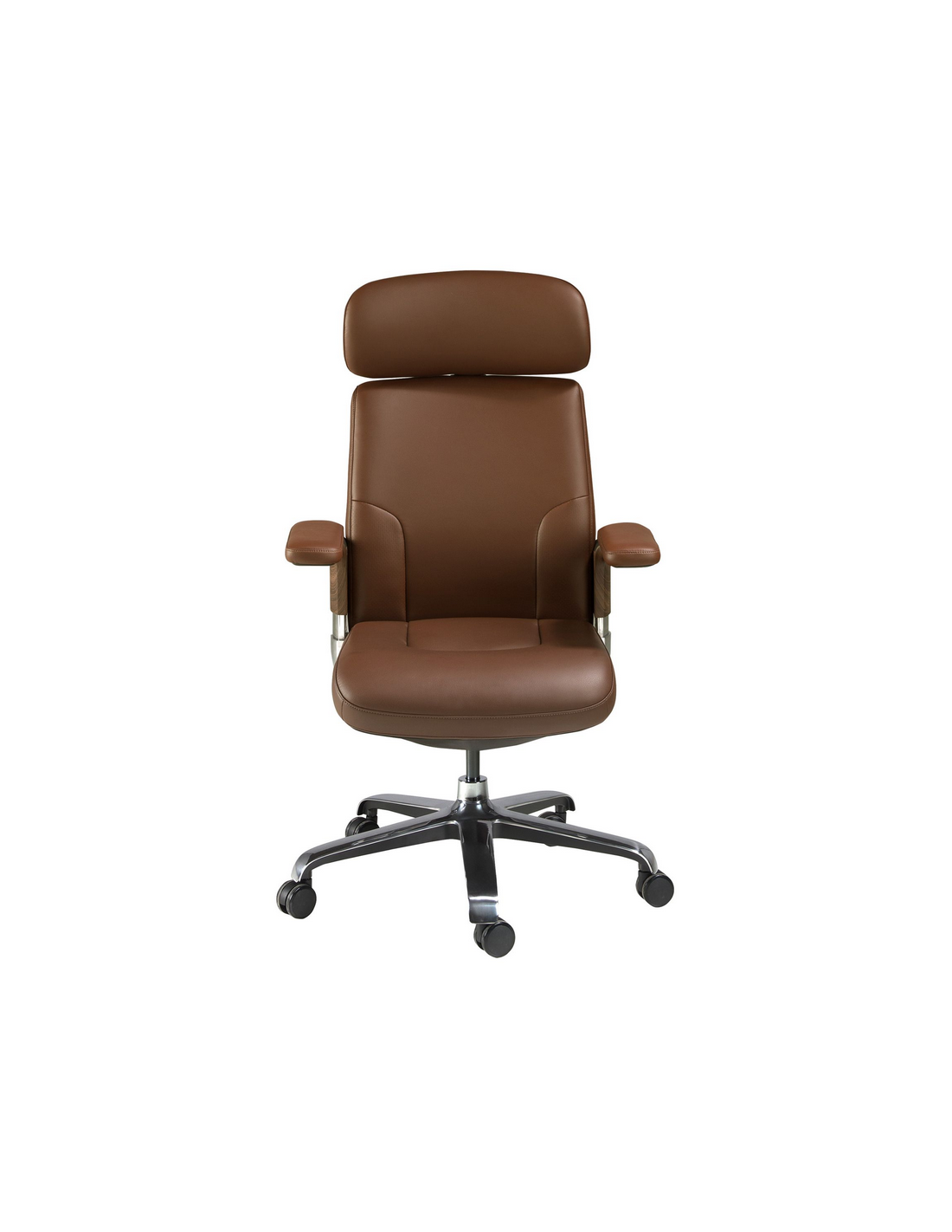 Kontorstol med armlæn udført i et moderne design fra Angel Cerdá. Kontorstolen er fremstillet med stel i kromlakeret stål, valnøddefinér og sæde i brunt vegansk læder (leatherette). Kontorstolen måler 118 - 125 cm i højden over ryggen og har en siddehøjde på 43 - 50 cm.