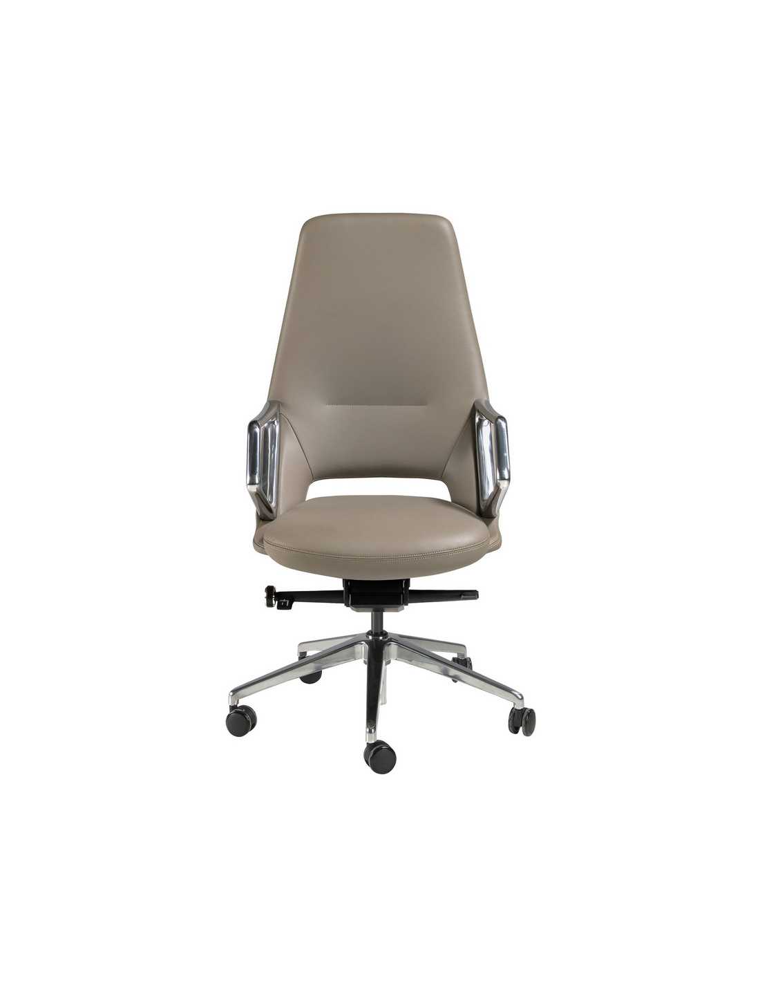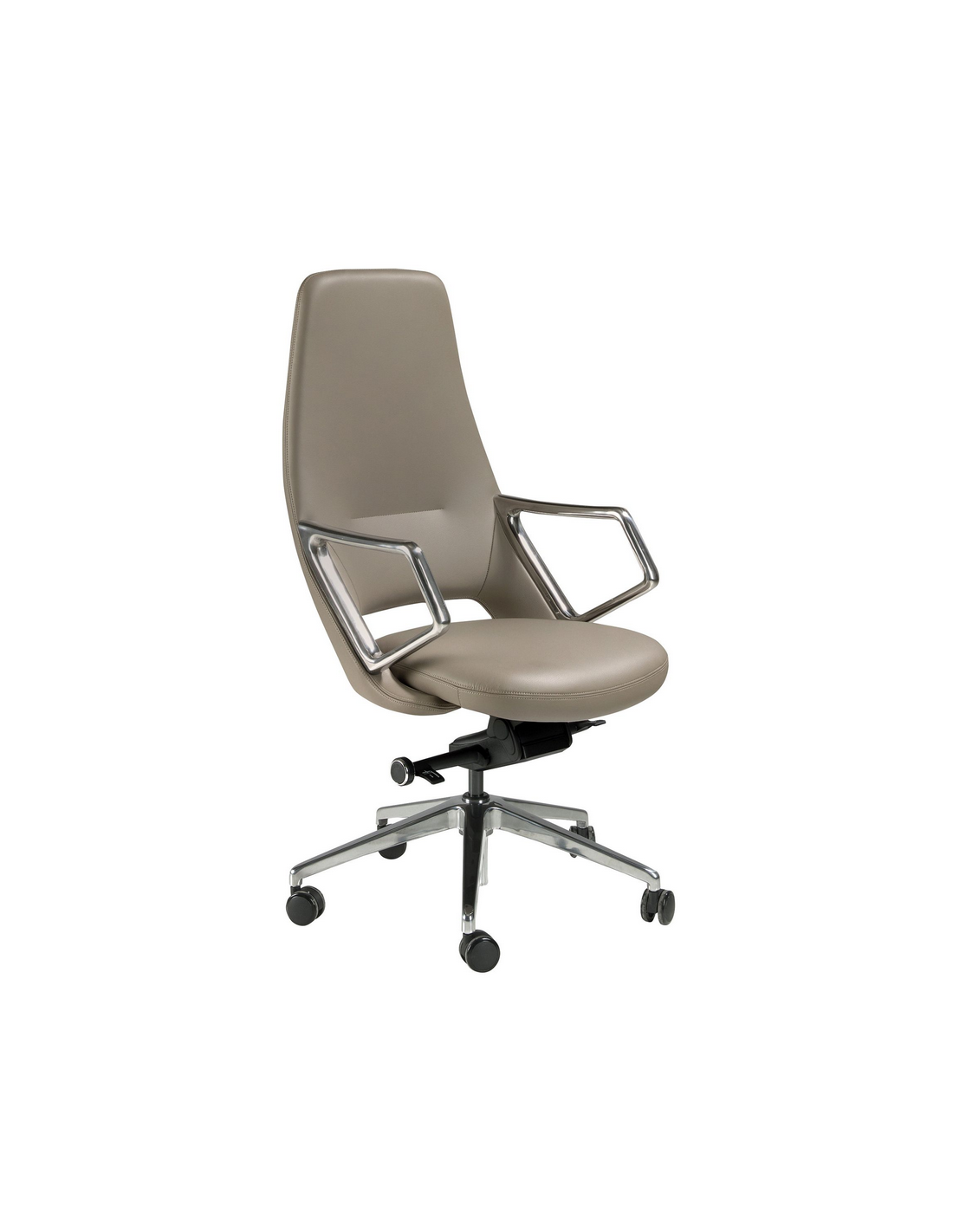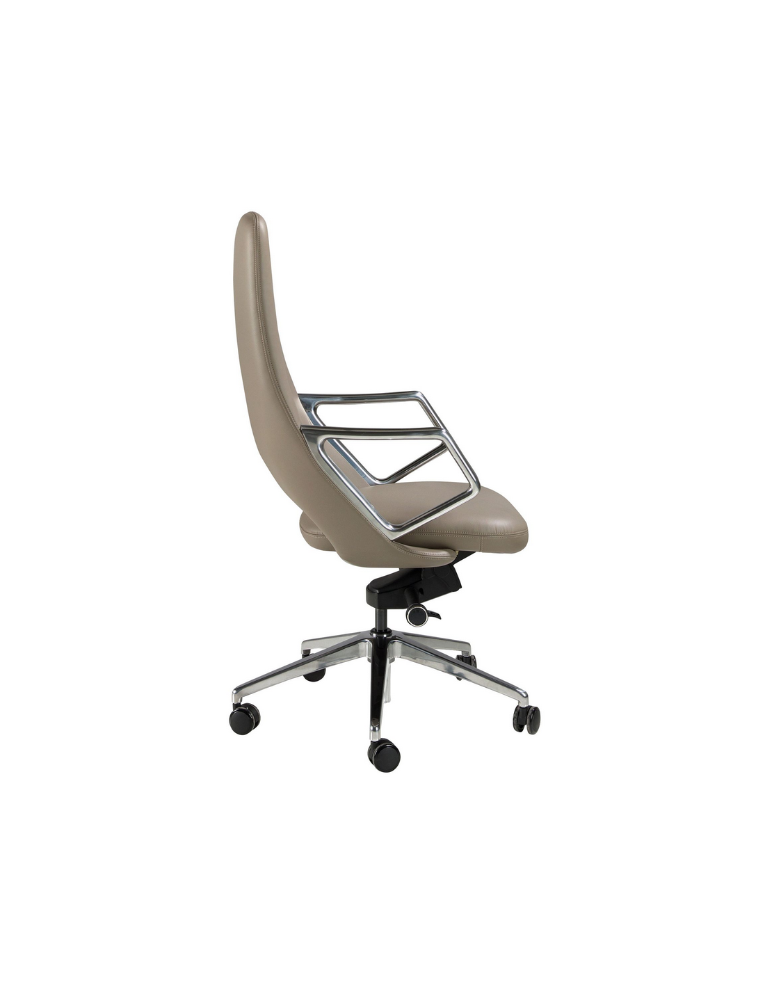 Kontorstol med armlæn udført i et moderne design fra Angel Cerdá. Kontorstolen er fremstillet med stel i kromlakeret stål og sæde i gråt vegansk læder (leatherette). Kontorstolen måler 113 - 120 cm i højden over ryggen og har en siddehøjde på 43 - 50 cm.