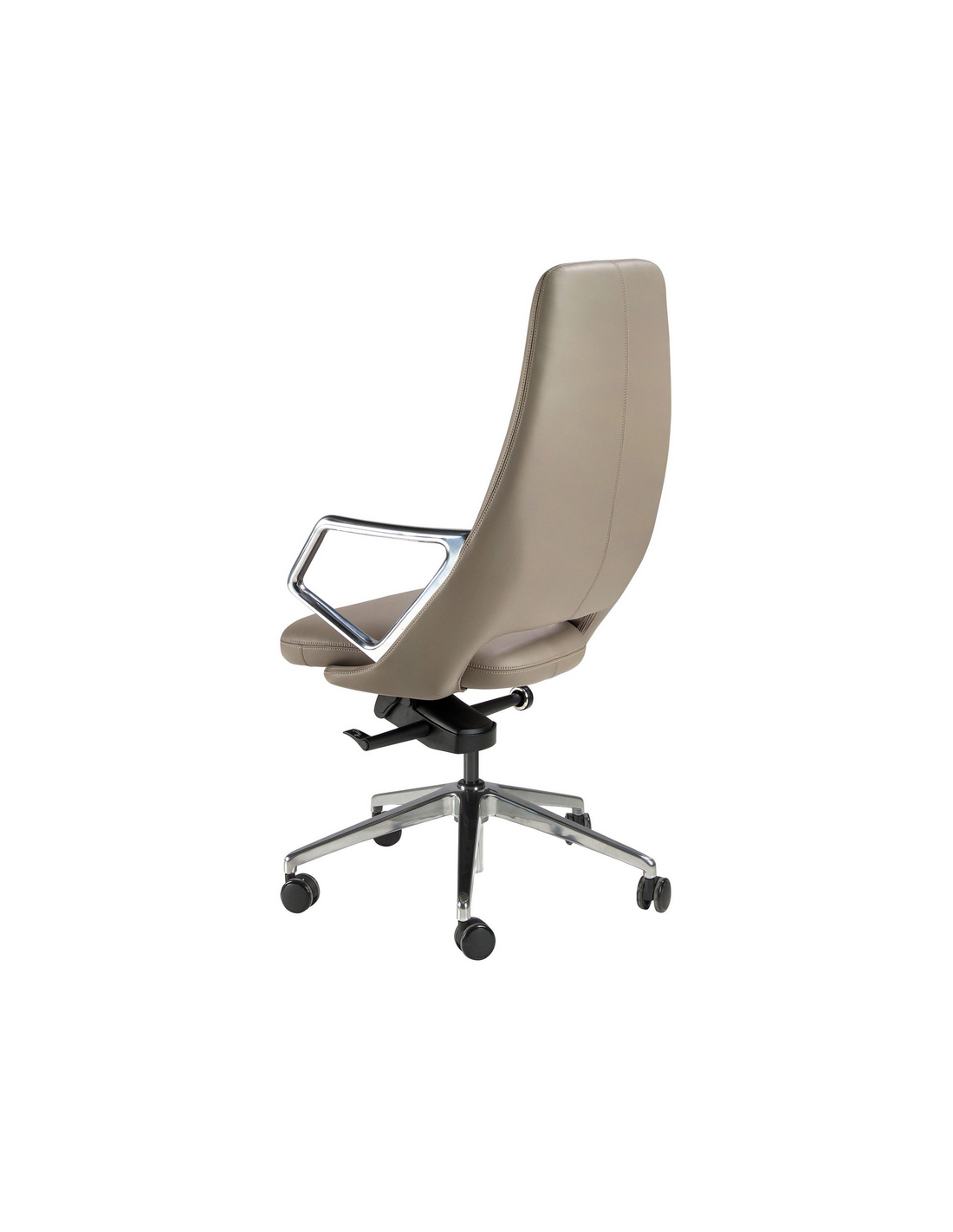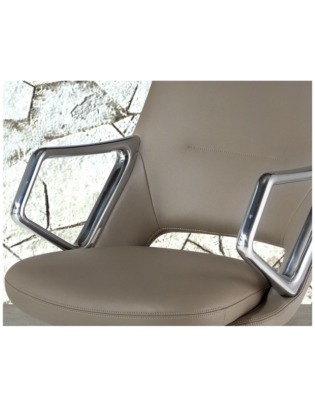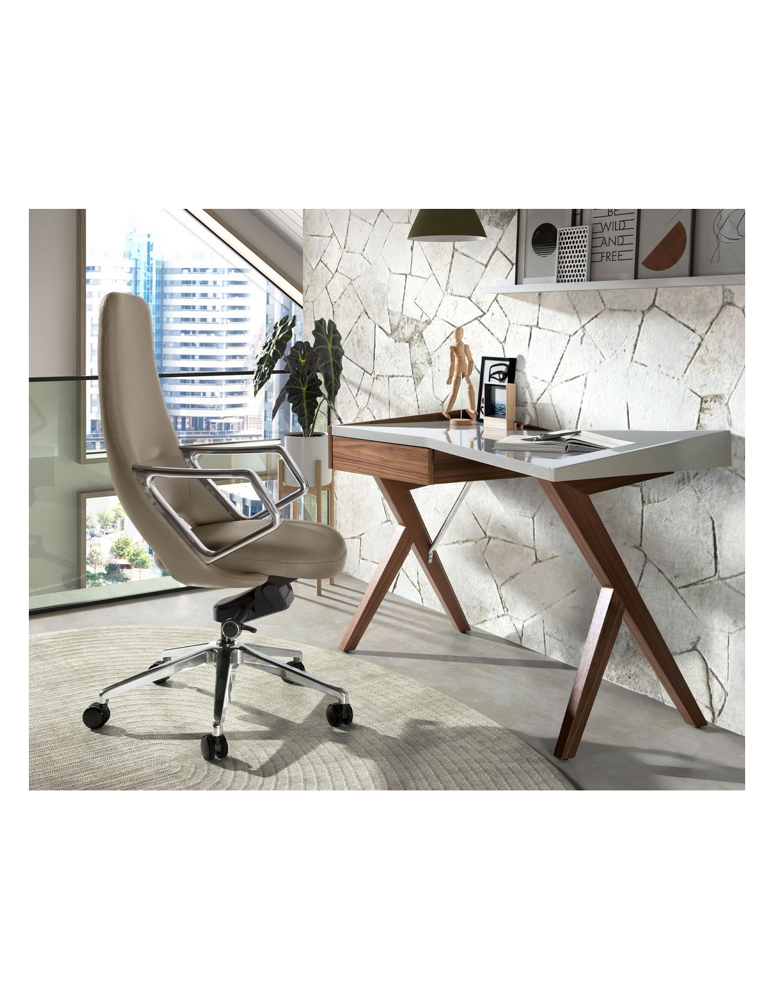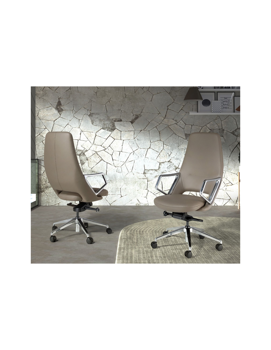 Kontorstol med armlæn udført i et moderne design fra Angel Cerdá. Kontorstolen er fremstillet med stel i kromlakeret stål og sæde i gråt vegansk læder (leatherette). Kontorstolen måler 113 - 120 cm i højden over ryggen og har en siddehøjde på 43 - 50 cm.