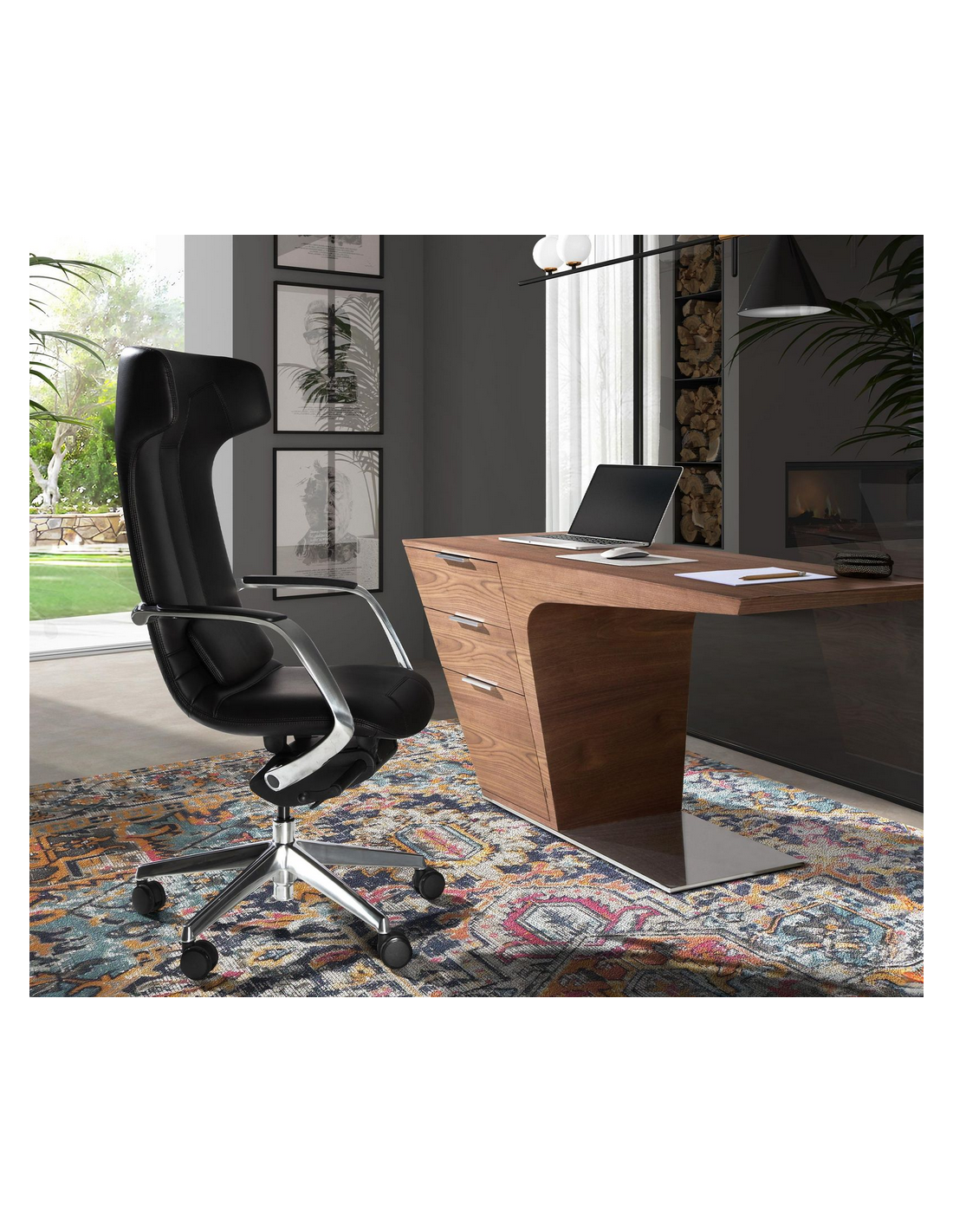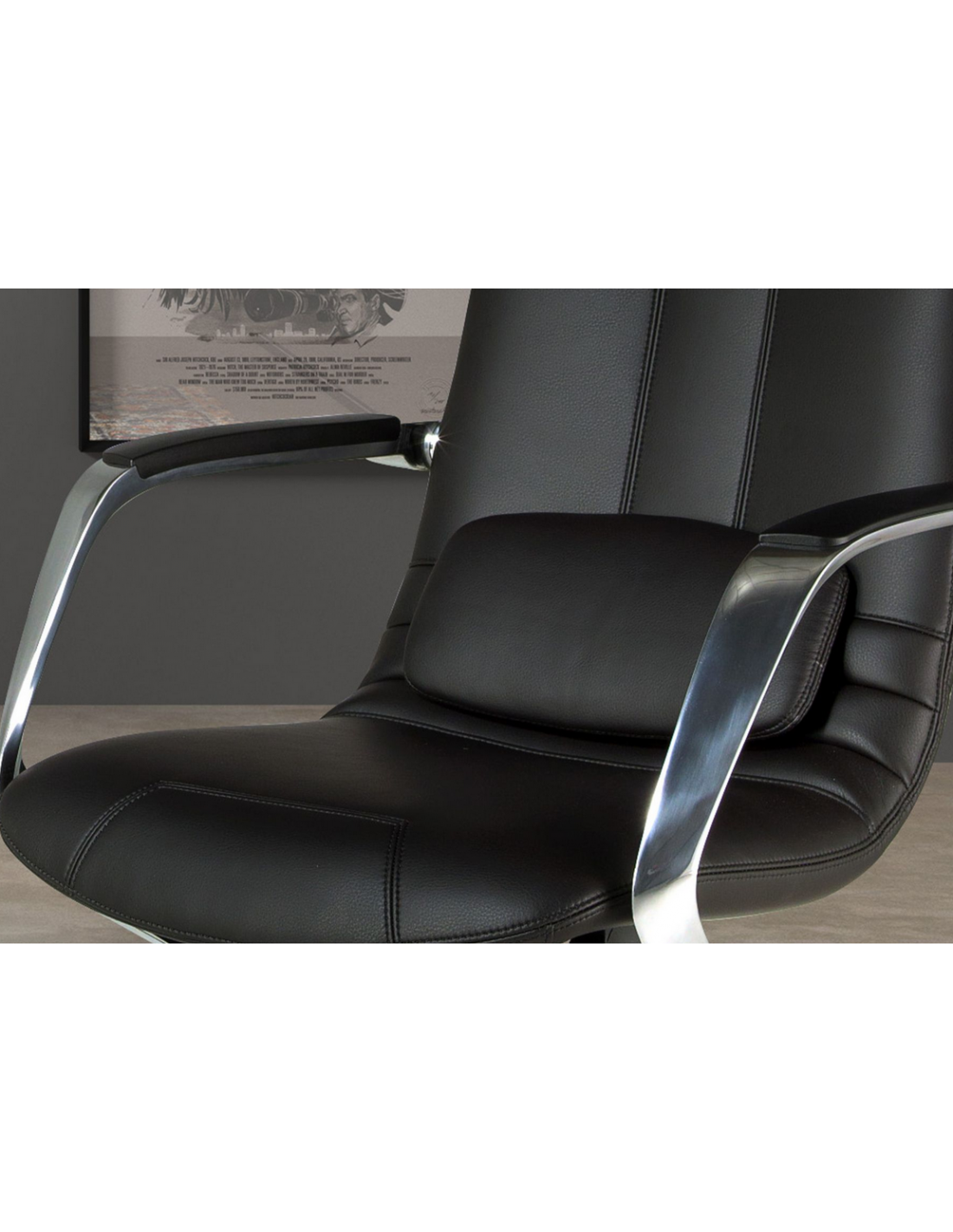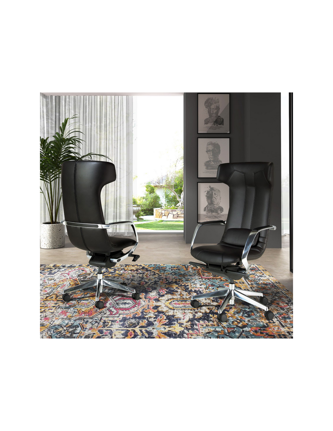 Kontorstol med armlæn udført i et moderne design fra Angel Cerdá. Kontorstolen er fremstillet med stel i kromlakeret stål og sæde i sort vegansk læder (leatherette). Kontorstolen måler 112 - 130 cm i højden over ryggen og har en siddehøjde på 45 - 55 cm.