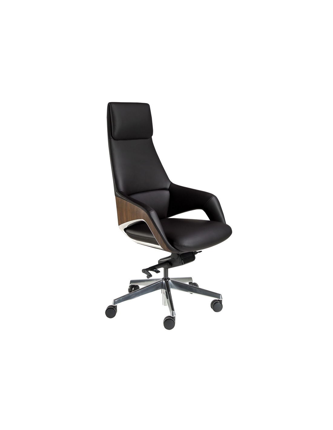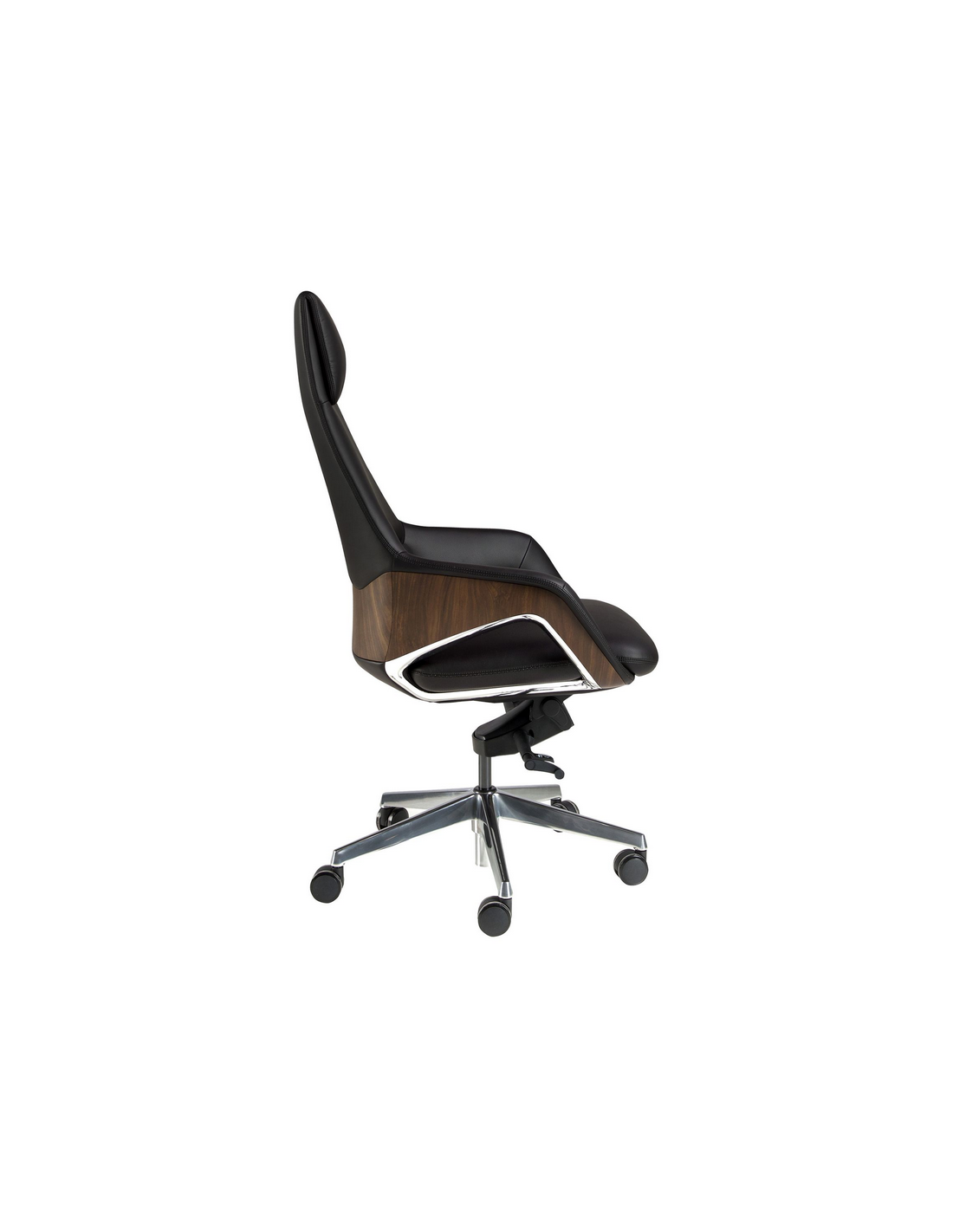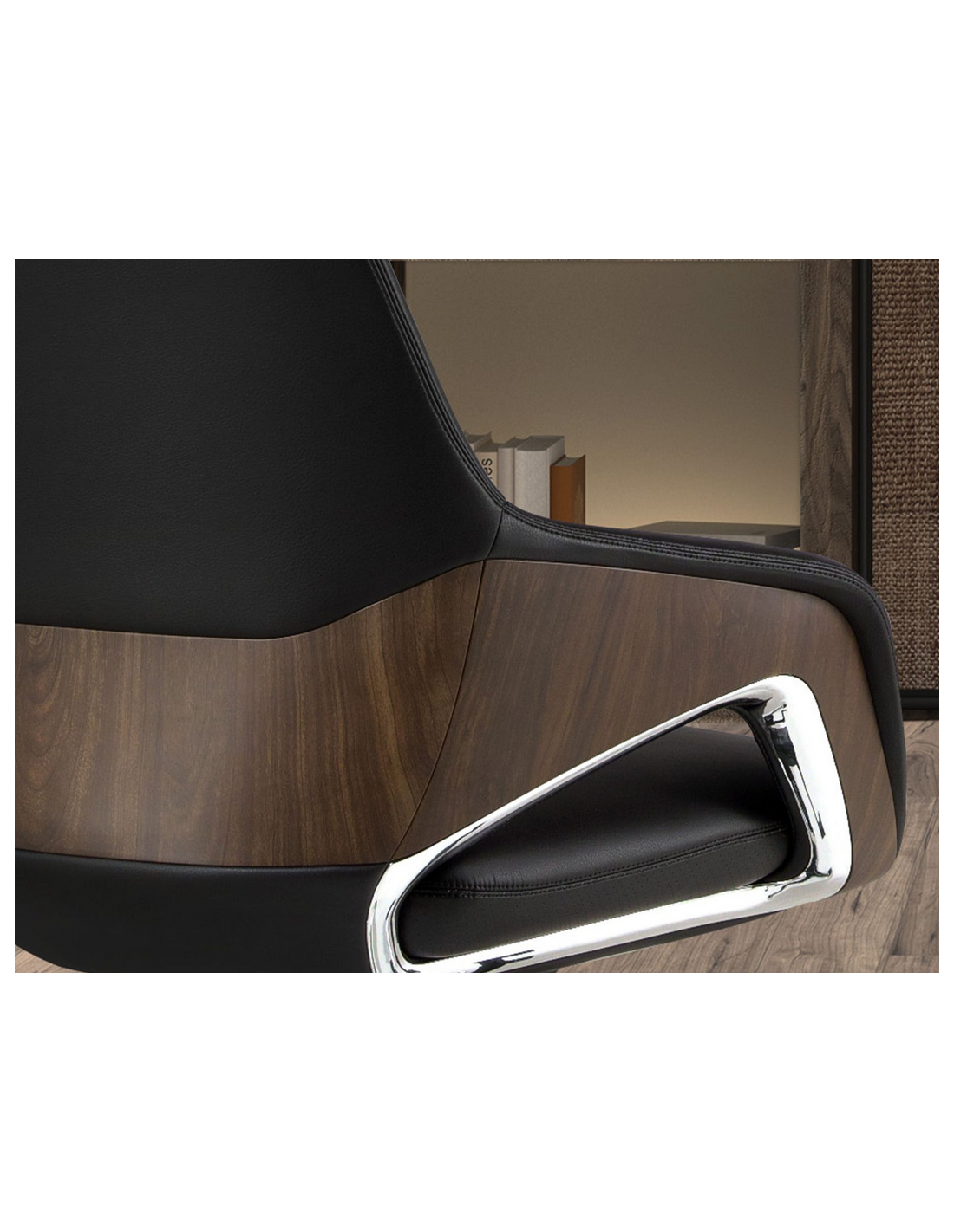 Kontorstol med armlæn udført i et moderne design fra Angel Cerdá. Kontorstolen er fremstillet med stel i kromlakeret stål, valnøddefinér og sæde i sort vegansk læder (leatherette). Kontorstolen måler 121 - 128 cm i højden over ryggen og har en siddehøjde på 44 - 50 cm.