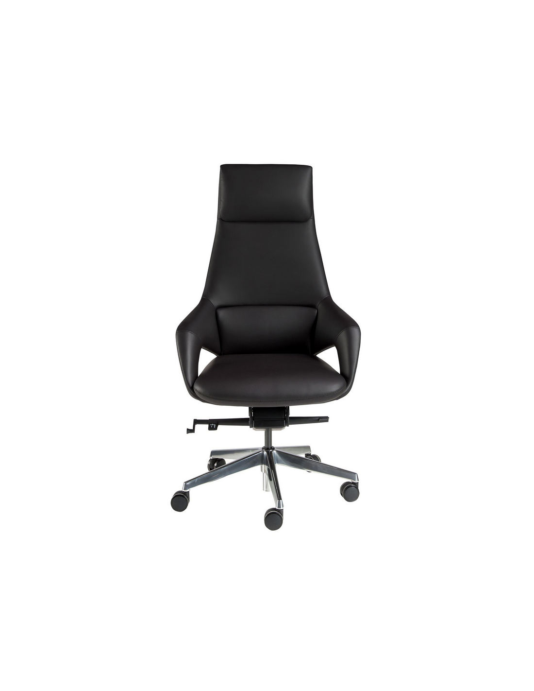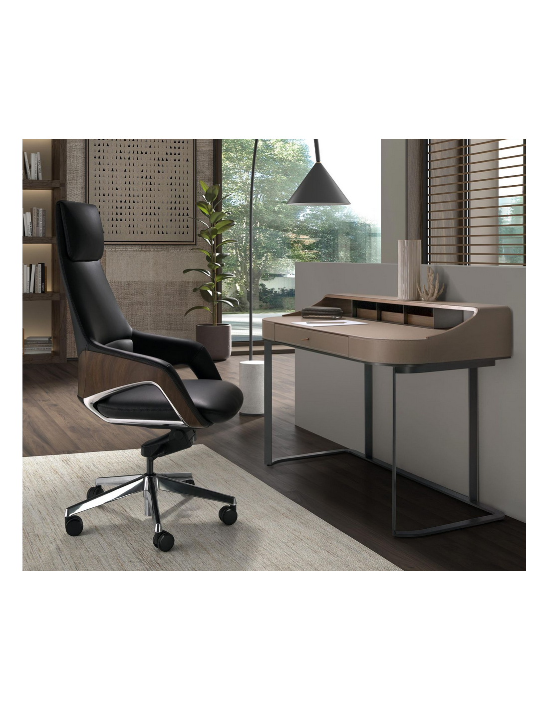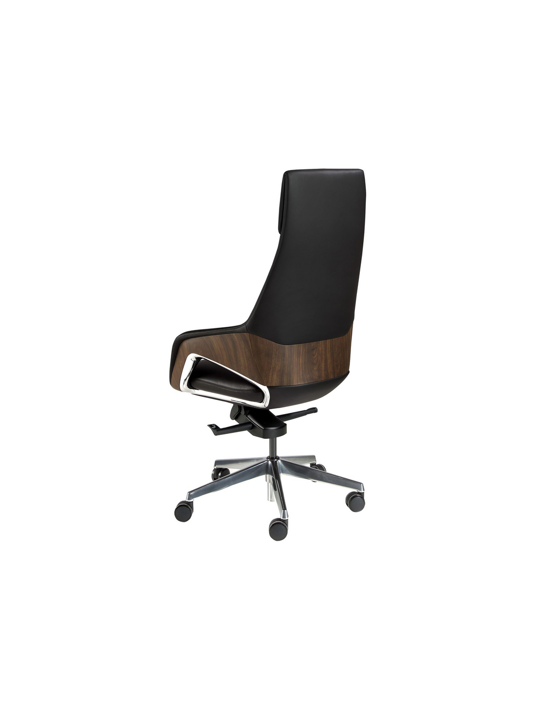 Kontorstol med armlæn udført i et moderne design fra Angel Cerdá. Kontorstolen er fremstillet med stel i kromlakeret stål, valnøddefinér og sæde i sort vegansk læder (leatherette). Kontorstolen måler 121 - 128 cm i højden over ryggen og har en siddehøjde på 44 - 50 cm.