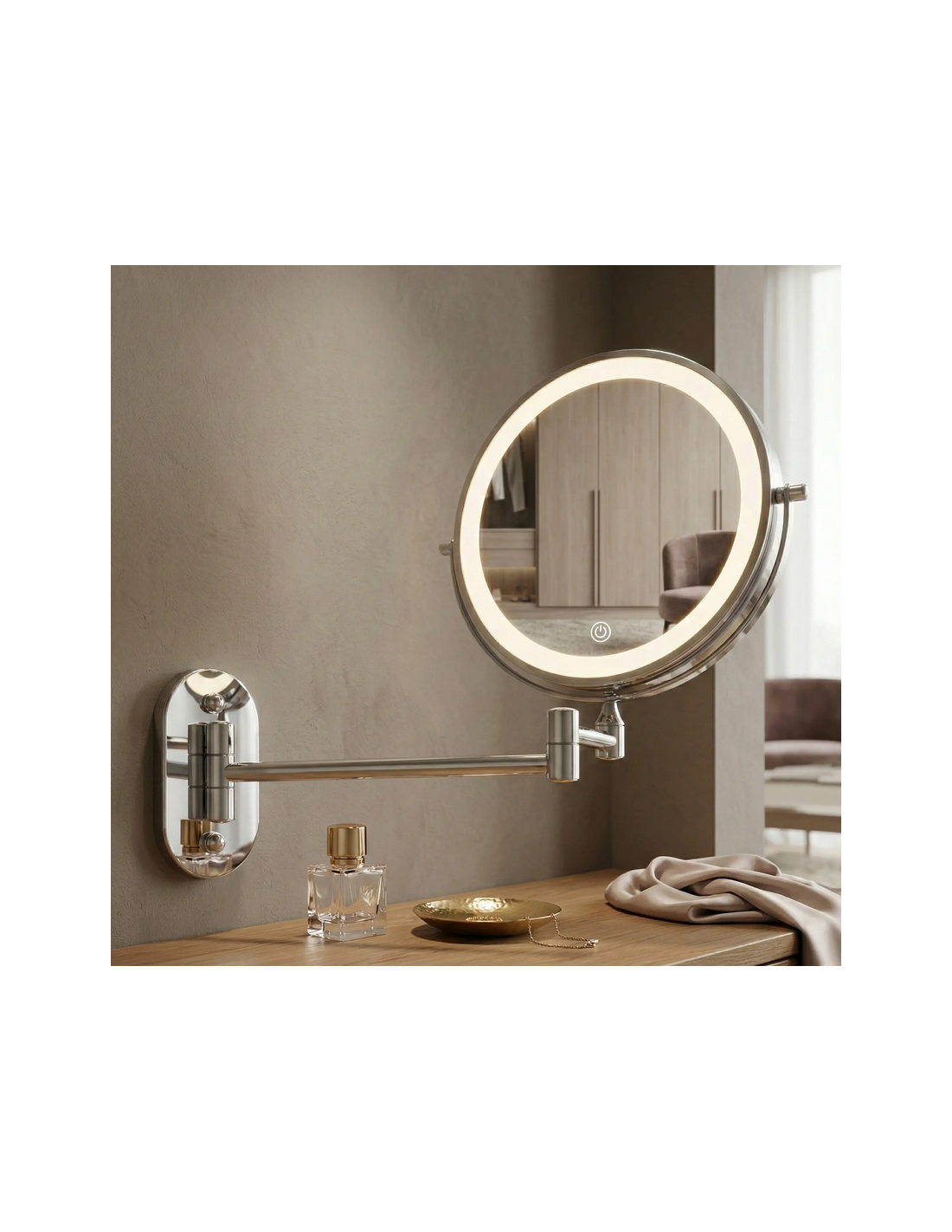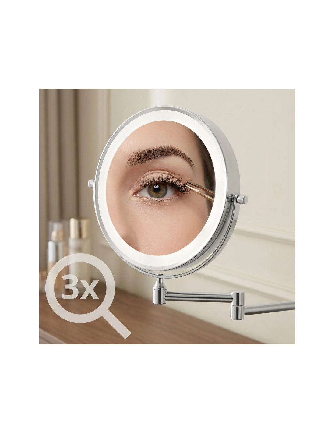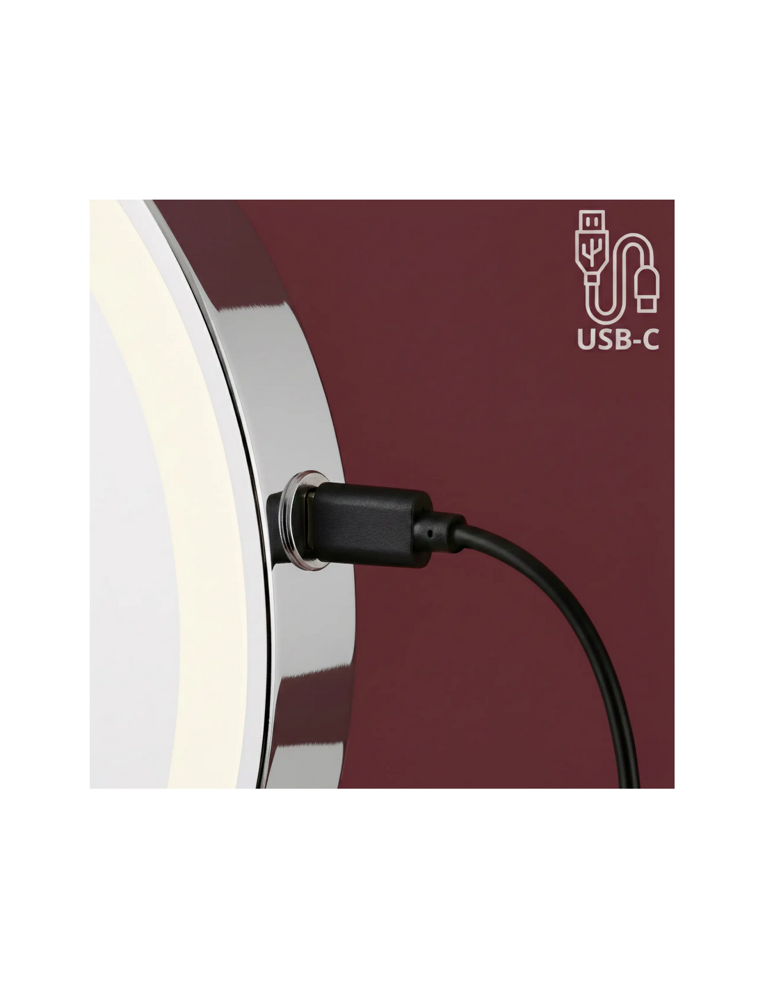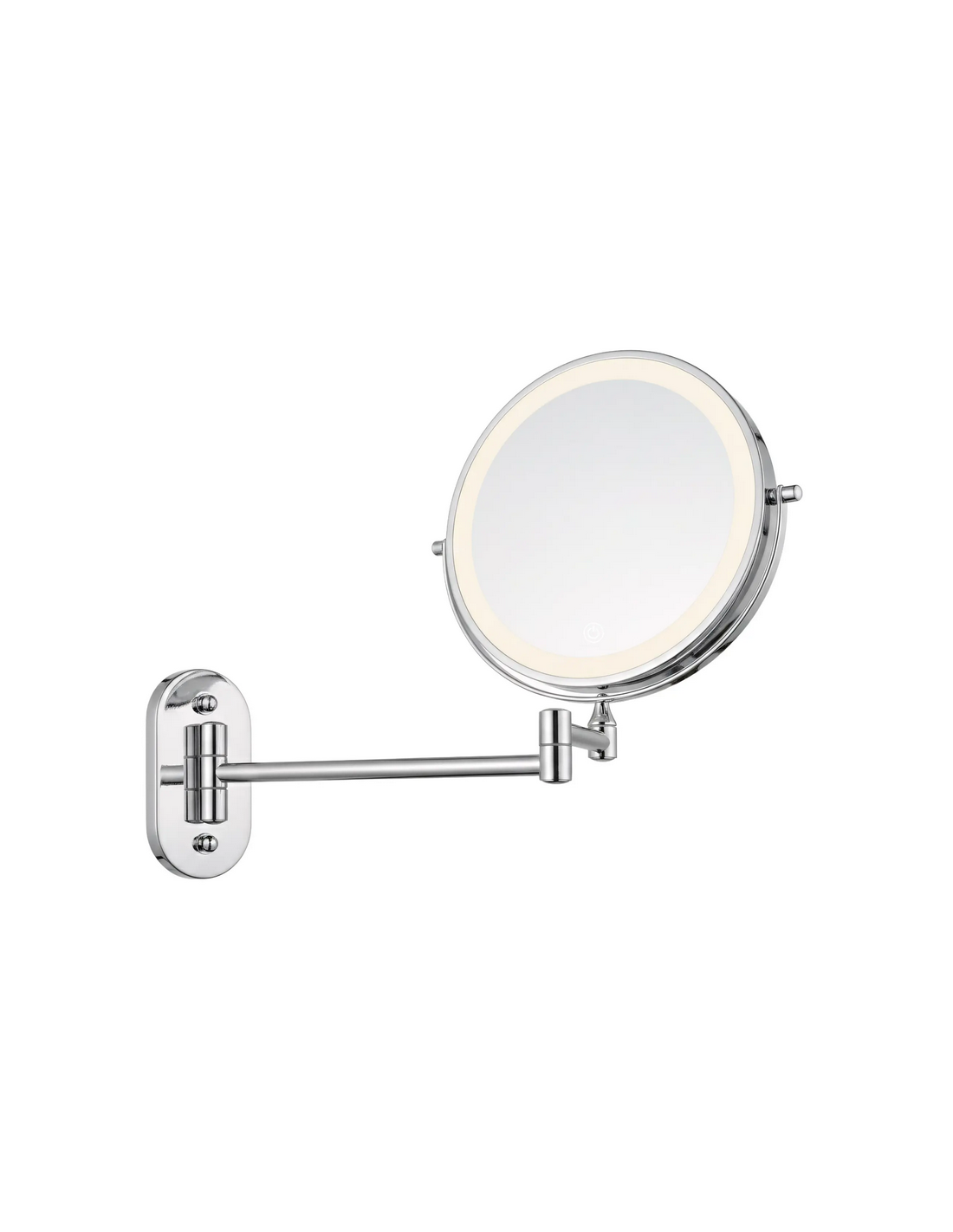 Kosmetikspejl med LED belysning, der er justerbart fra kold hvid til varm hvid belysning. Spejlet har flere indstillinger og er trådløst. Spejlet oplades via medfølgende usb-c stik. Spejlet er fremstillet i et design af kromlakeret stål og klart glas og er dobbeltsidet med 3 x forstørrelse. Juster lysstyrken via touch på spejlet.
