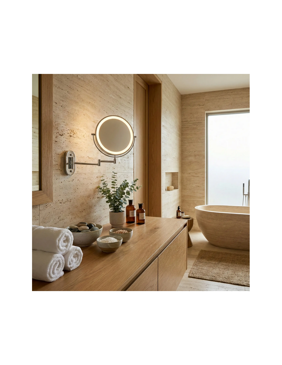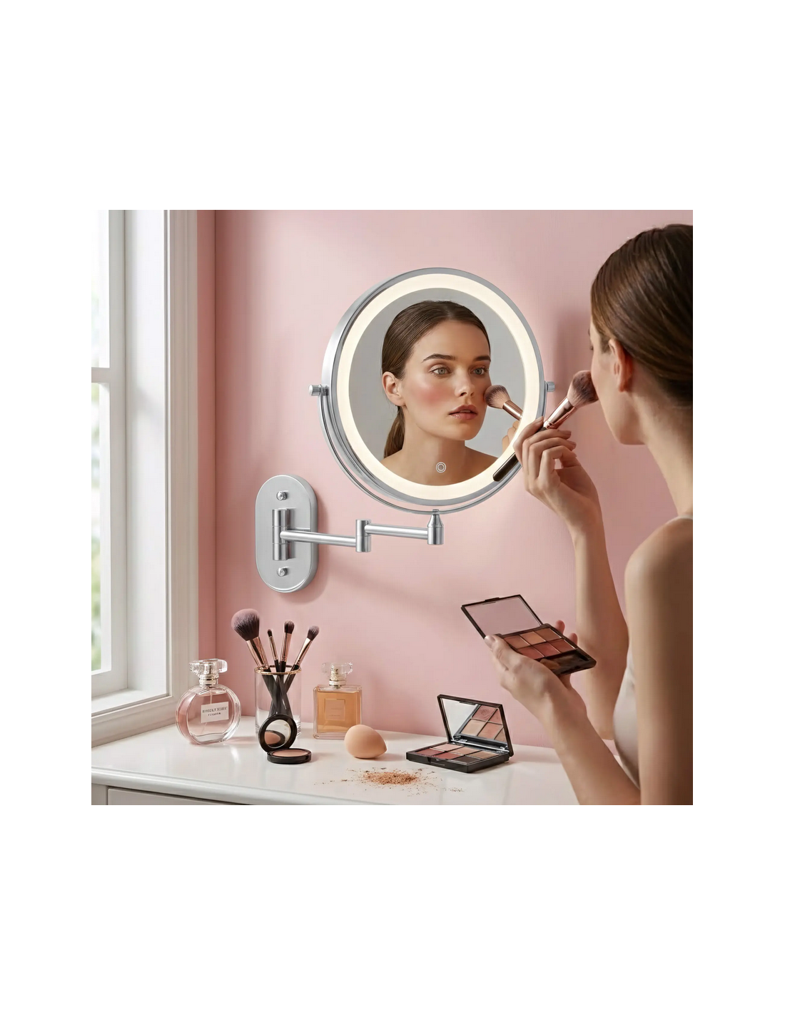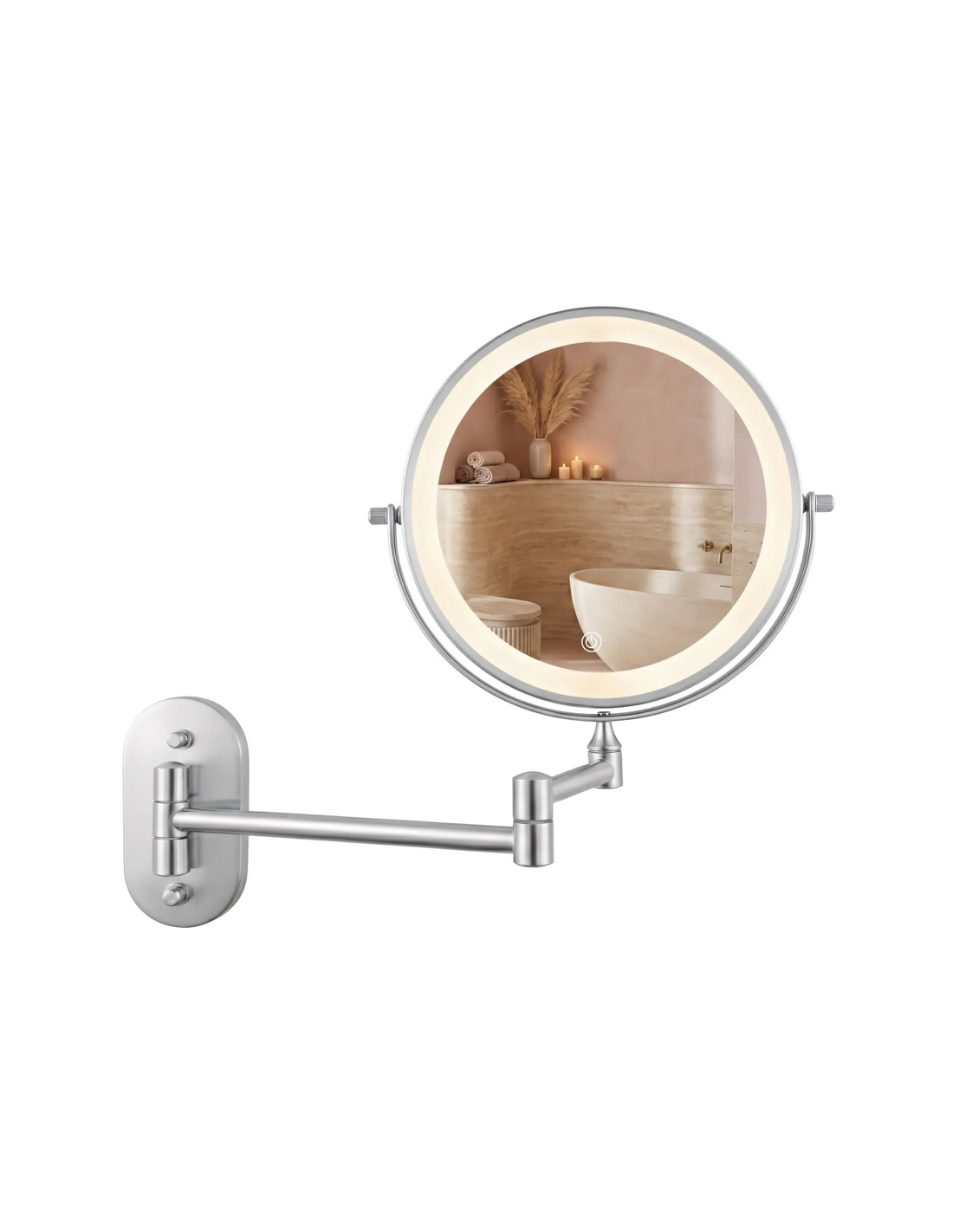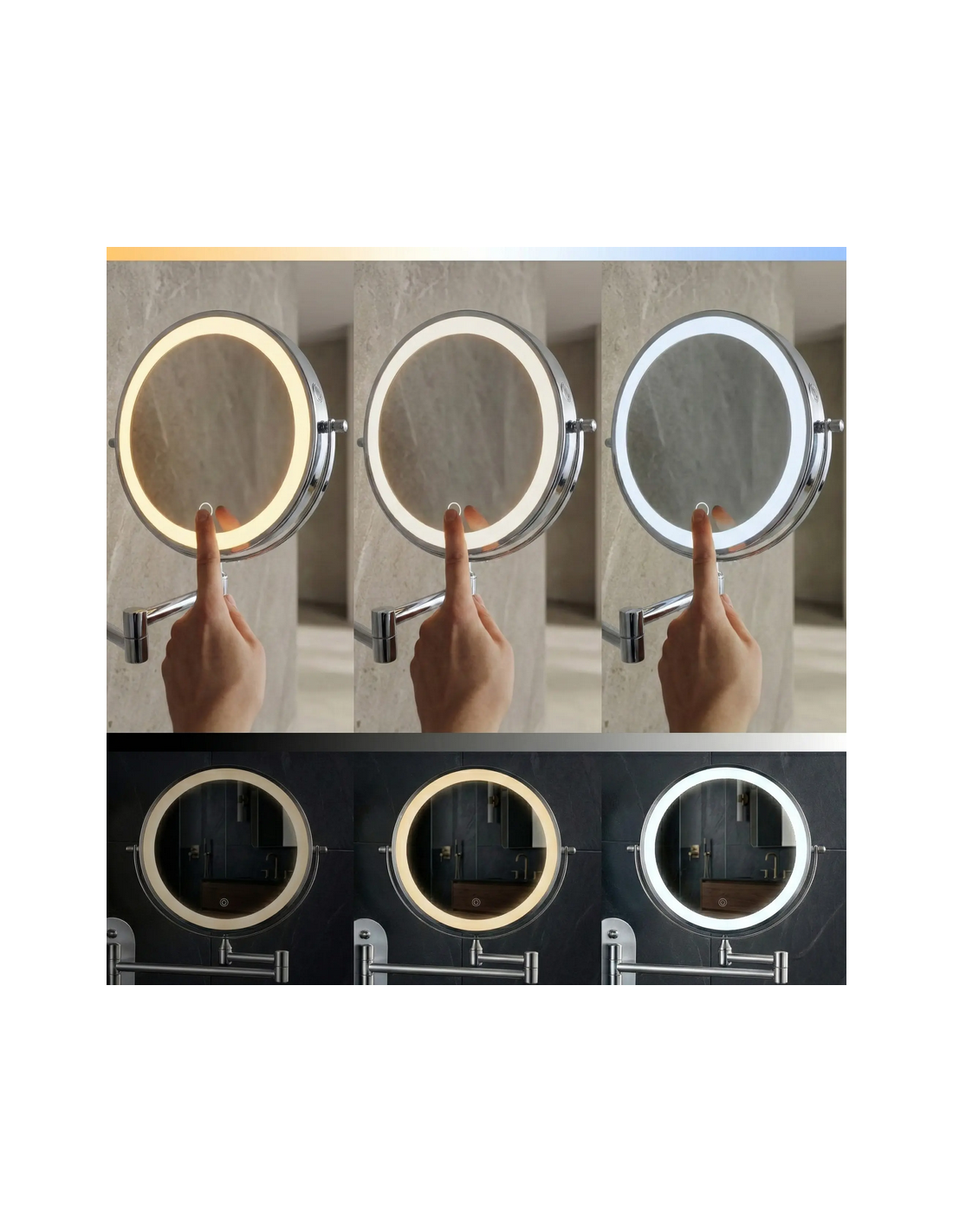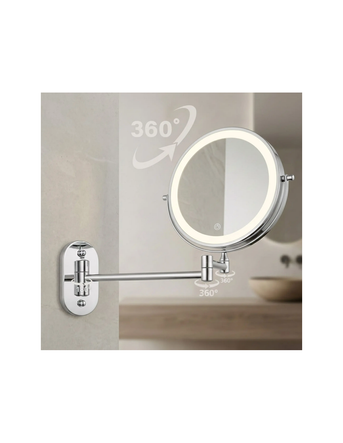 Kosmetikspejl med LED belysning, der er justerbart fra kold hvid til varm hvid belysning. Spejlet har flere indstillinger og er trådløst. Spejlet oplades via medfølgende usb-c stik. Spejlet er fremstillet i et design af kromlakeret stål og klart glas og er dobbeltsidet med 3 x forstørrelse. Juster lysstyrken via touch på spejlet.