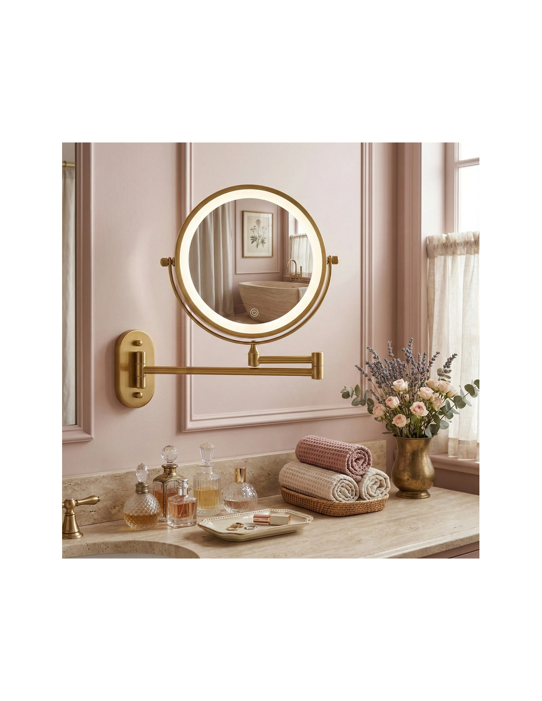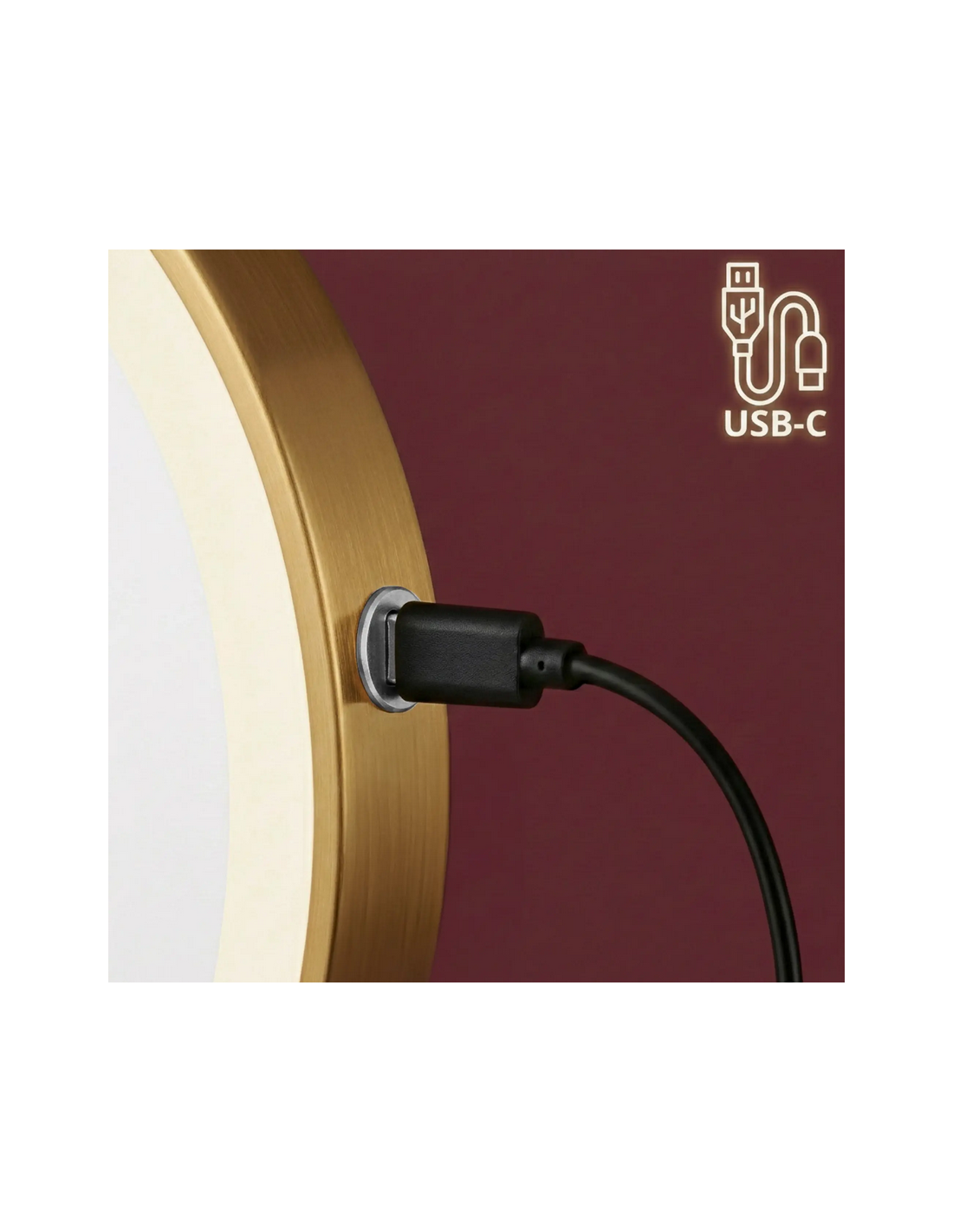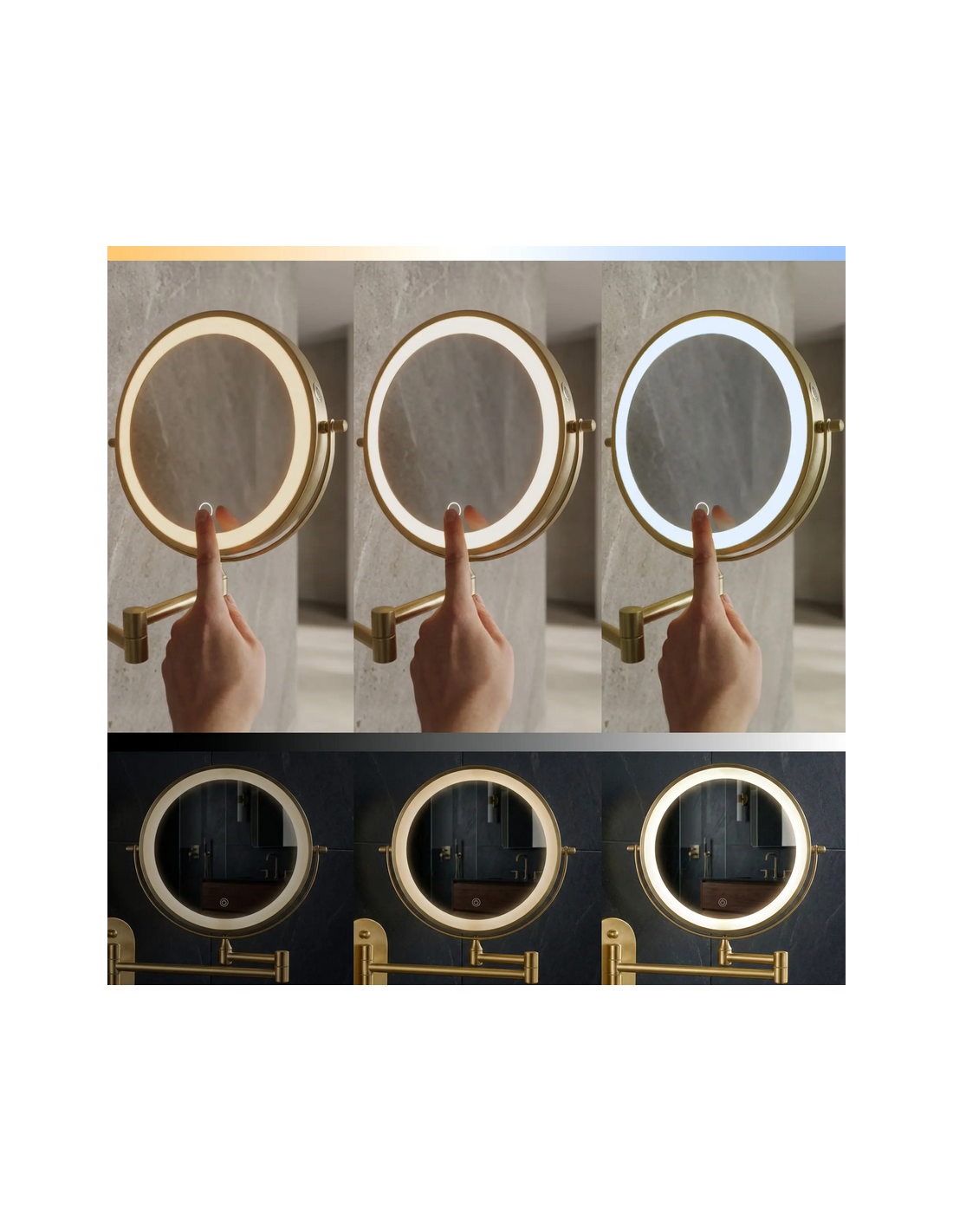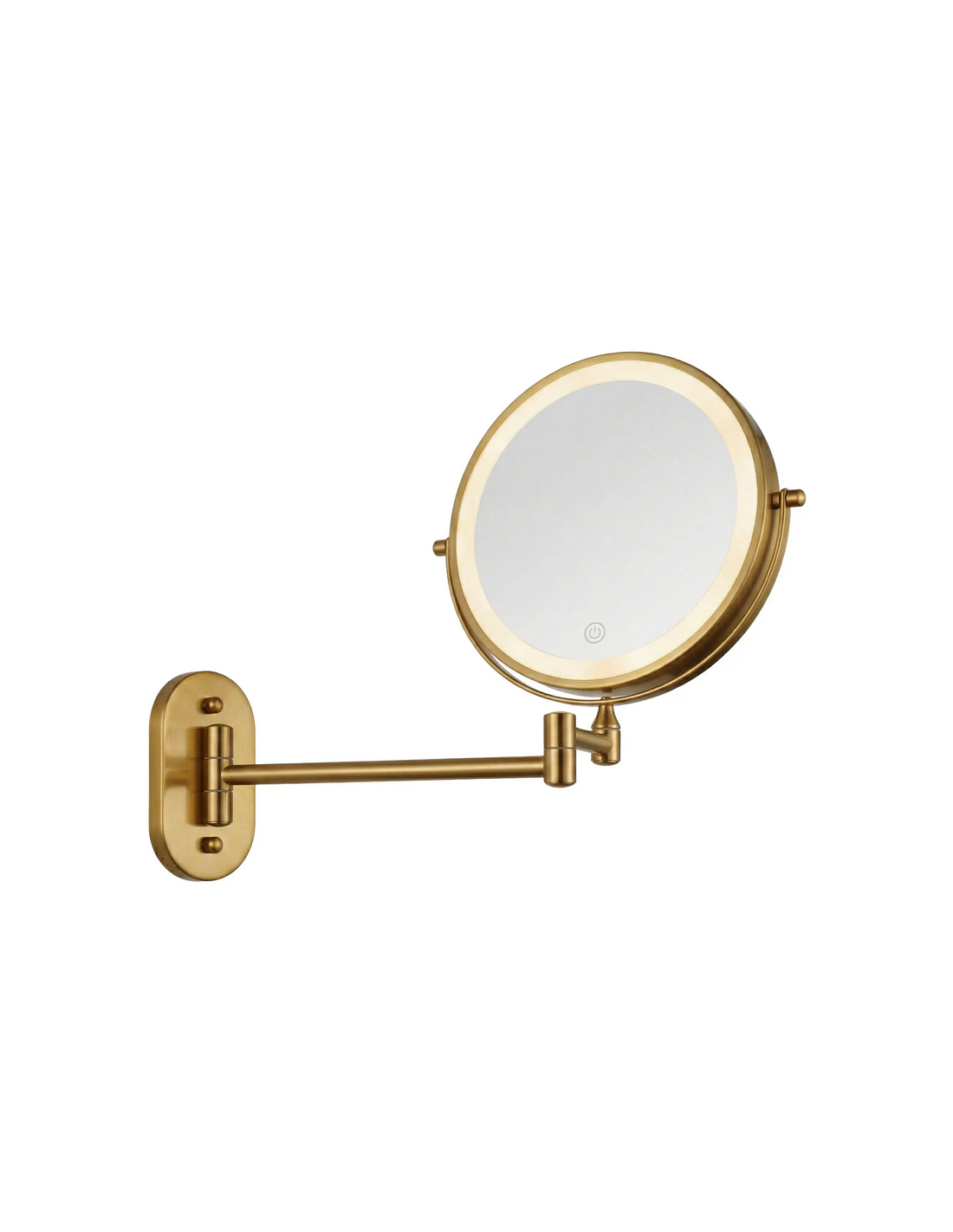 Kosmetikspejl med LED belysning, der er justerbart fra kold hvid til varm hvid belysning. Spejlet har flere indstillinger og er trådløst. Spejlet oplades via medfølgende usb-c stik. Spejlet er fremstillet i et design af antik guldfarvet stål og klart glas og er dobbeltsidet med 3 x forstørrelse. Juster lysstyrken via touch på spejlet.