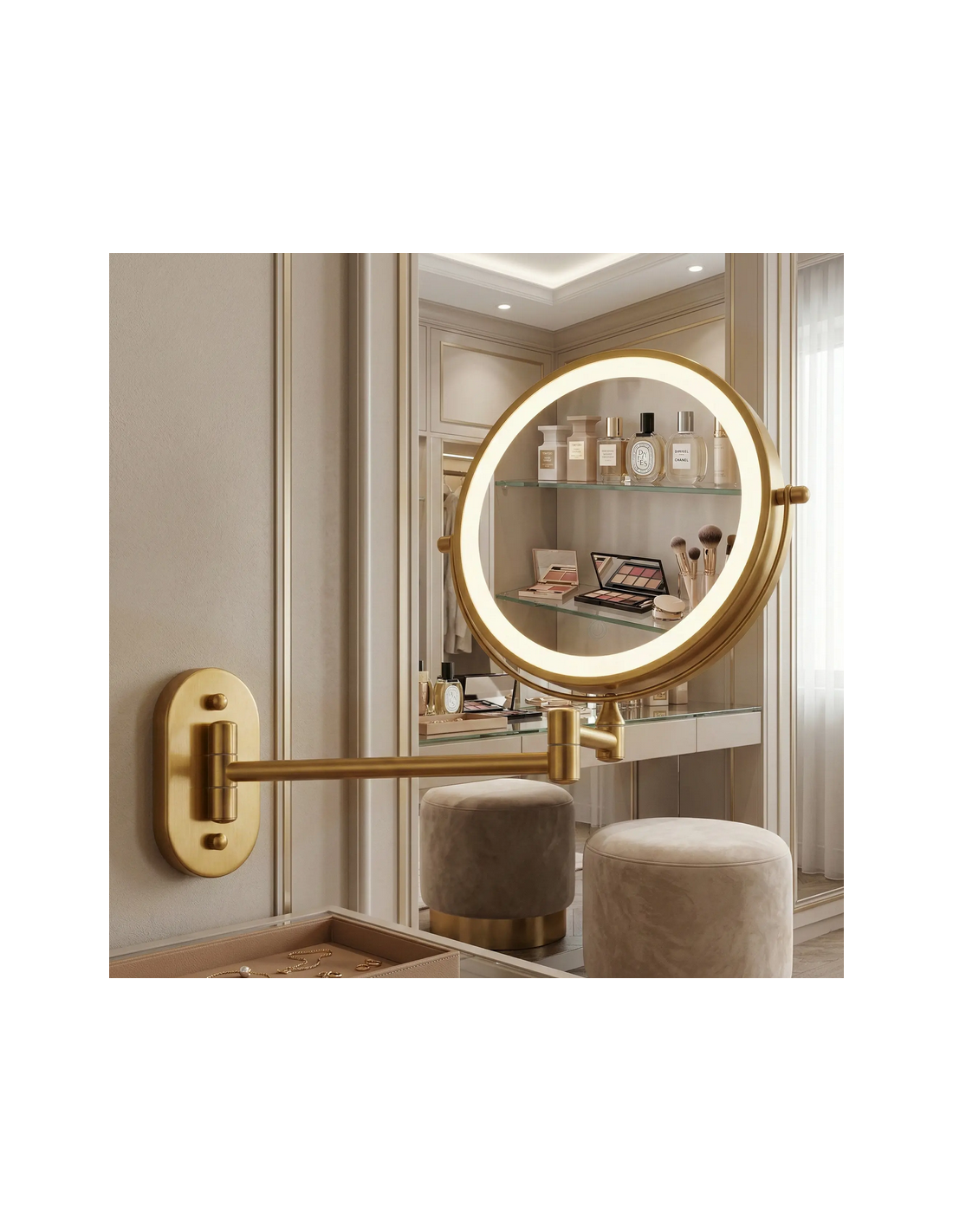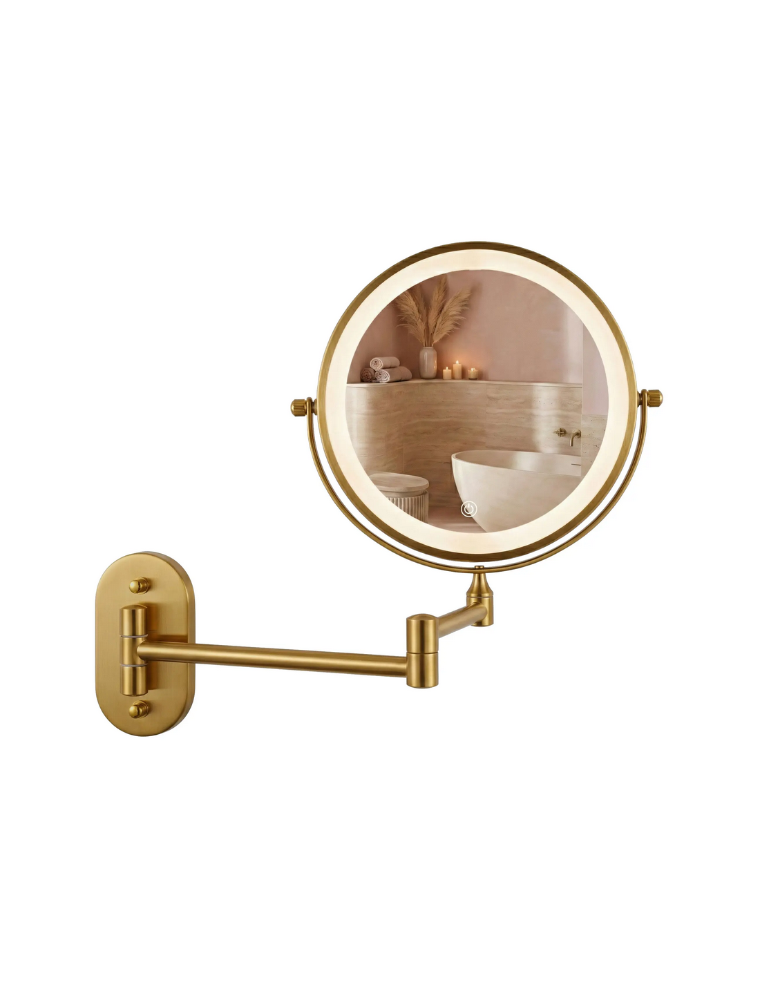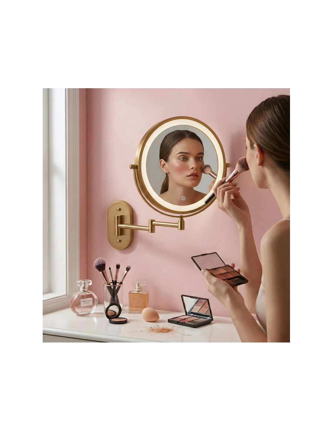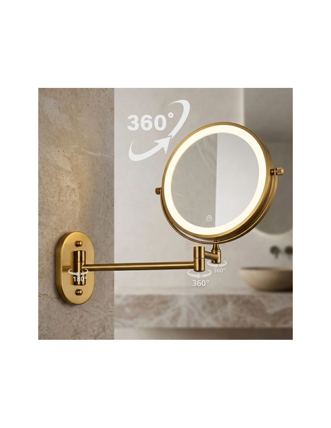 Kosmetikspejl med LED belysning, der er justerbart fra kold hvid til varm hvid belysning. Spejlet har flere indstillinger og er trådløst. Spejlet oplades via medfølgende usb-c stik. Spejlet er fremstillet i et design af antik guldfarvet stål og klart glas og er dobbeltsidet med 3 x forstørrelse. Juster lysstyrken via touch på spejlet.