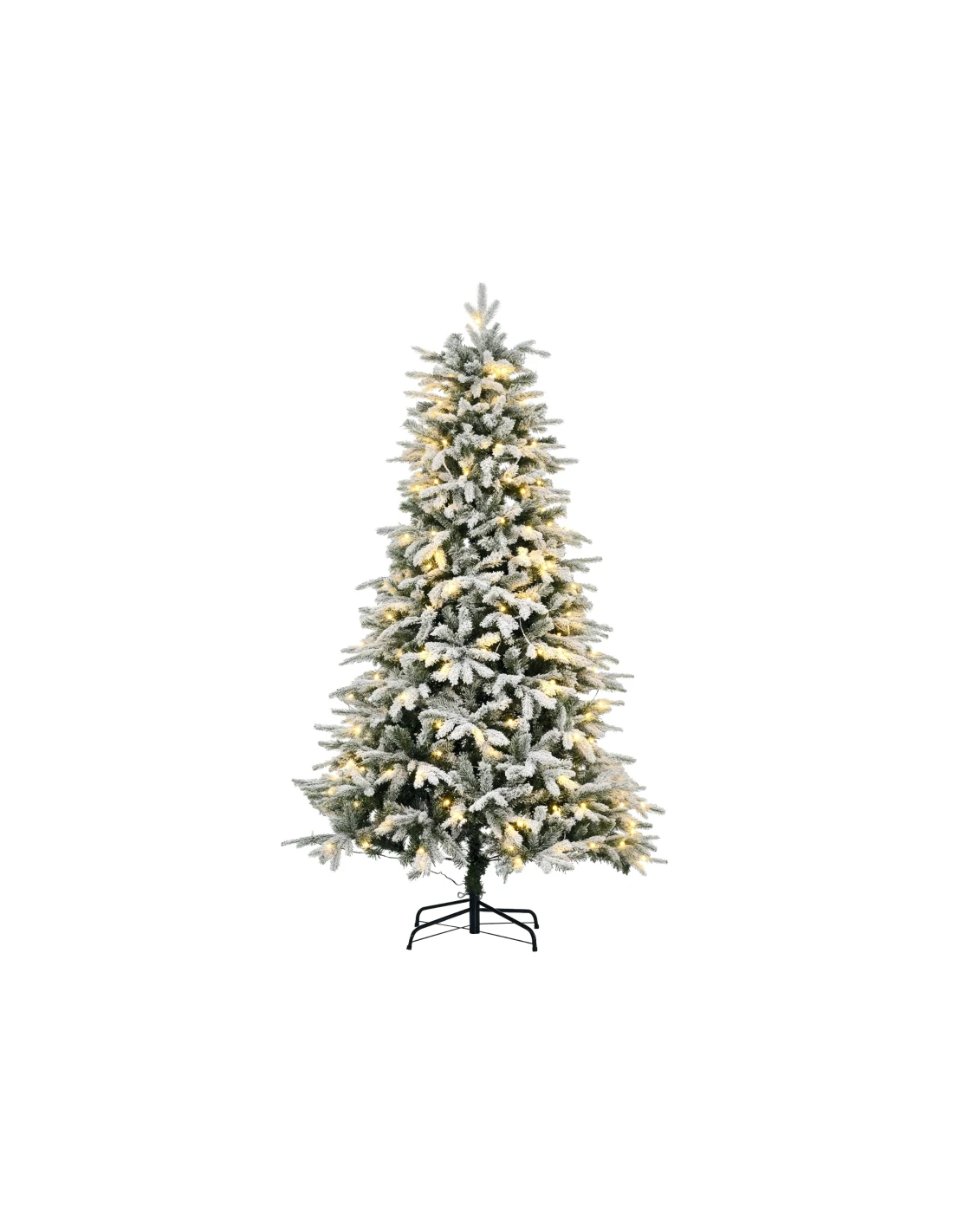 Kunstigt juletræ med naturtro grene, sne og led lys. Træet måler cirka 180 cm i højden og 105 cm i diameter og kommer med fod.