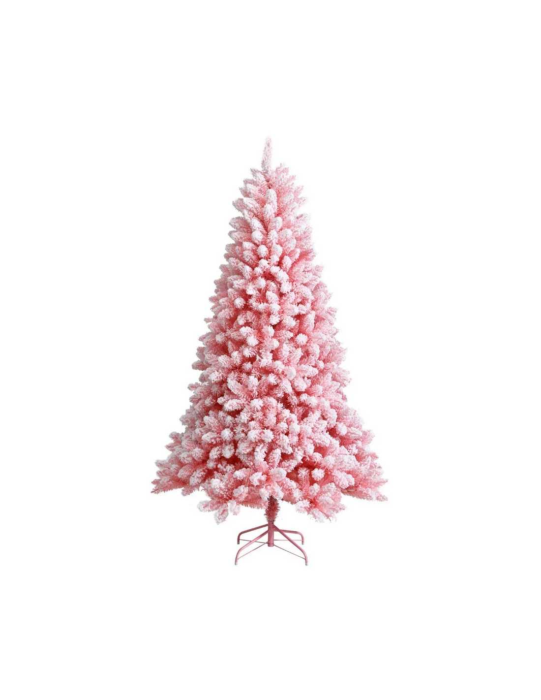 Kunstigt juletræ med pink grene med sne. Træet måler cirka 180 cm i højden og 115 cm i diameter og kommer med fod.