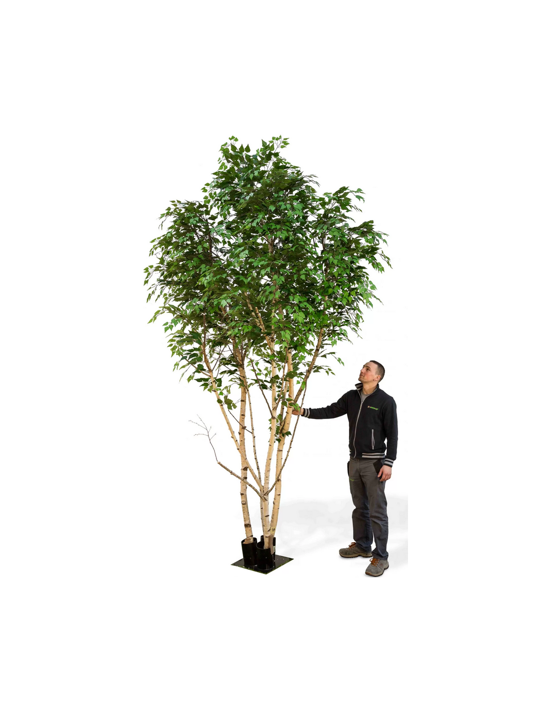 Stort kunstigt Ficus træ udført i et naturtro design, fremstillet i Europa. Træet måler 350 cm i højden og har mange blade og en naturtro stamme.