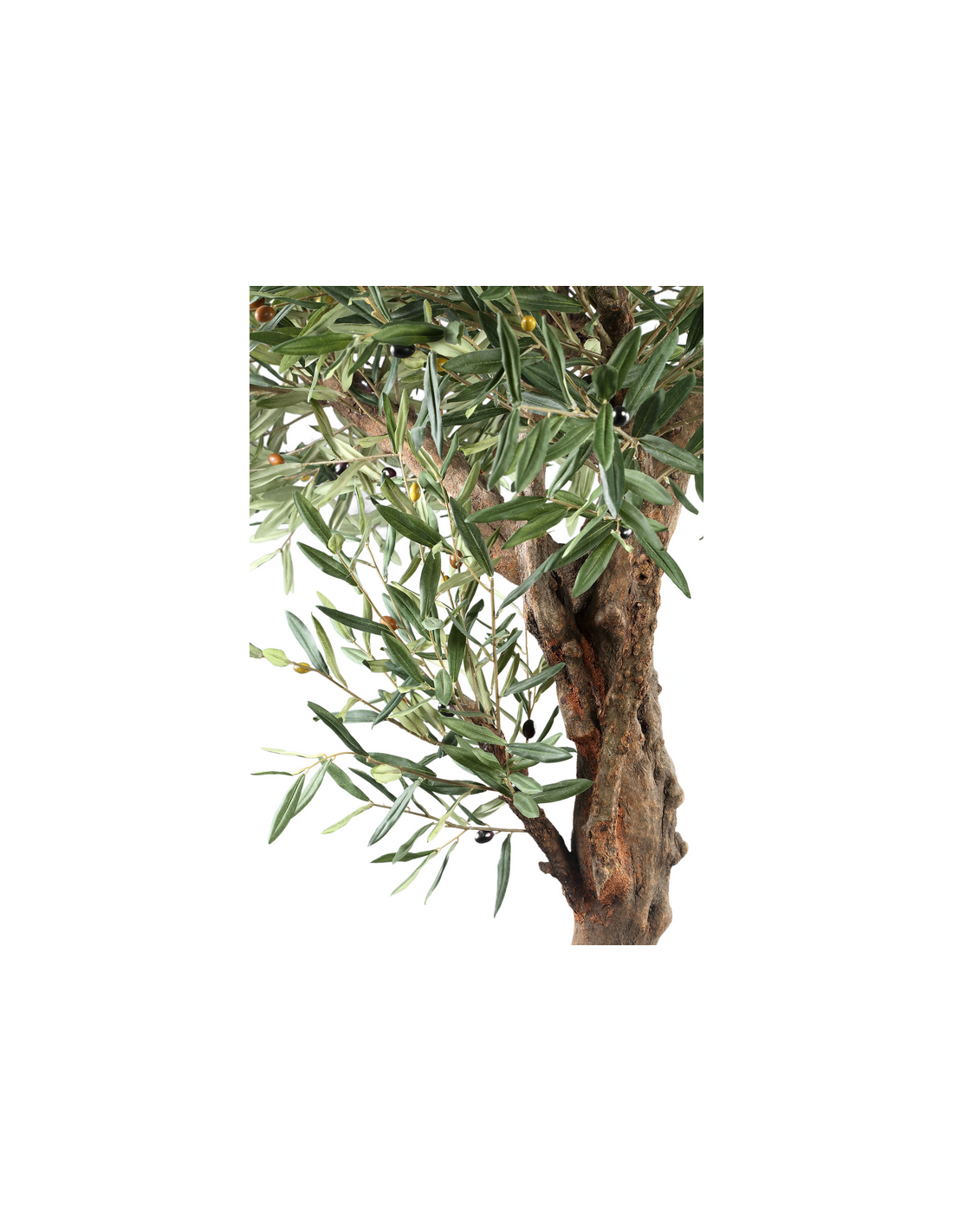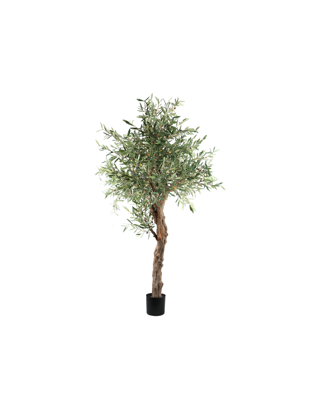 Stort kunstigt oliventræ med højde på cirka 210 cm og diameter på cirka 120 cm. Træet kommer med potte i sort plast.