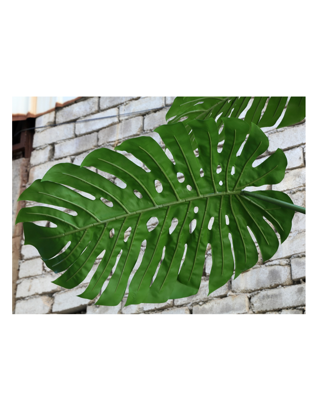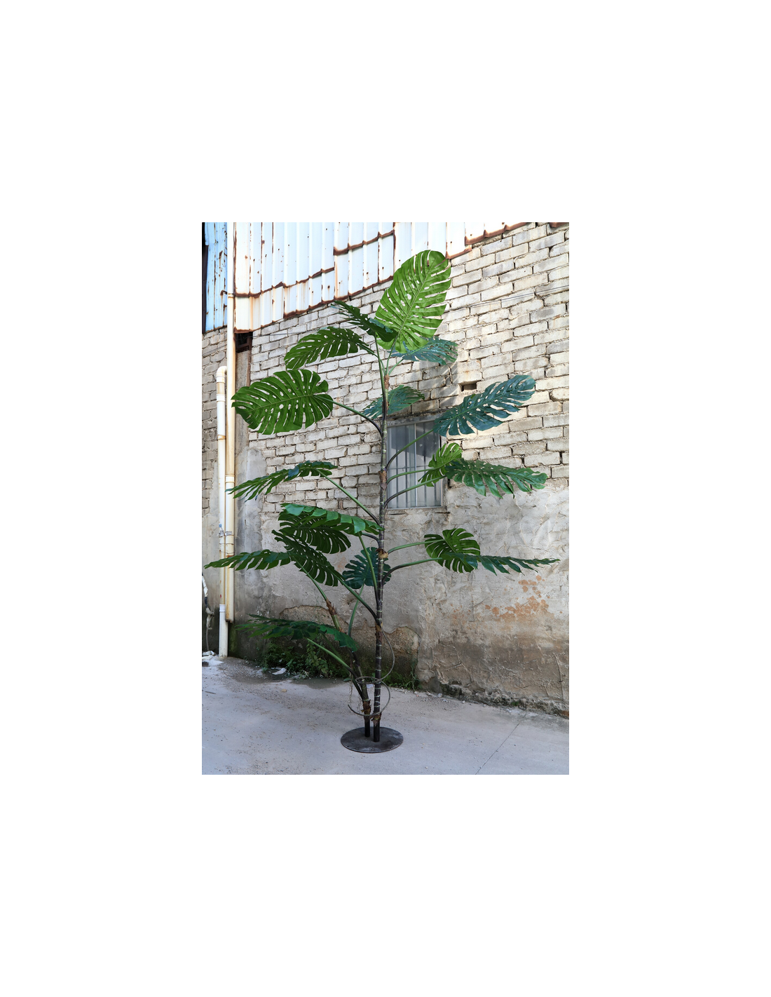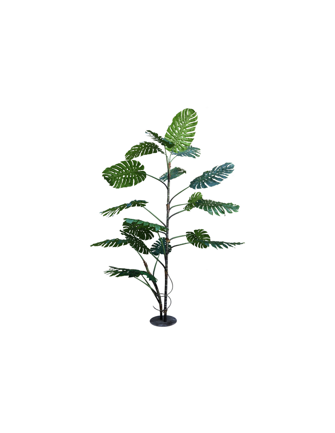 Stort kunstigt Monstera træ med højde på cirka 420 cm og diameter på cirka 165 cm. Træet kommer med fod i metal.