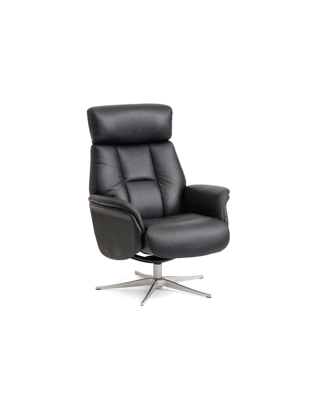 Marcy lænestol med vippefunktion og drejefod. Stolen er fremstillet i sort læder på frontflader og sort PVC på bagside og fod i børstet alugrå lakeret metal. Stolen måler 104 cm i højden over ryggen og med siddehøjde på 46 cm.