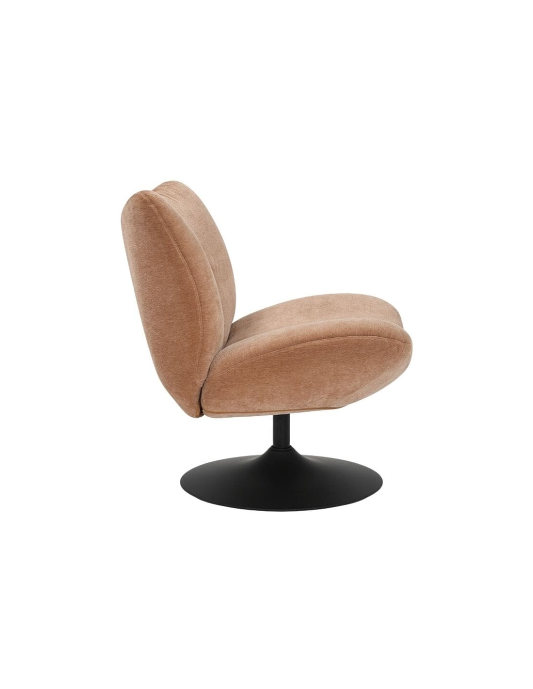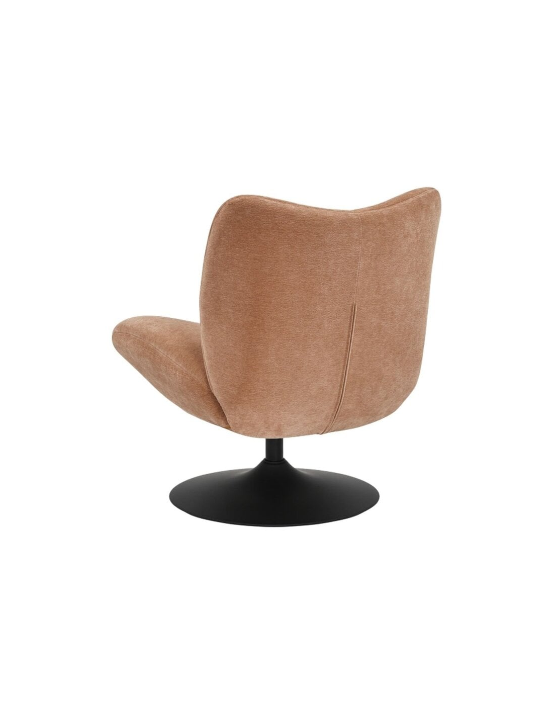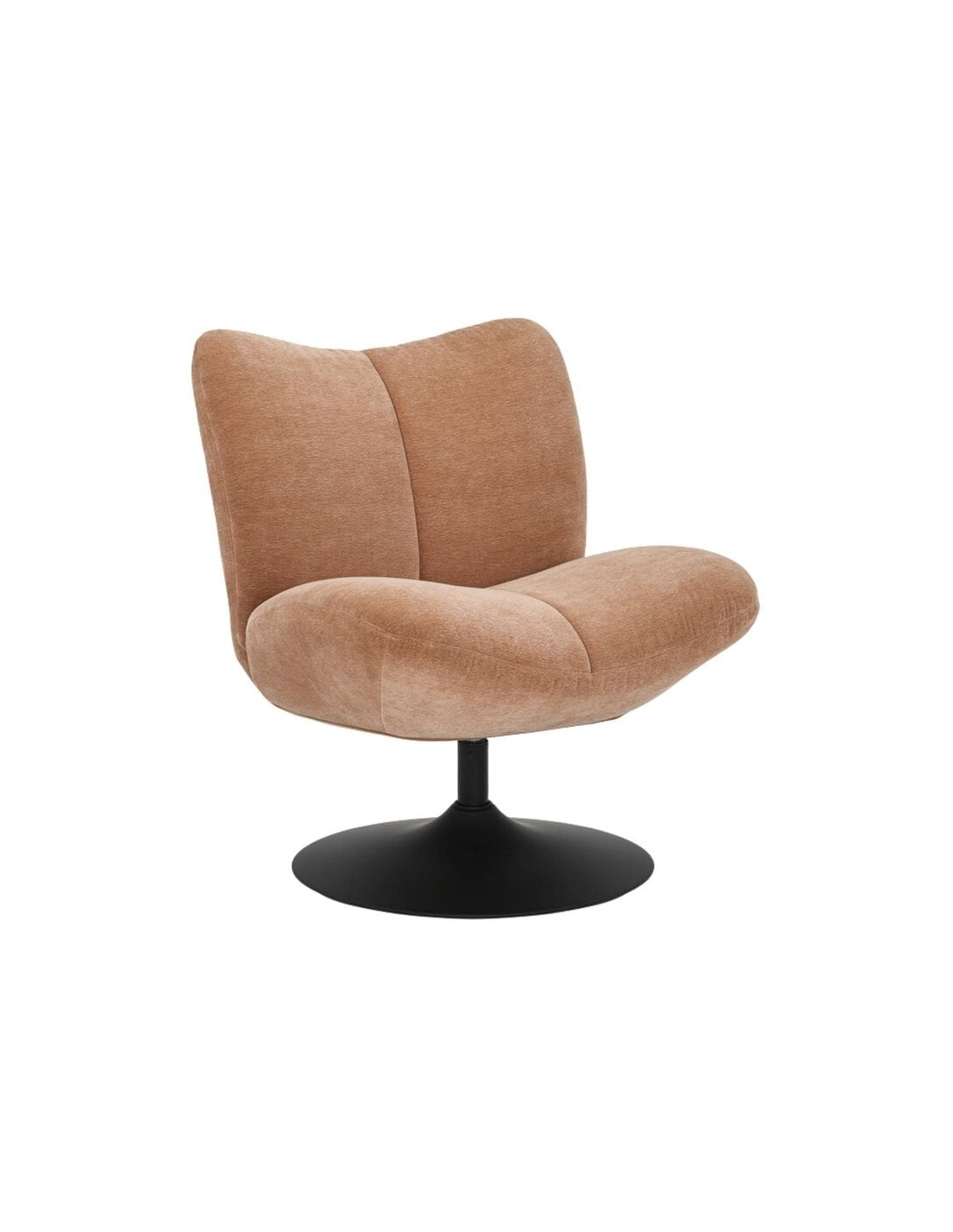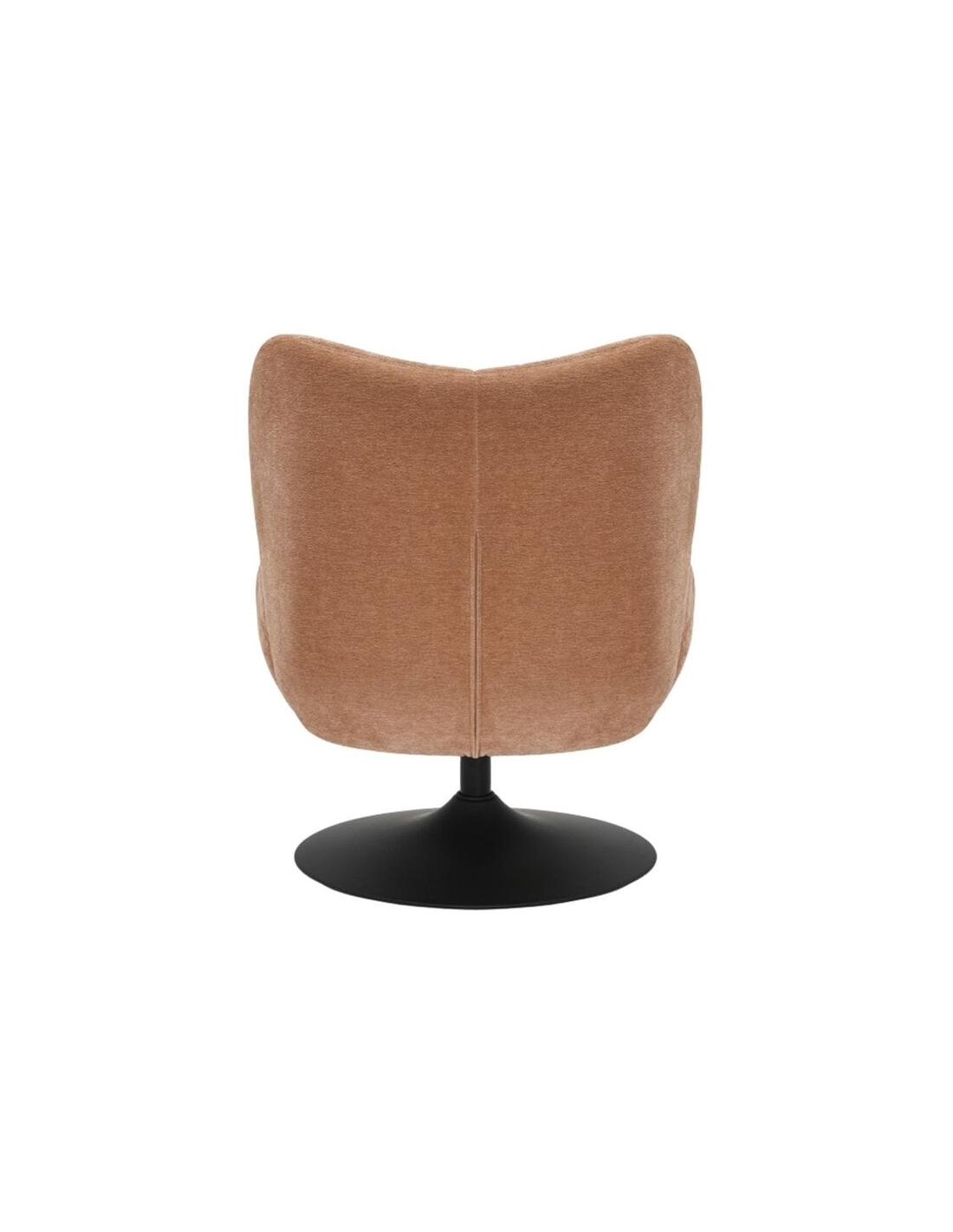 LISE Loungestol med drejefod, udført i et design af sortlakeret metal og terracottafarvet chenille polyester. Stolen måler 83 cm i højden over ryggen og 69 x 76,5 cm i bredde og dybde. Siddehøjden er 43 cm.