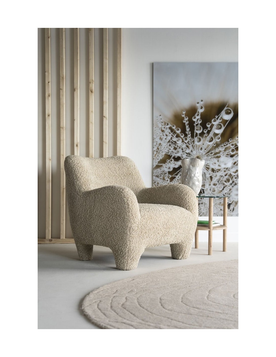 Lænestol fremstillet i et moderne design af taupefarvet polyester teddy plys. En lænestol der vil passe ind i både den moderne, såvel som i den klassiske indretning. Stolen måler 81 cm over ryggen og 87 x 86 cm i bredde og dybde.