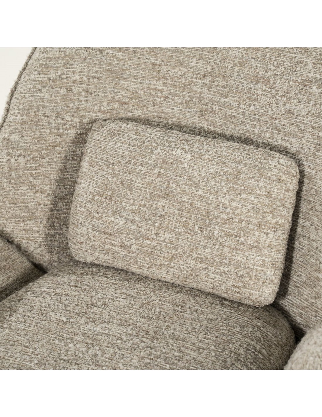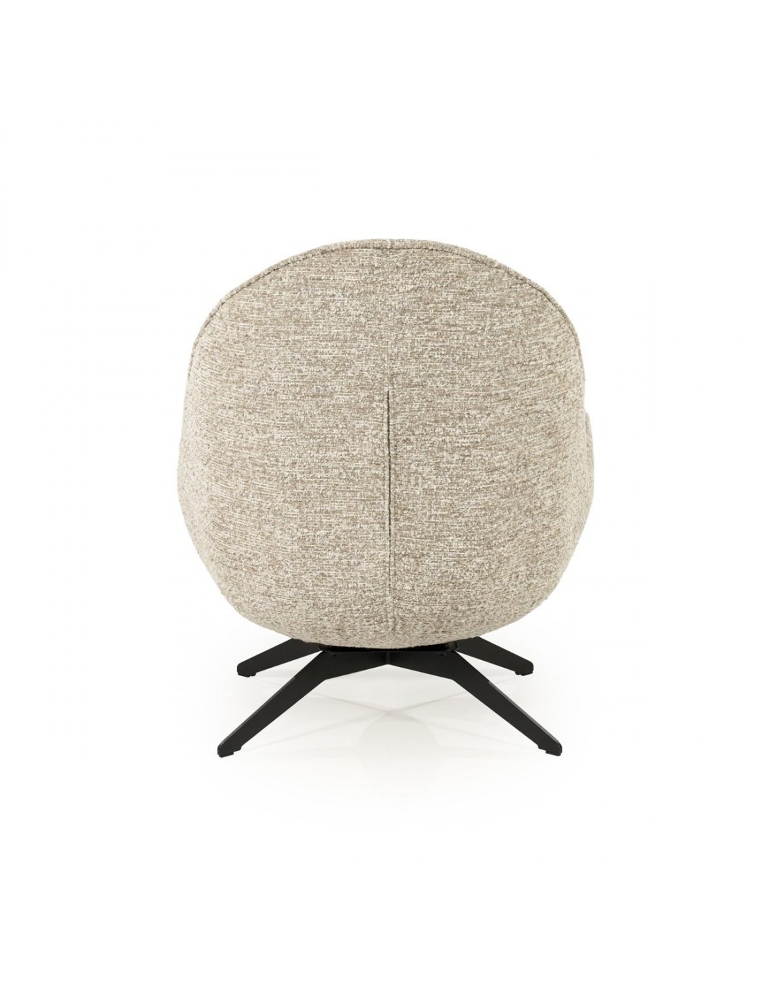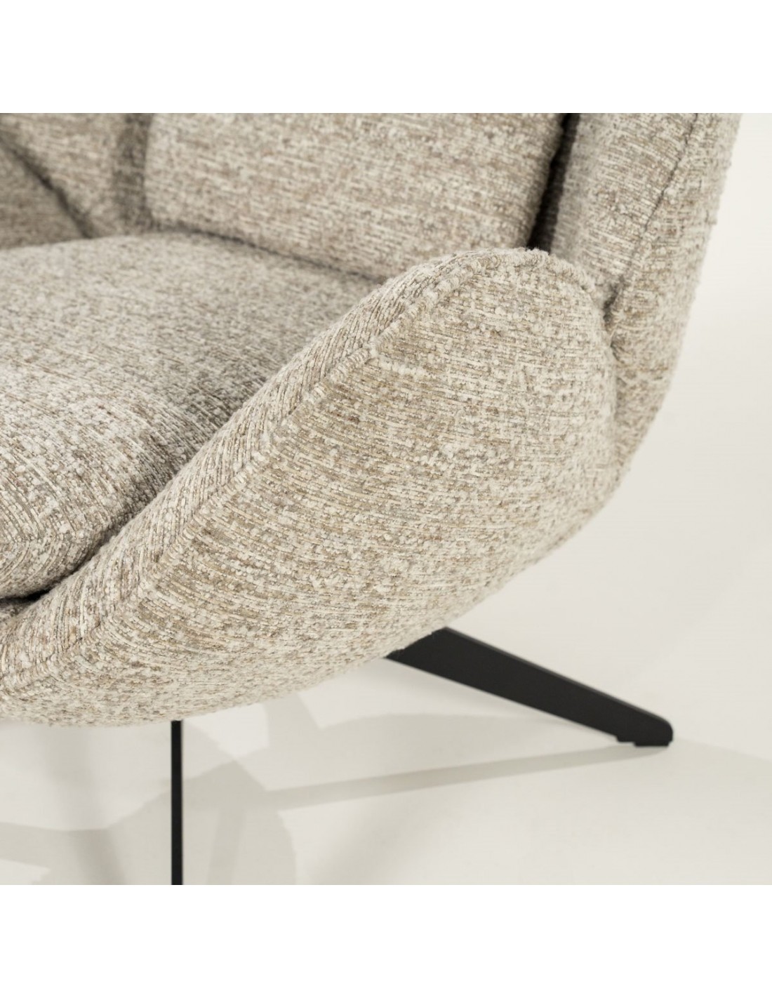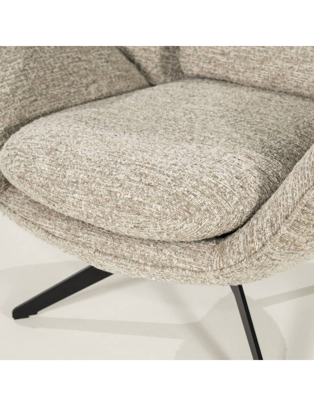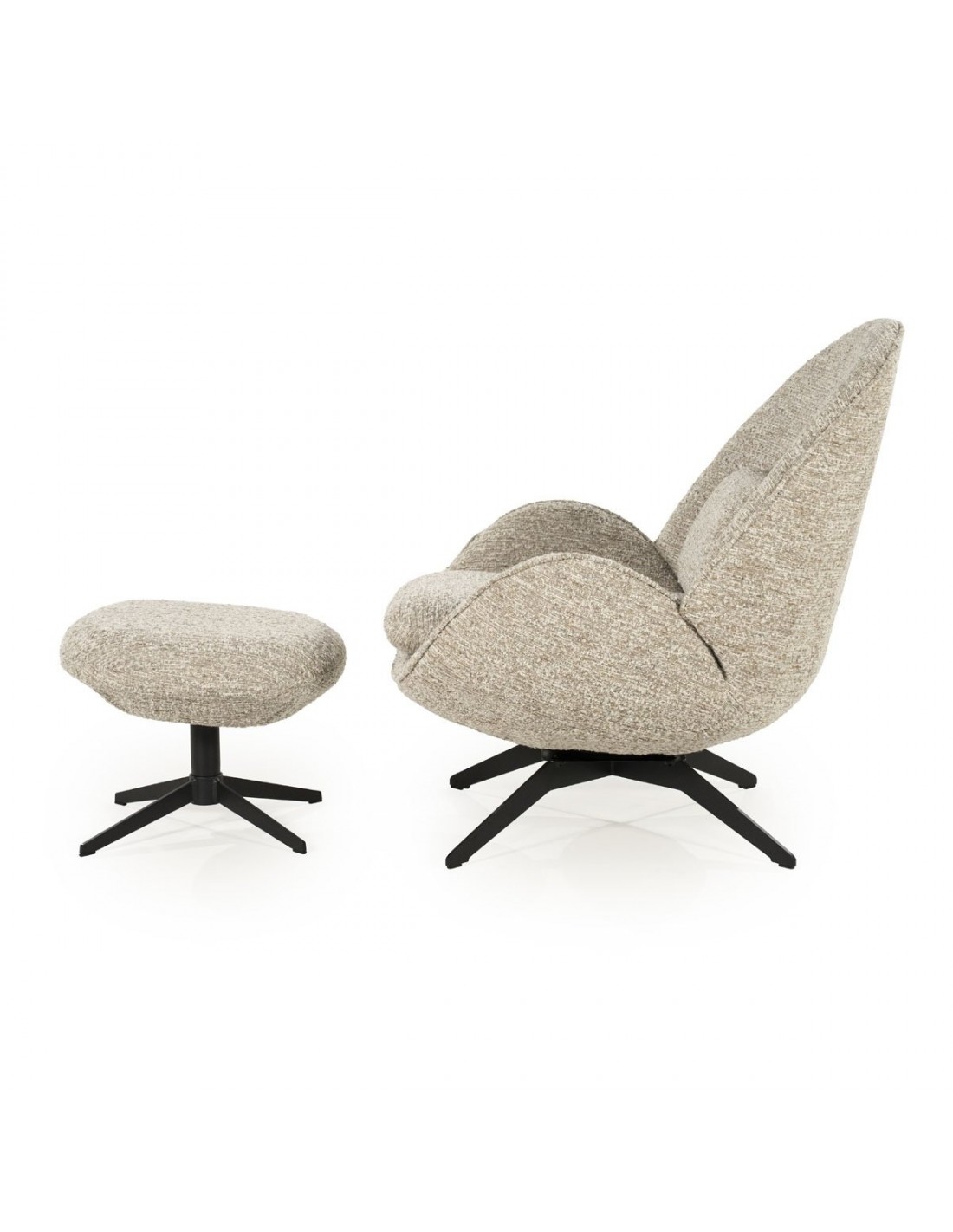 RYAN Lænestol med drejefod og skammel, fremstillet i et moderne design af sortlakeret metal og taupefarvet bouclé polyester. En lænestol der vil passe ind i både den moderne, såvel som i den klassiske indretning. Stolen måler 86 cm over ryggen og 76 x 87 cm i bredde og dybde.
