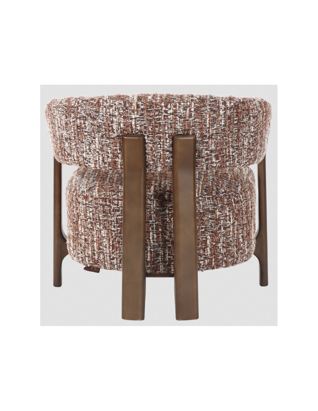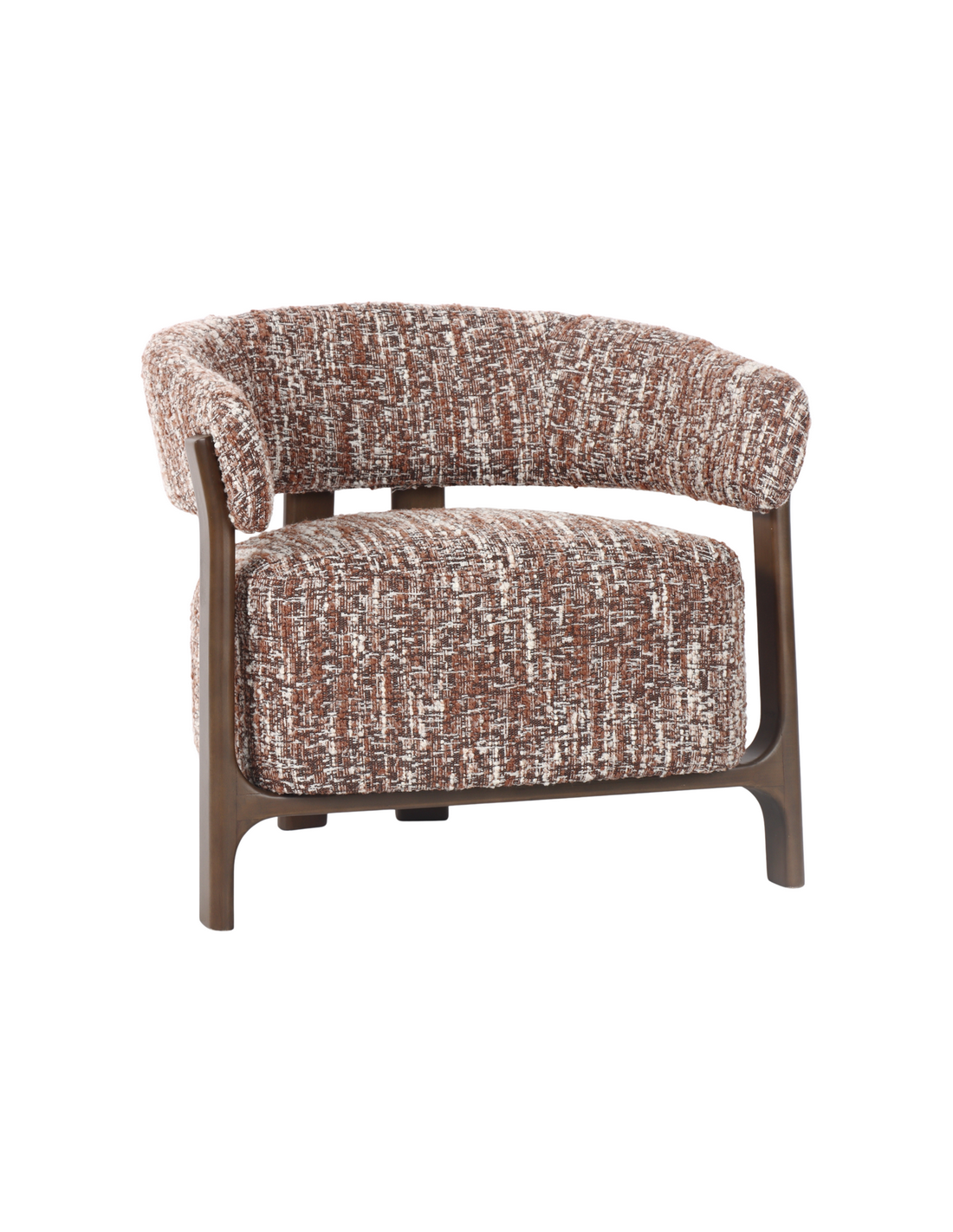 DALARA Lænestol udført i et design fra hollandske Richmond Interiors i brunlakeret bøgetræ og meleret hasselnøddebrun bouclé polyester. Lænestolen måler 73 cm i højden over ryggen og 69 x 67,5 cm i bredde og dybde. Siddehøjden er 44 cm.