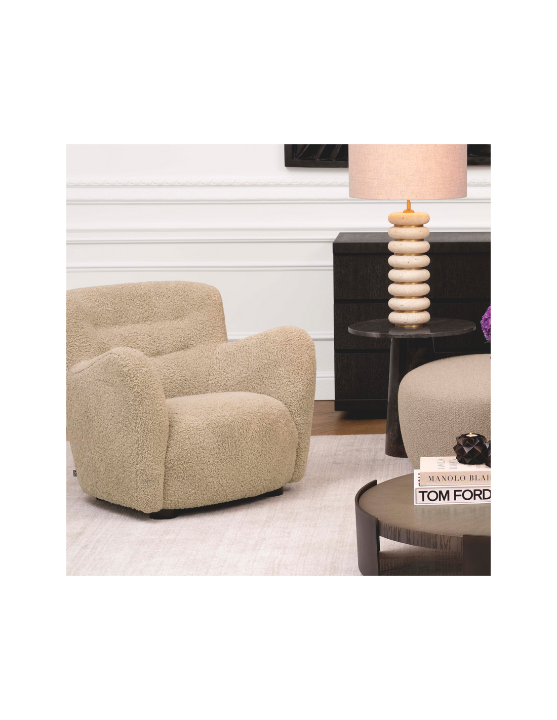 Eichholtz Bixby lænestol fremstillet i et moderne design af sortlakeret træ og sandfarvet teddy plys polyester. En komfortabel lænestol der vil passe ind i både den moderne, såvel som i den klassiske indretning. Stolen måler 80 cm over ryggen og 87 x 86 cm i bredde og dybde.