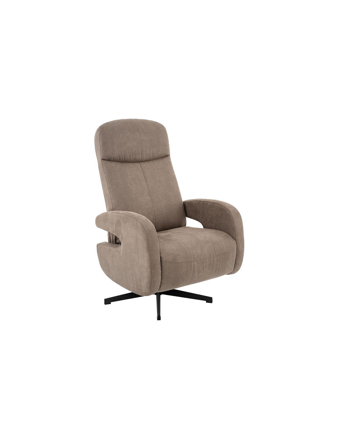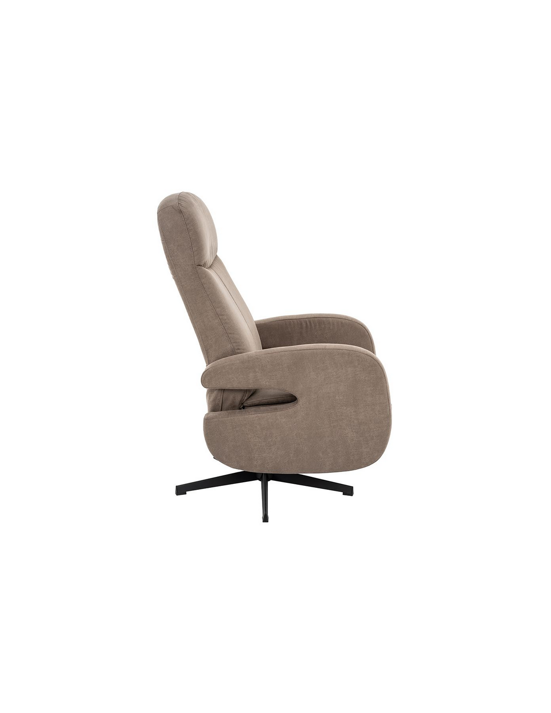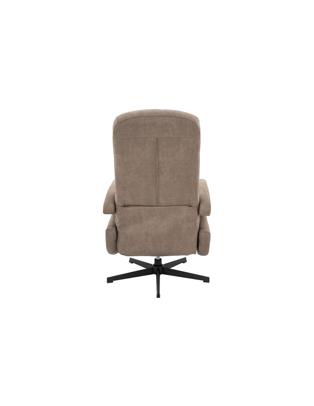ESBJERG Lænestol med indbygget fodskammel og drejefod, udført i et design fremstillet i sortlakeret metal og taupefarvet microfiber med ruskindslook. Stolen måler 114 cm i højden over ryggen og med siddehøjde på 49 cm. Stolens ryg og fodskammel reguleres ved skub mod ryglænet (fodskammel og ryglæn fungerer samtidigt).