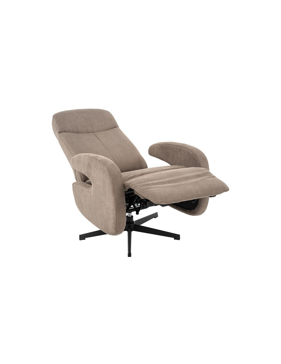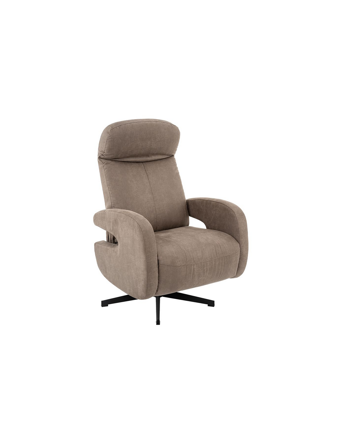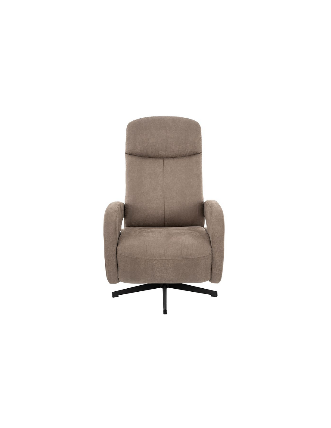 ESBJERG Lænestol med indbygget fodskammel og drejefod, udført i et design fremstillet i sortlakeret metal og taupefarvet microfiber med ruskindslook. Stolen måler 114 cm i højden over ryggen og med siddehøjde på 49 cm. Stolens ryg og fodskammel reguleres ved skub mod ryglænet (fodskammel og ryglæn fungerer samtidigt).