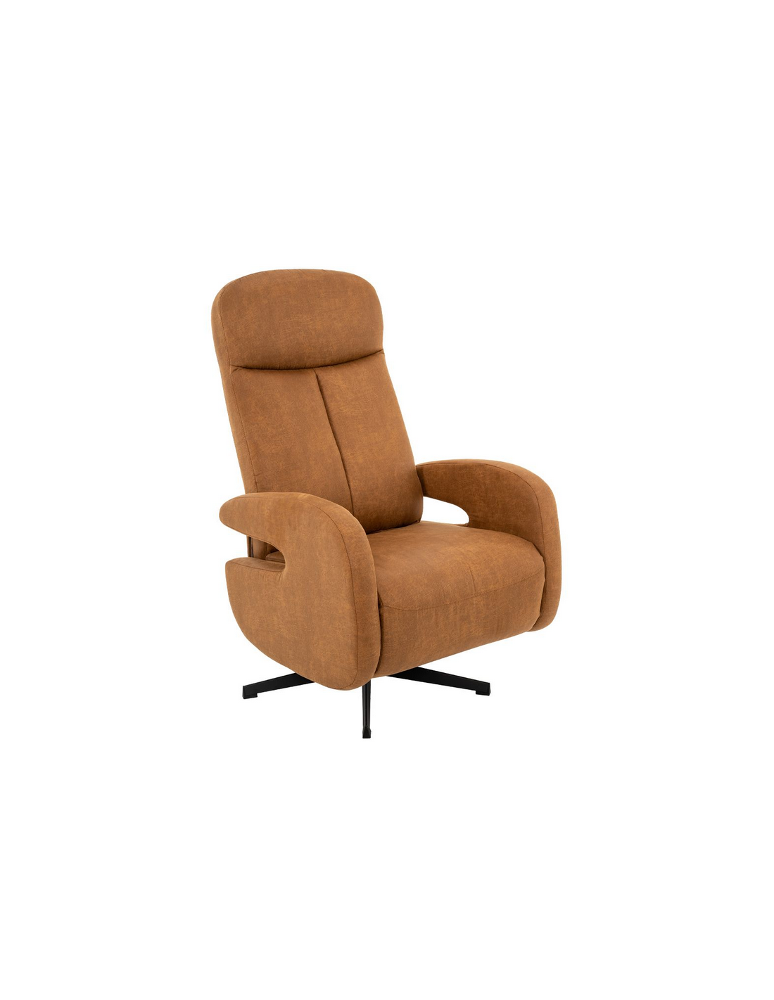 ESBJERG Lænestol med indbygget fodskammel og drejefod, udført i et design fremstillet i sortlakeret metal og cognacfarvet microfiber med ruskindslook. Stolen måler 114 cm i højden over ryggen og med siddehøjde på 49 cm. Stolens ryg og fodskammel reguleres ved skub mod ryglænet (fodskammel og ryglæn fungerer samtidigt).