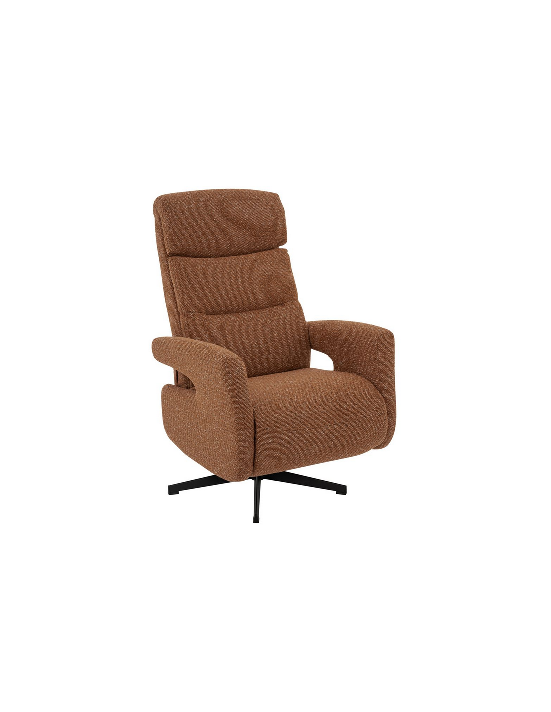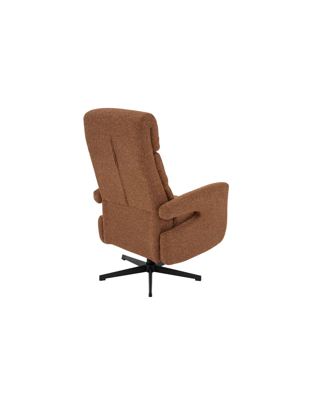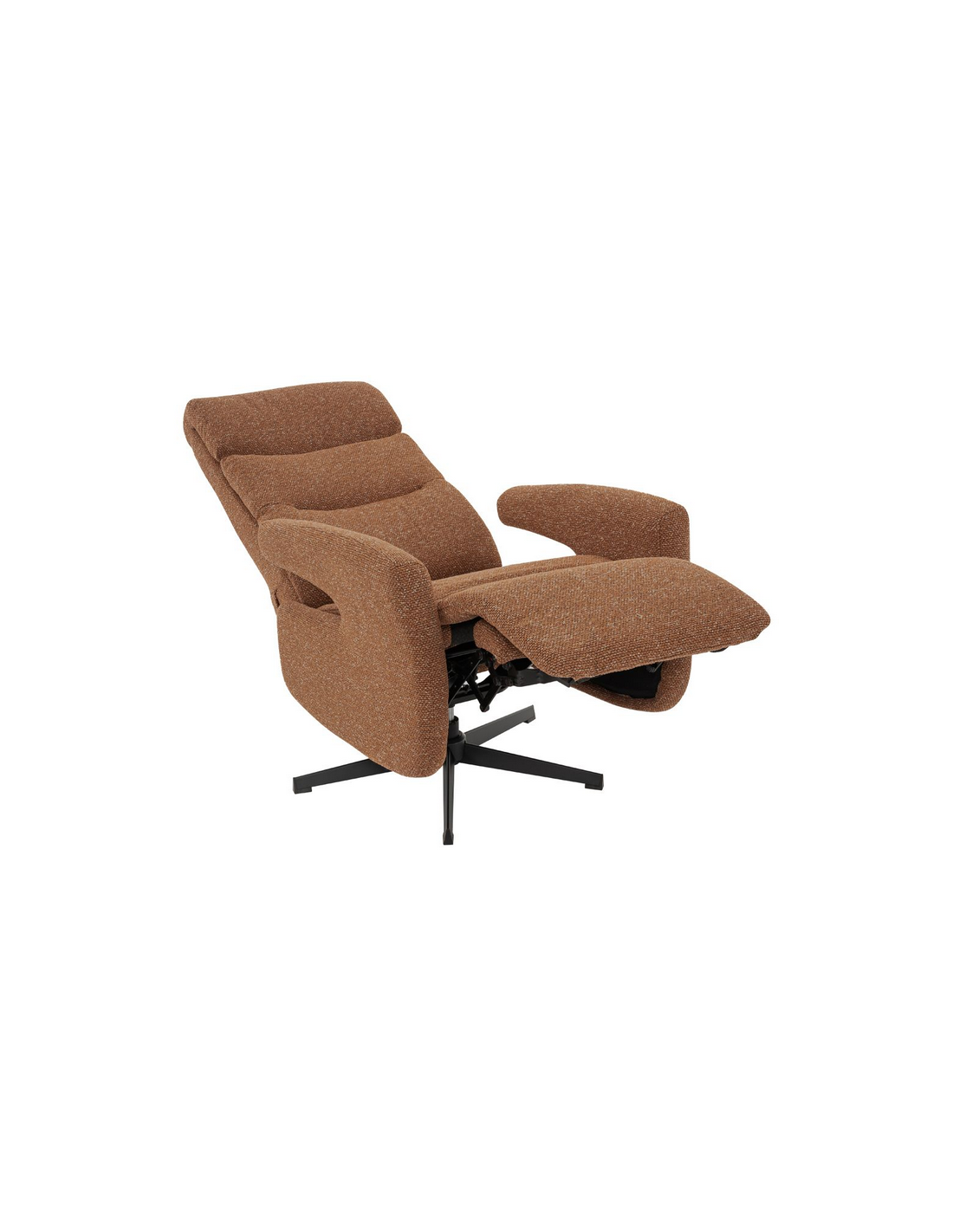 COPENHAGEN Lænestol med indbygget fodskammel og drejefod, udført i et design fremstillet i sortlakeret metal og koralrød bouclé stof. Stolen måler 115 cm i højden over ryggen og med siddehøjde på 47 cm. Stolens ryg og fodskammel reguleres ved skub mod ryglænet (fodskammel og ryglæn fungerer samtidigt).