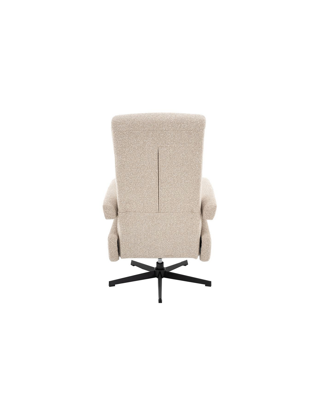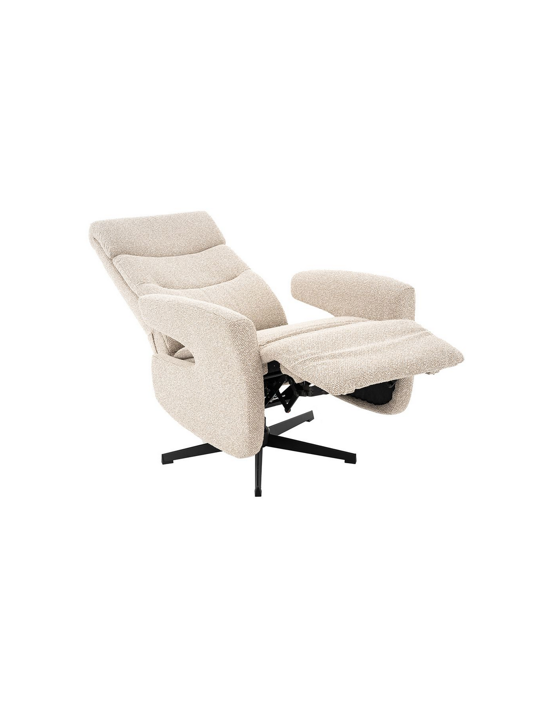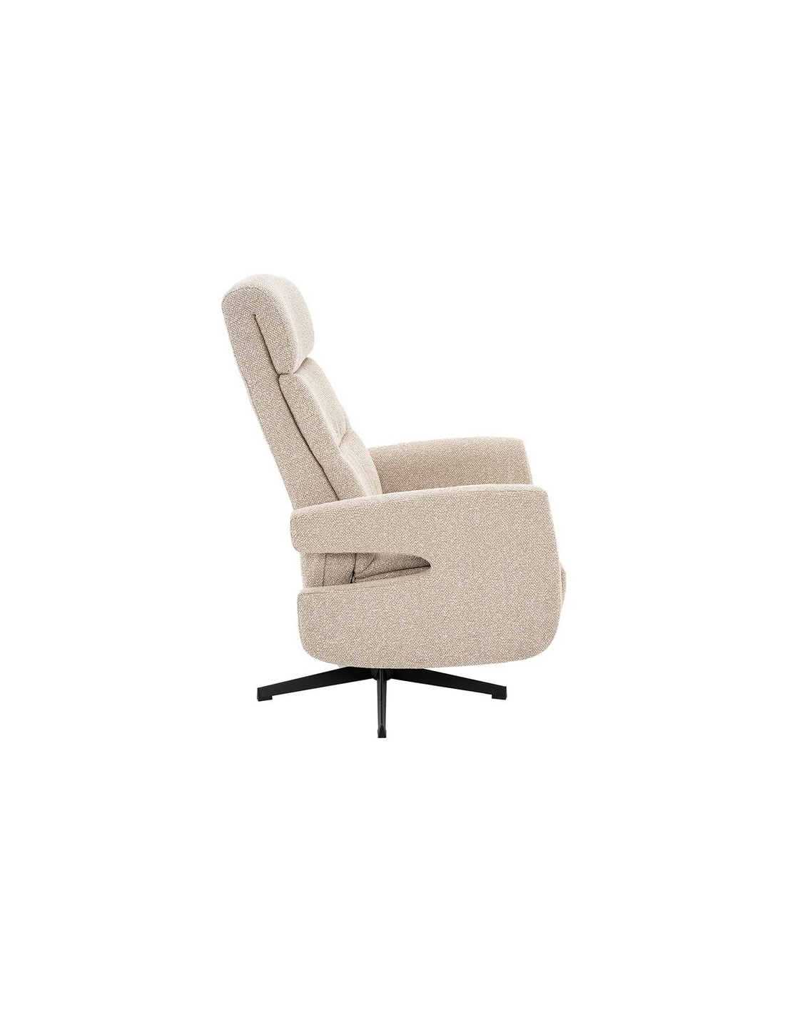 COPENHAGEN Lænestol med indbygget fodskammel og drejefod, udført i et design fremstillet i sortlakeret metal og naturfarvet bouclé stof. Stolen måler 115 cm i højden over ryggen og med siddehøjde på 47 cm. Stolens ryg og fodskammel reguleres ved skub mod ryglænet (fodskammel og ryglæn fungerer samtidigt).