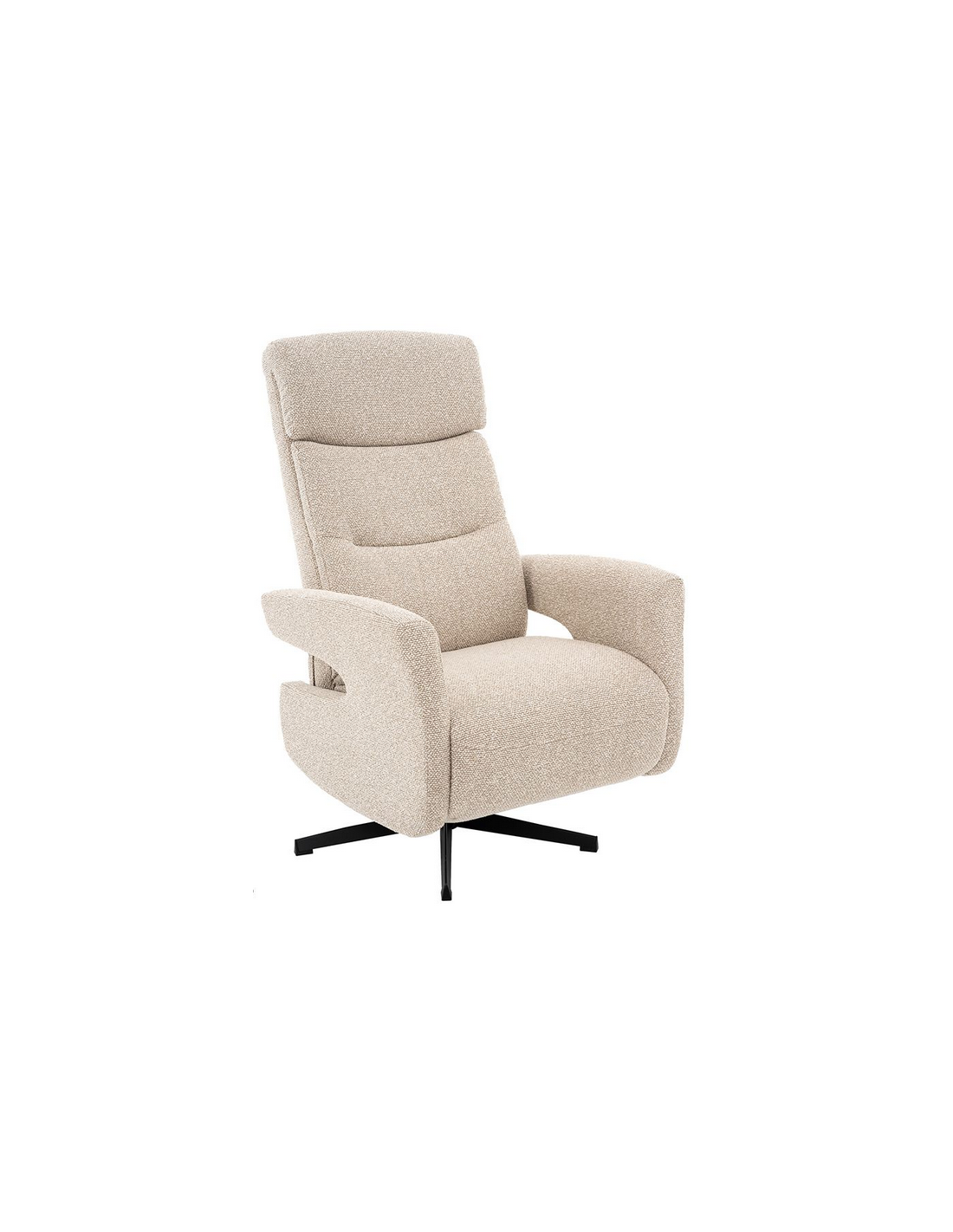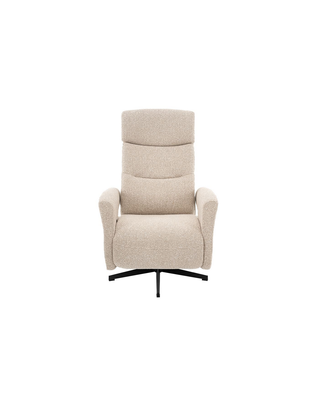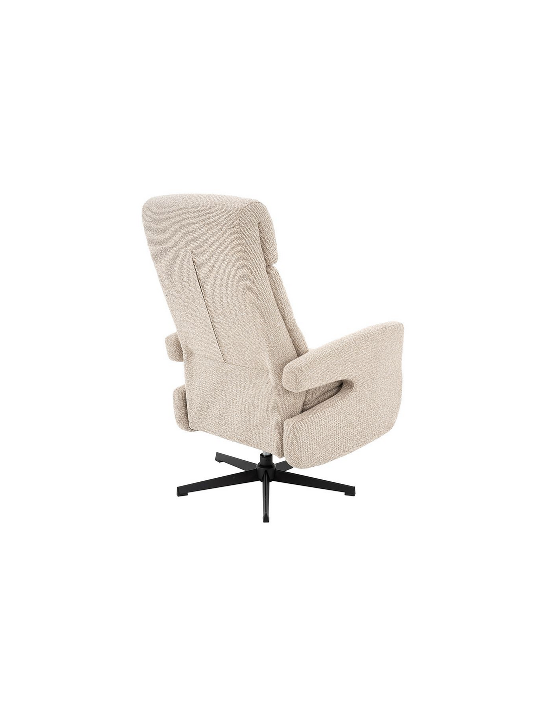 COPENHAGEN Lænestol med indbygget fodskammel og drejefod, udført i et design fremstillet i sortlakeret metal og naturfarvet bouclé stof. Stolen måler 115 cm i højden over ryggen og med siddehøjde på 47 cm. Stolens ryg og fodskammel reguleres ved skub mod ryglænet (fodskammel og ryglæn fungerer samtidigt).