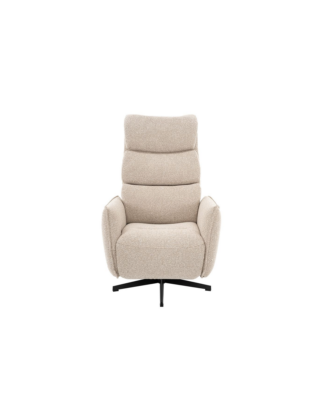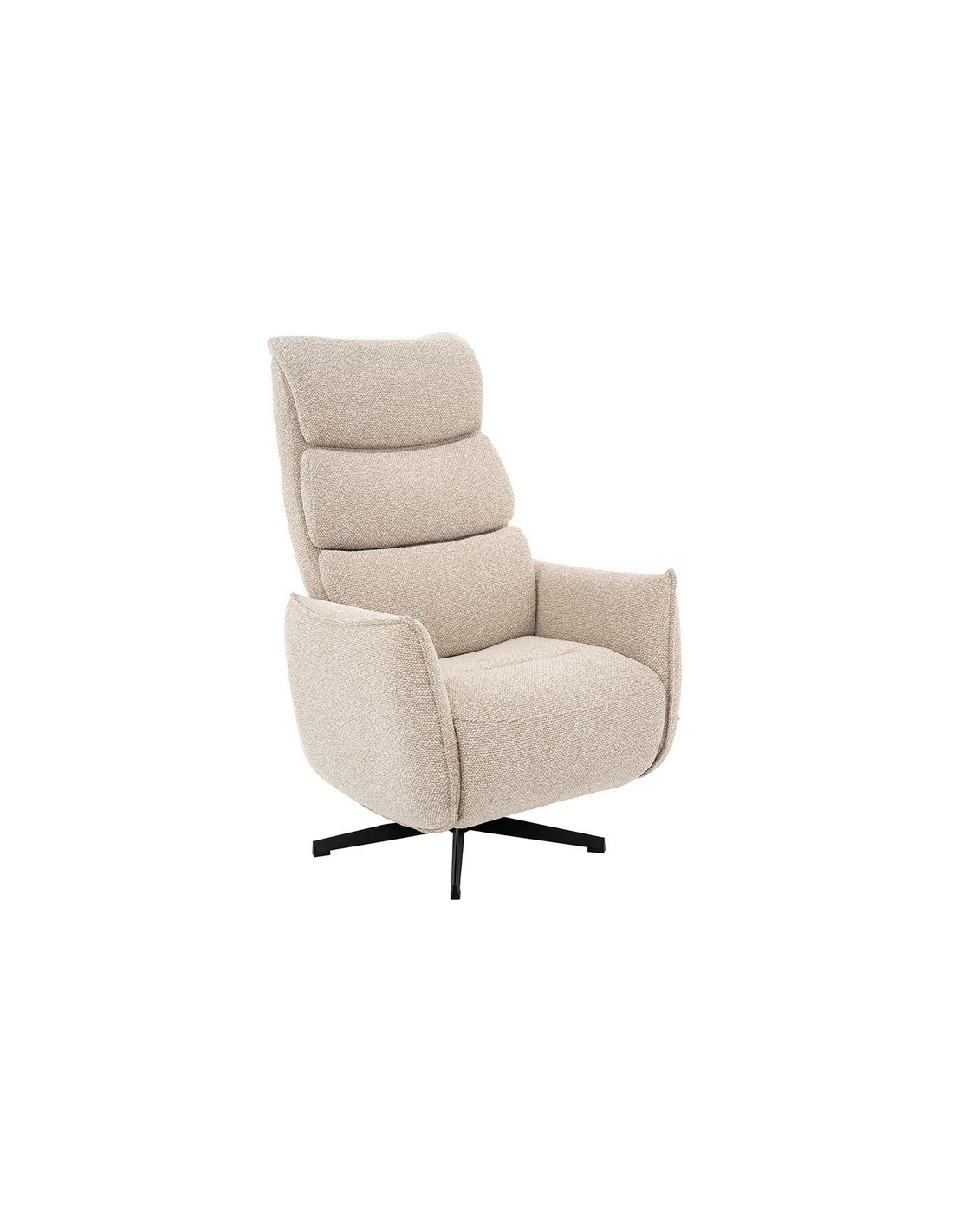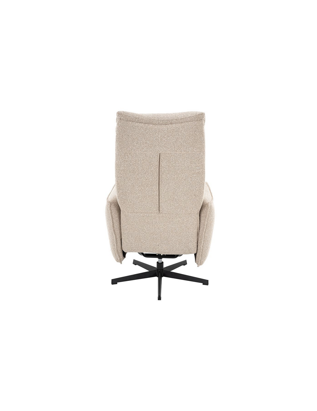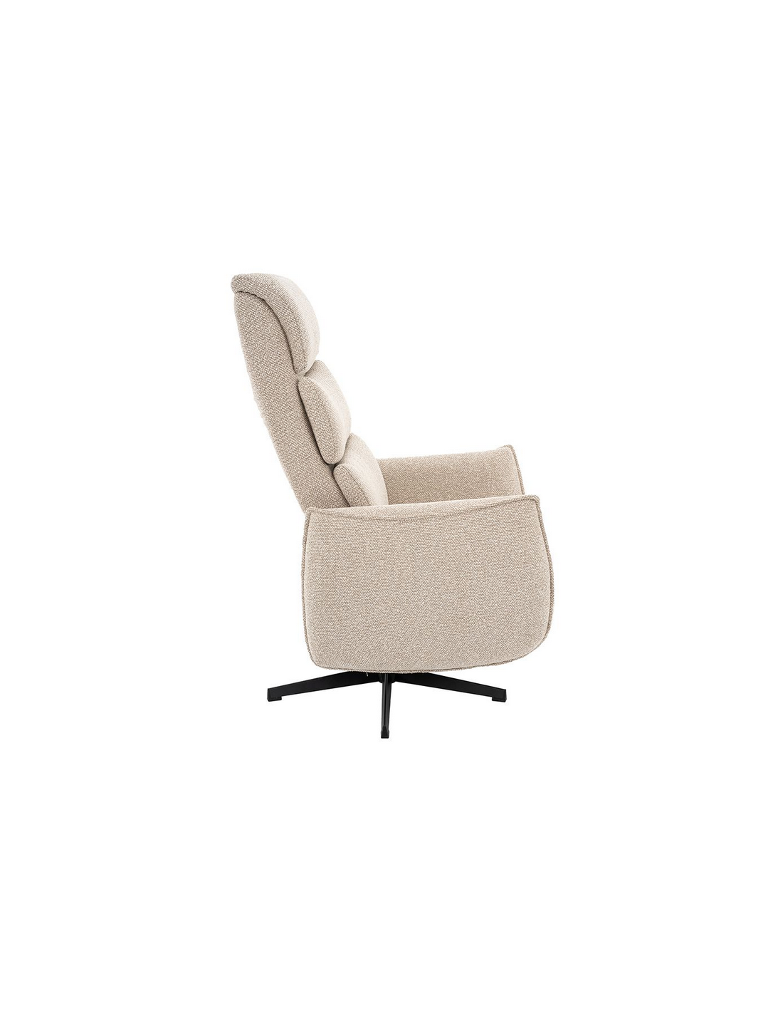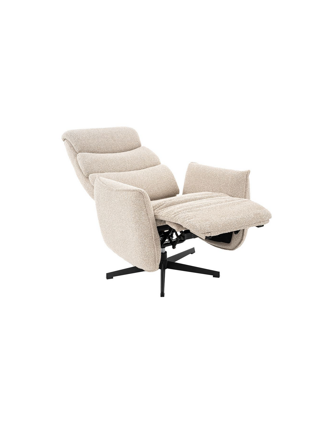 GOTEBORG Lænestol med elektrisk indbygget fodskammel, udført i et design fremstillet i sortlakeret metal og naturfarvet bouclé stof. Stolen måler 118 cm i højden over ryggen og med siddehøjde på 48 cm. Stolens ryg og fodskammel reguleres ved hjælp af betjening ved sædet.